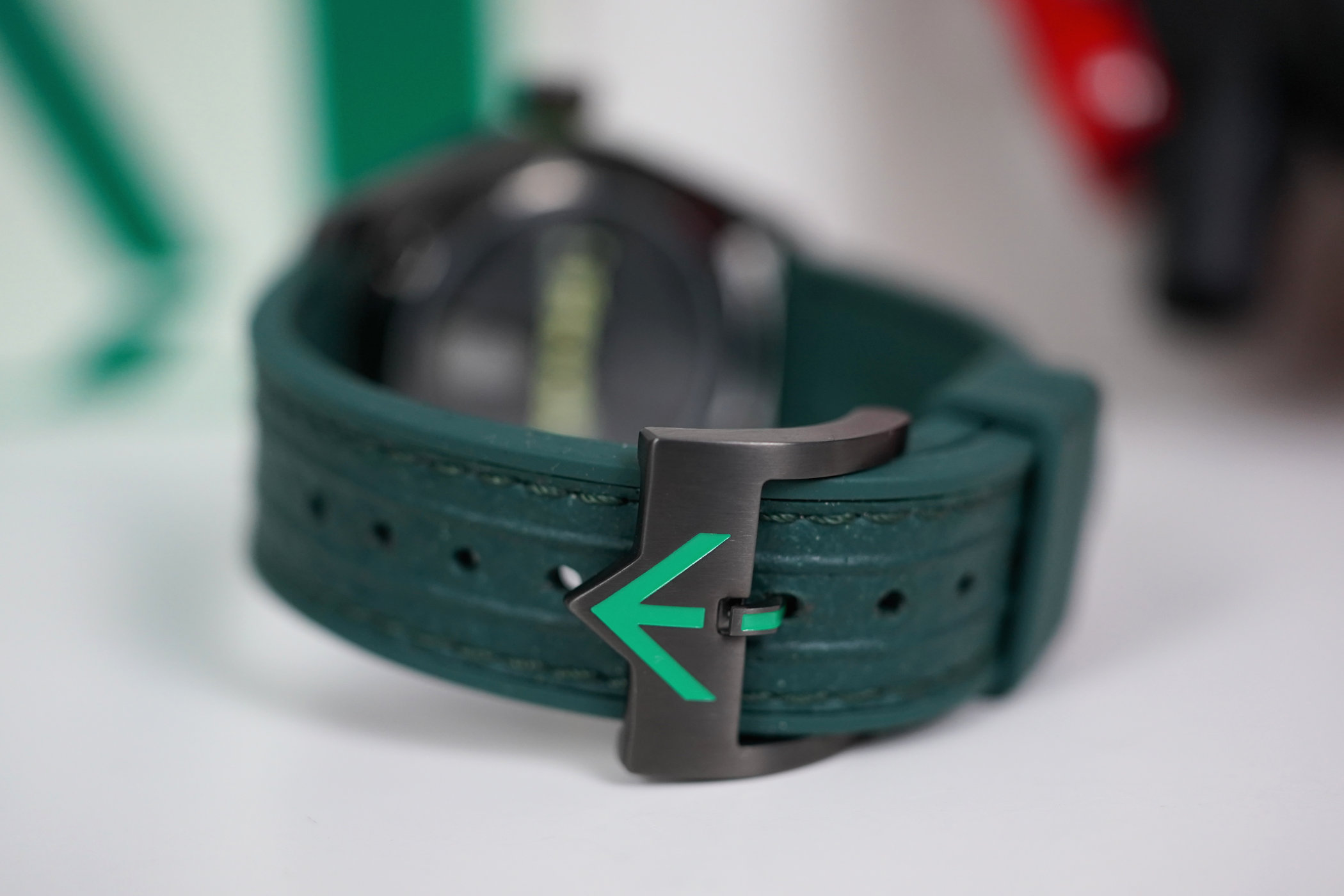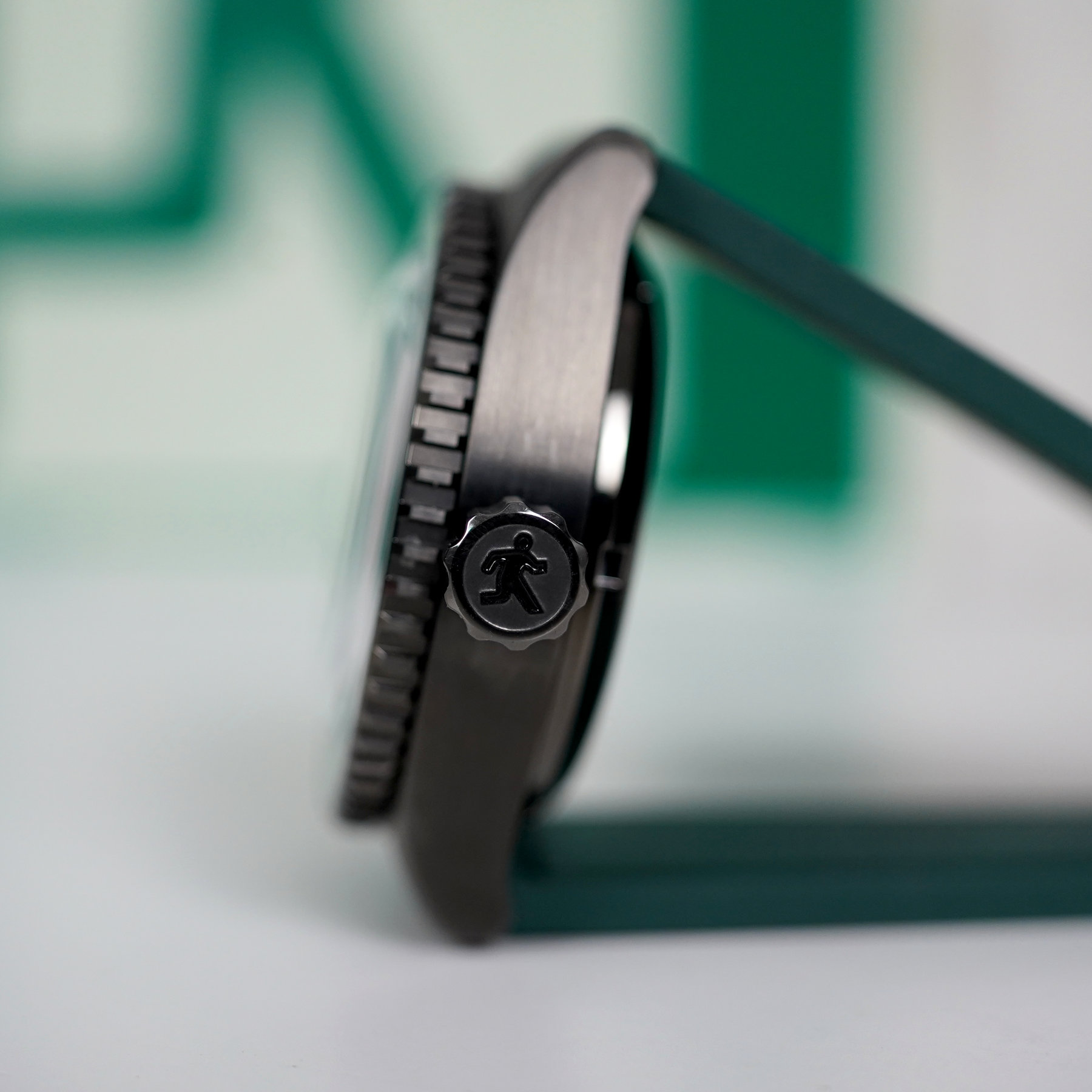 At the outer edge of the green glass dial, a gunmetal-coloured minute ring complements the case, providing a backdrop for the large, lume-filled fire exit arrow and baton indices. These indices, gently curved to align with the dial’s curvature, make a bold statement and harmonize with the watch’s overall design ethos, balancing fun elements with a sense of urgency. The prominent central hour and minute hands feature lume treatment, enhancing legibility in various conditions and ensuring clear time reading at all times. Additionally, the applied helmet logo has a luminous outline, adding a distinctive and functional touch to the dial.