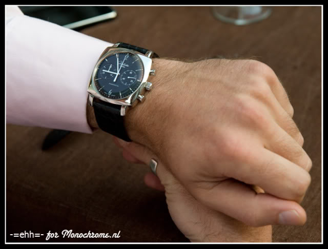 Quick Facts – 42mm x 15mm – stainless steel case, brushed and polished – box-shaped sapphire crystal – see-through caseback – oval-shaped pushers – 30m water-resistant – silver or black gilt dial – telemeter and tachymeter chronograph scales – sword-shaped hands – Calibre Valjoux A05.321 – automatic chronograph – 29 jewels – 28,800vph – 68h power reserve – hours, minutes, small seconds, chronograph with central seconds and 30-minute counter – dark brown or cognac leather strap with pin buckle – EUR 1,995