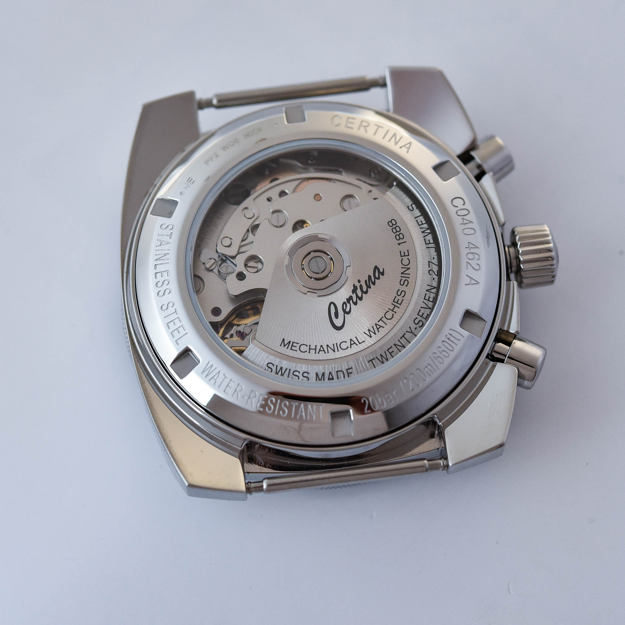 With a distinct 1960s design and a 43.5mm by 43.5mm cushion-shaped case, the Certina DS Chronograph Automatic 1968 is surely a chunky and funky piece. It takes after an original Certina chronograph from the late sixties, called the DS Argonaut. It comes in either black steel or with a black PVD coating. Both versions have their own dial, with either a black one with orange applied indices or a deep blue dial with white makers. The hour and minute hands are white, and all is finished with white Super-LumiNova. It uses Swatch Group’s ETA A05.H31, which is a substantially upgraded Valjoux 7750. The steel model comes on a black and silver NATO strap and costs CHF 1,930, while the black PVD coated model comes with a black leather strap and costs CHF 1,970.