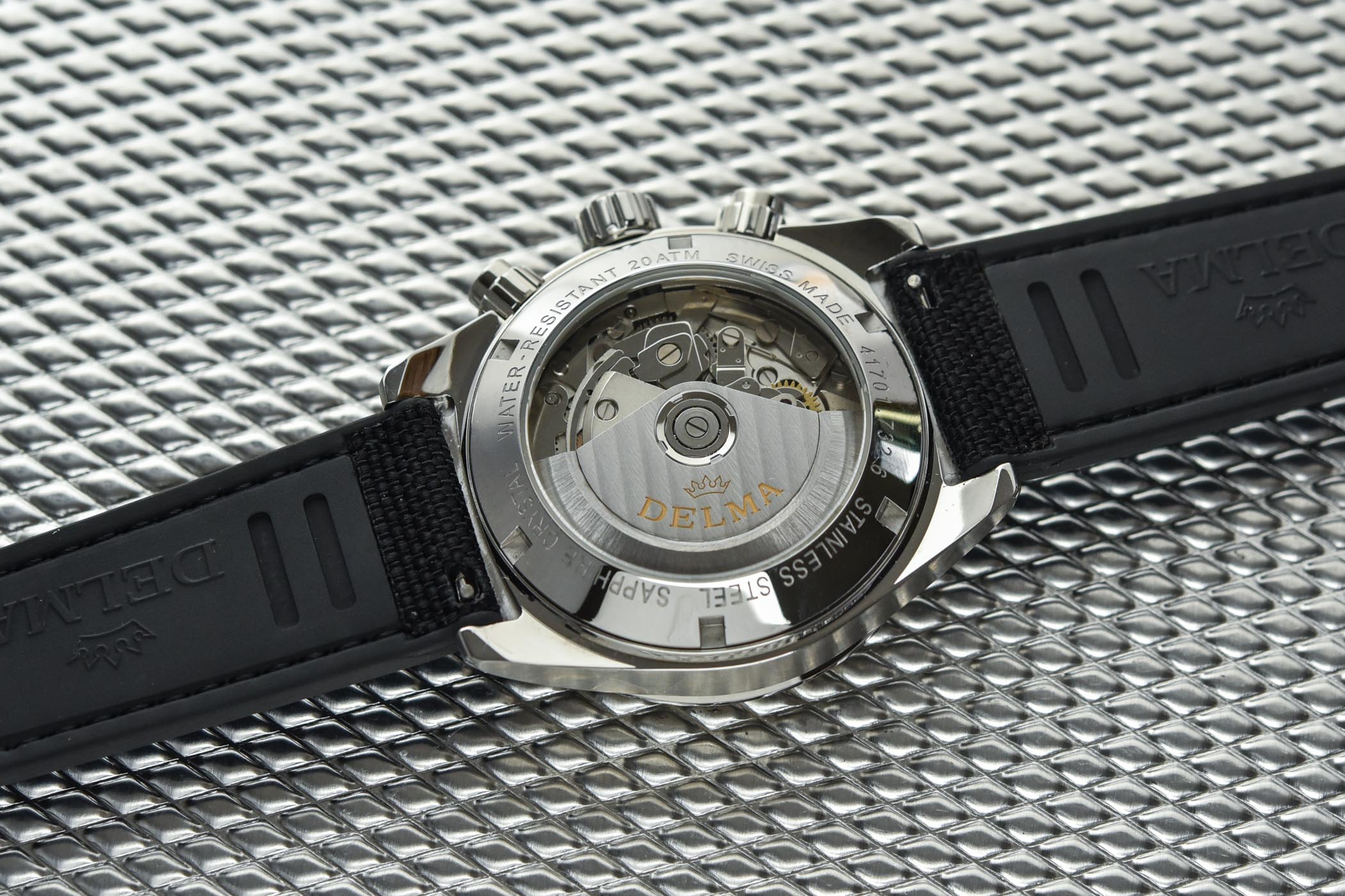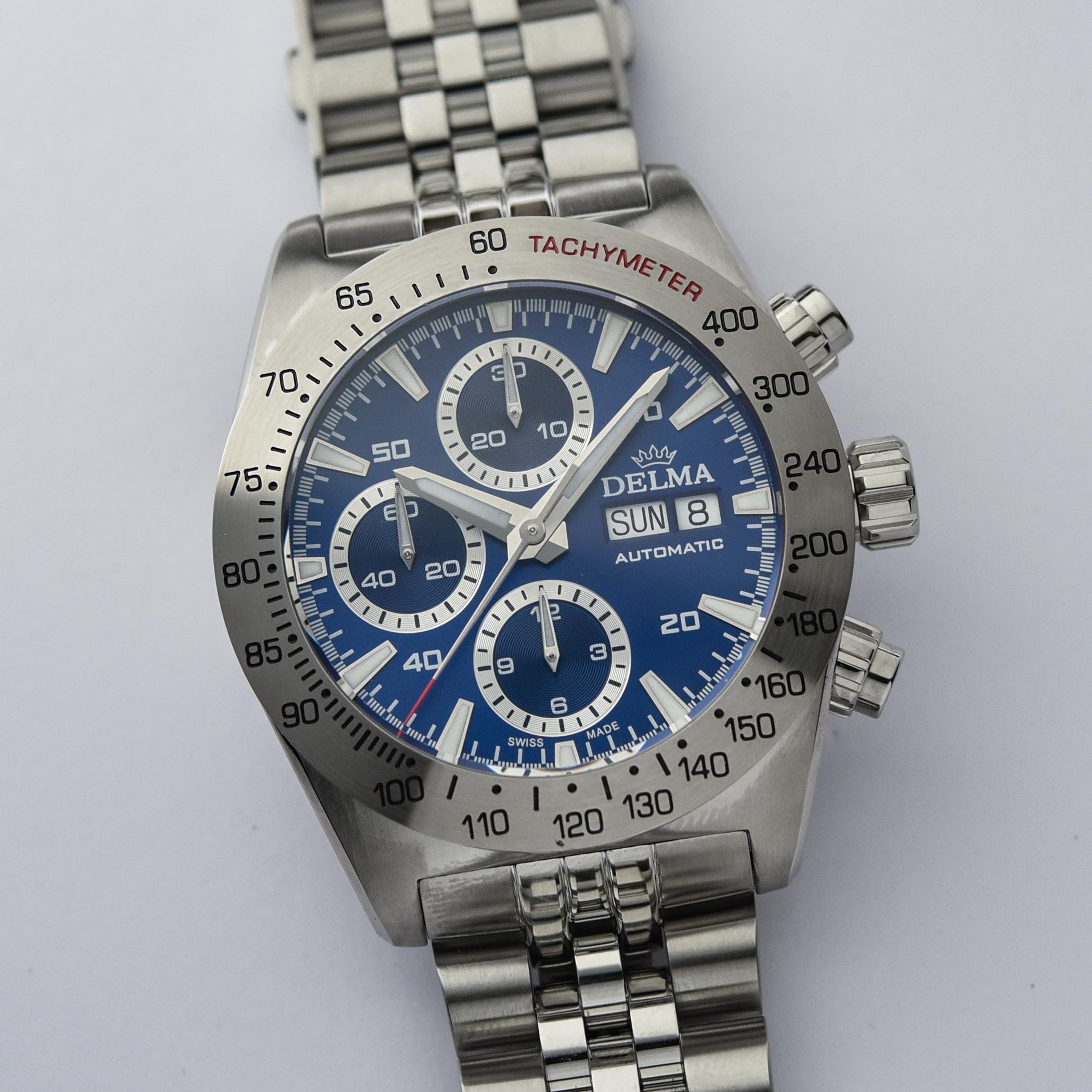 Part of Delma’s modus operandi is to create robust mechanical watches at a reasonable price. And just by looking at the spread of its collections, you get a sense they are not cutting corners. A 4,000m water-resistant diver, a robust field watch, or a classy chronograph, it’s all there. And it’s the last one we’re looking at today, the Delma Montego. The stainless steel case has been reduced from 45mm to 42mm and has a stainless steel bezel with a tachymeter scale. The dial comes in black, blue, white or green and has a distinct racy vibe to it. The Montego relies on the Valjoux 7750, providing you with the time, a chronograph and a day-date display. It costs CHF 2,200 on a Cordura-effect rubber strap or CHF 2,300 on a steel bracelet.