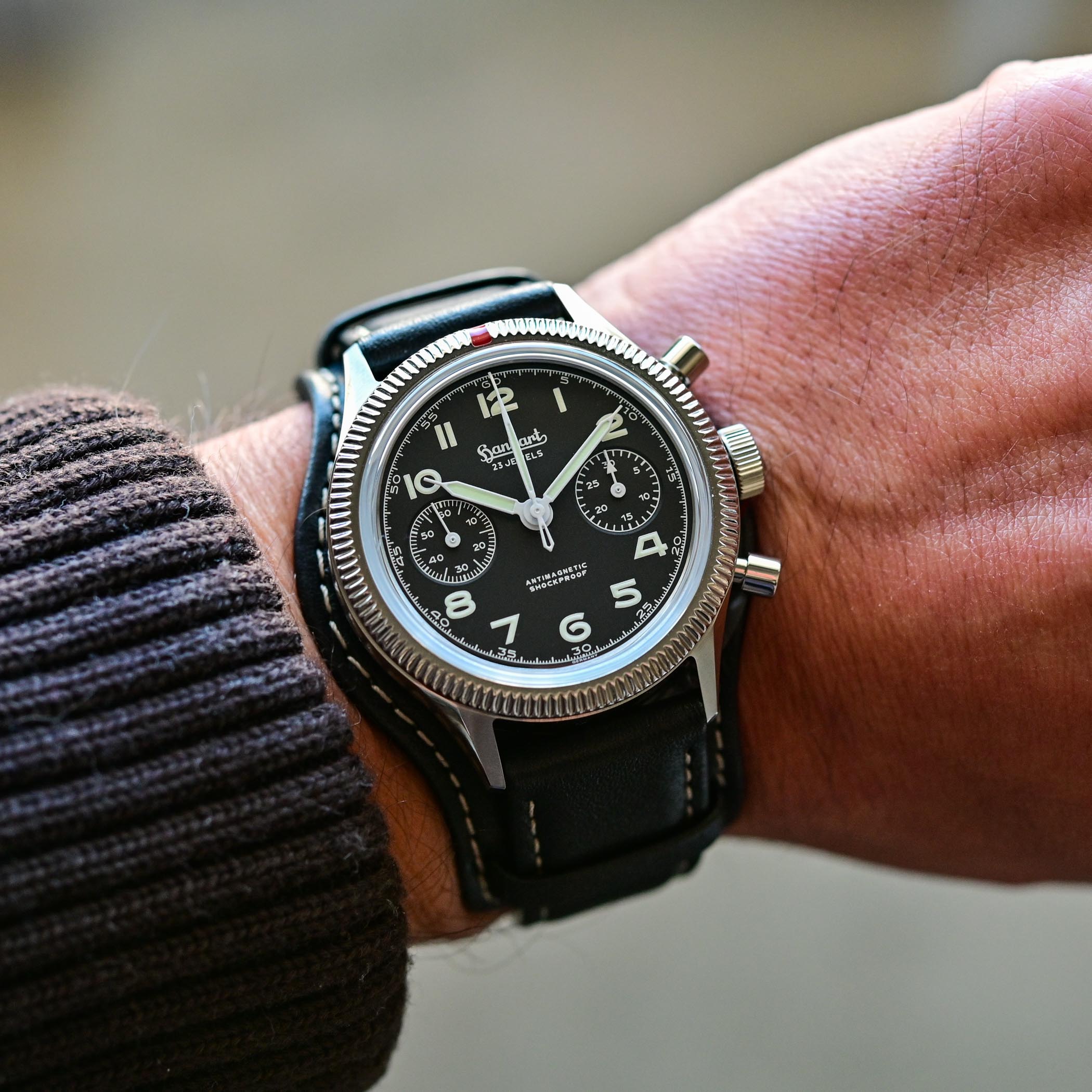 Quick Facts – 39mm x 13.5mm – stainless steel case, brushed and polished – fluted bidirectional rotating bezel with red marker – box-shaped sapphire crystal – solid caseback – 100m water-resistant – matte black dial – painted hour markers and hands with Super-LumiNova – bi-compax layout – Sellita SW 510-M – manually wound chronograph – 23 jewels – 28.800vph – 58h power reserve – hours, minutes, small seconds, chronograph with central seconds and 30-minute counter – black calfskin Bund strap – EUR 1,980