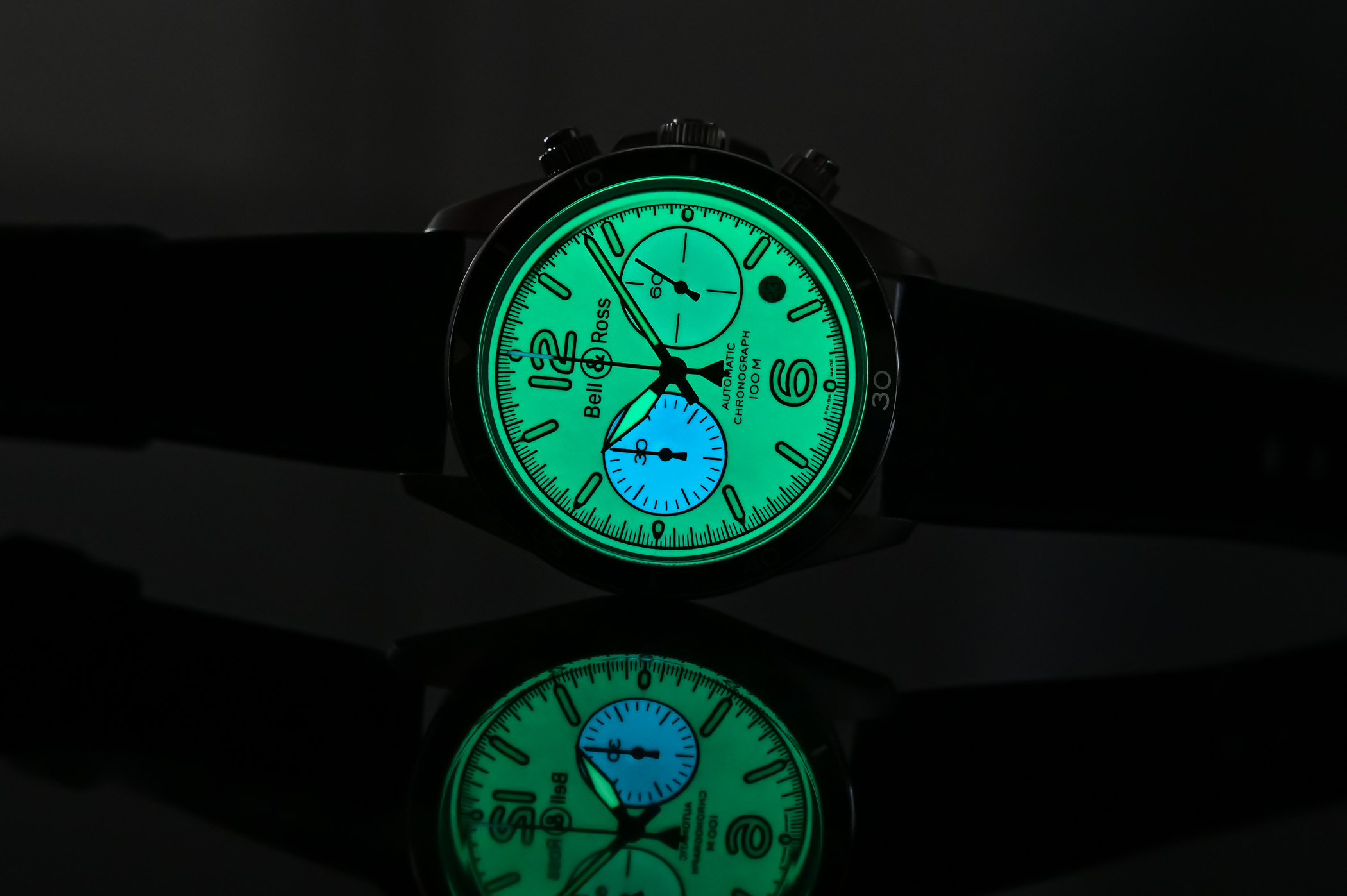 One of the more standout pieces is, without a doubt, the Bell & Ross BR V2-94 FULL LUM. The BR V2-92 makes full use of the light-emitting properties of LumiNova and Super-LumiNova. Bell & Ross has played around with luminous materials in watches before, but primarily in the BR 03 collection with watches like the BR 03 92 GREY LUM, HOROLUM, NIGHTLUM, and FULL LUM.