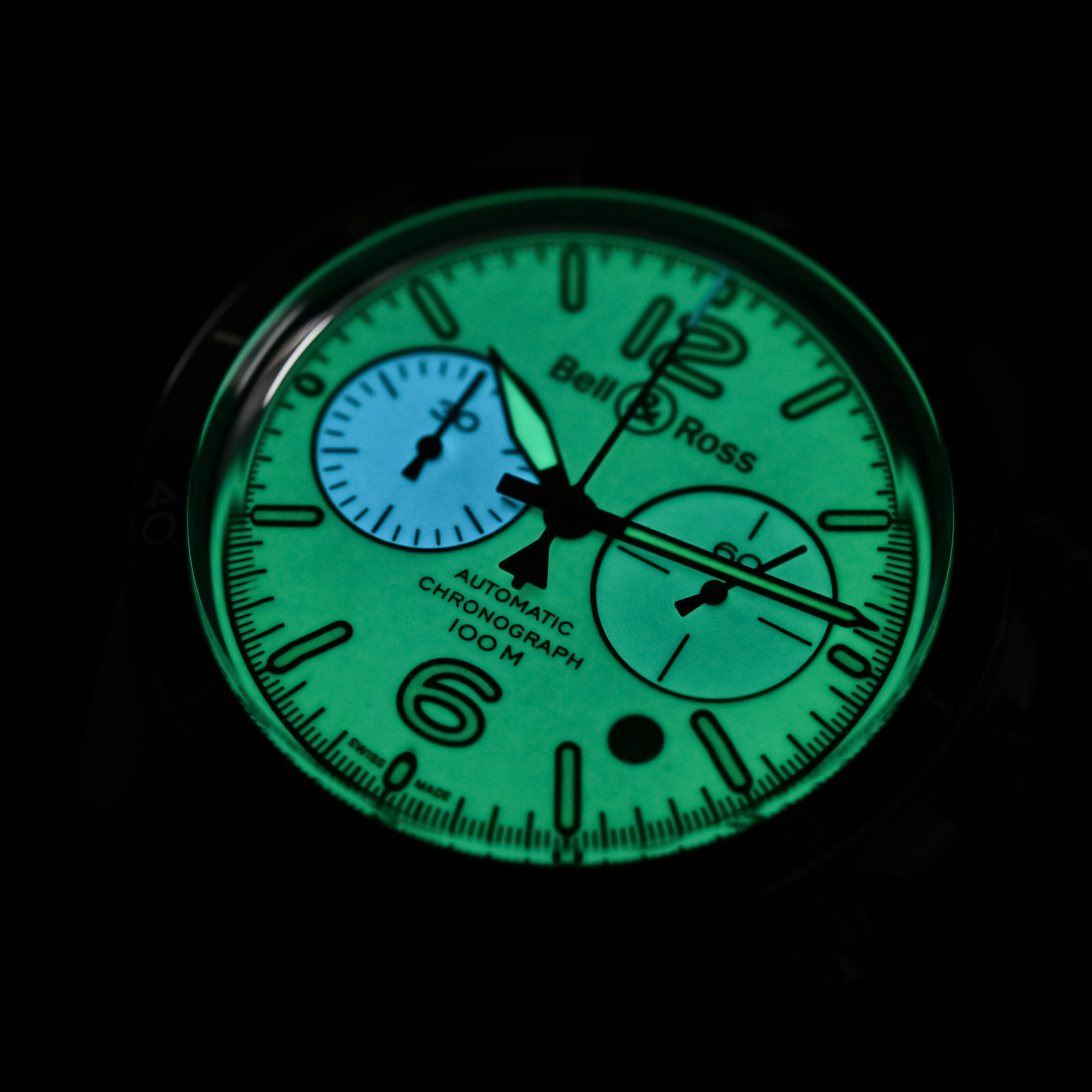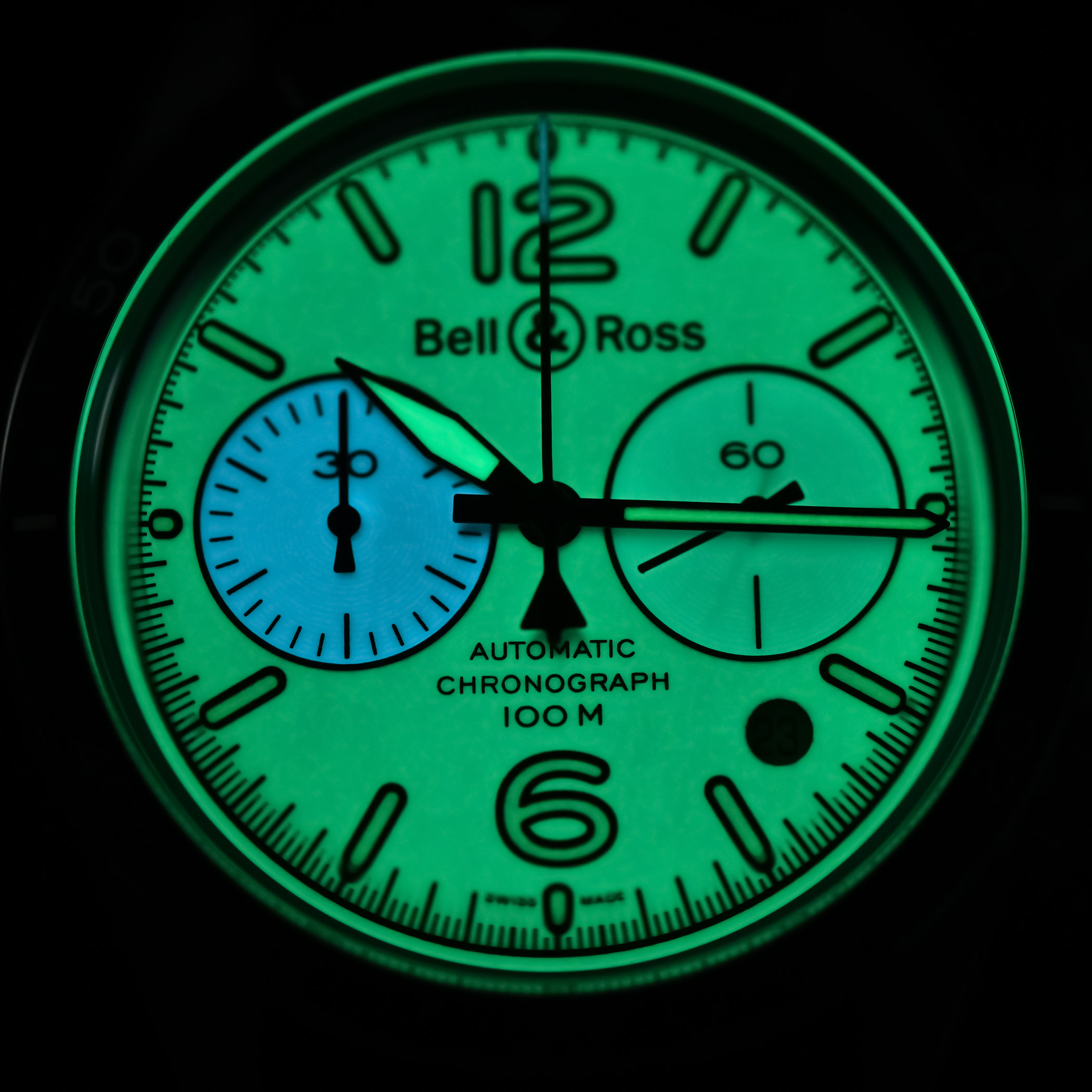 The BR V2-94 FULL LUM has a very unusual dial during the day, but even more so during the night. Under sunlight/daylight, the dial appears to have very light, pale yellow, and green tones. Stepping out of the sunlight and into darkness, the entire dial will start to light up in a dramatic way. The main dial will emit a green hue, while the numerals, indices, hands, and counters will emit a slightly different tone of green. Finally, the central chronograph seconds and the 30-minute chronograph counter light up in bright blue.