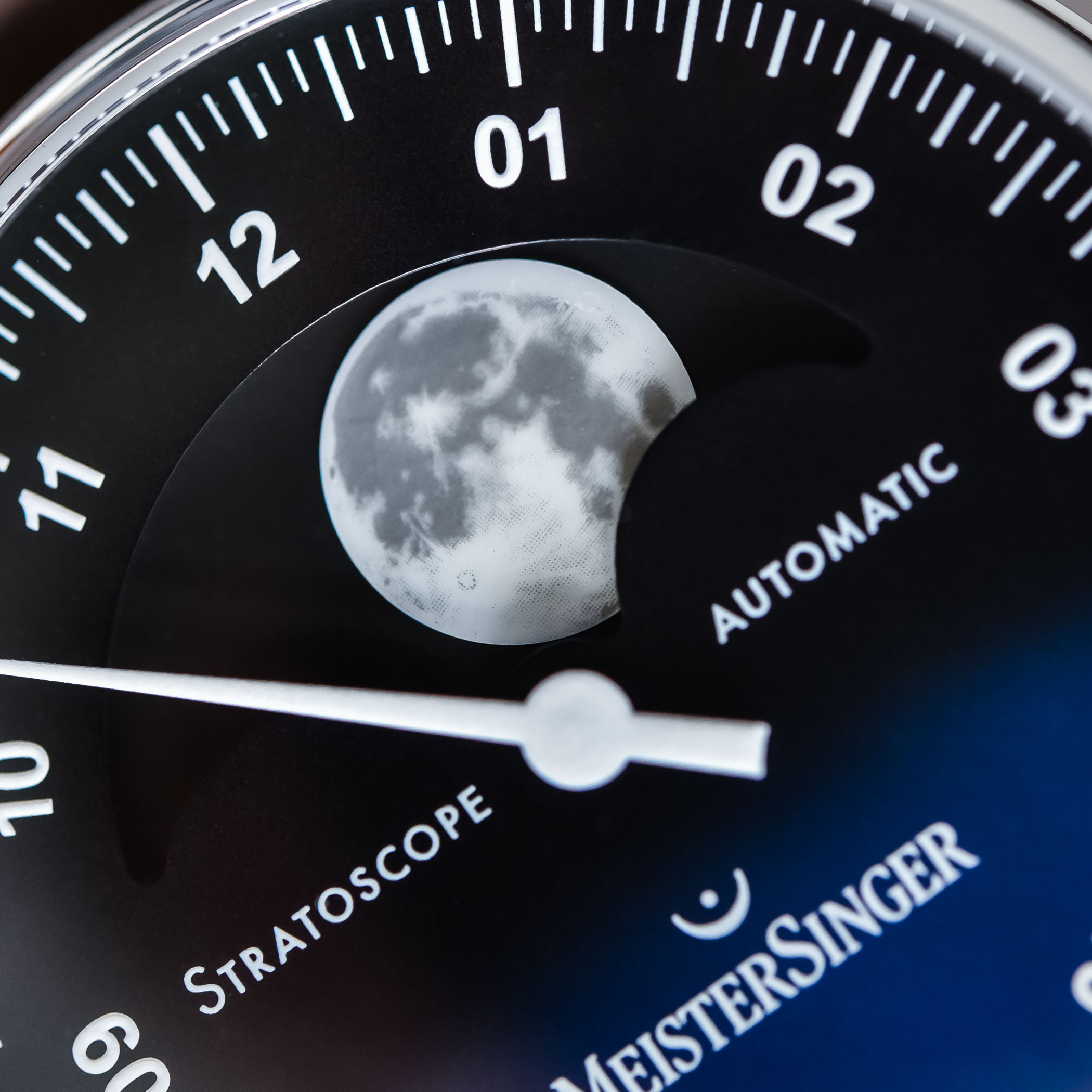 Quick facts – 43mm diameter x 11.7mm height – stainless steel case, brushed and polished – jet black dial with blue gradient lower half – oversized moon phase indication with luminous photorealistic moon – calibre MS Luna, Sellita SW 220 base with MeisterSinger designed moon phase module – automatic winding – 38h power reserve – EUR 3,690