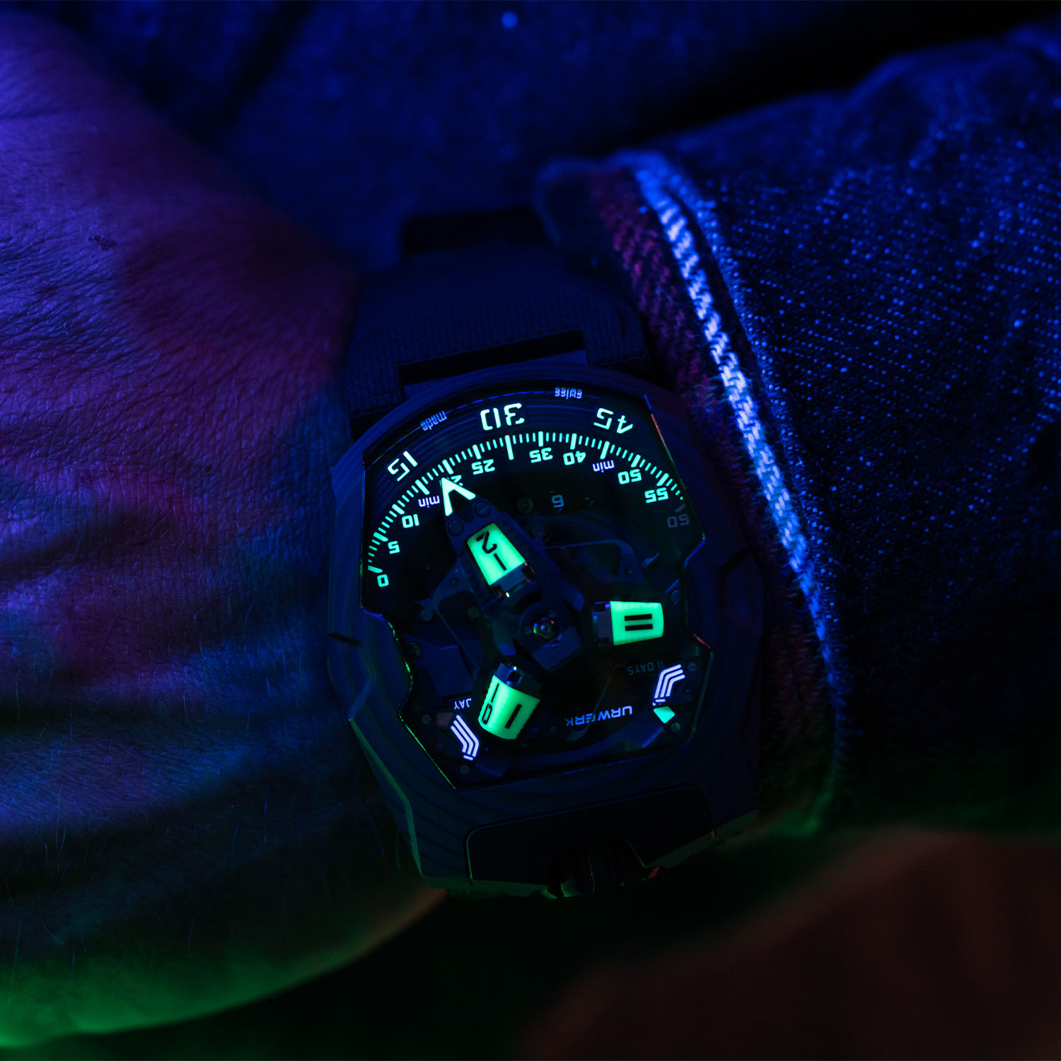 Any Urwerk is impressive to behold, there’s no doubt about that. And while most, if not all, come with a healthy dose of luminescent material used for the hands, satellites, scales, and more, there’s one that stands out just a little bit more.