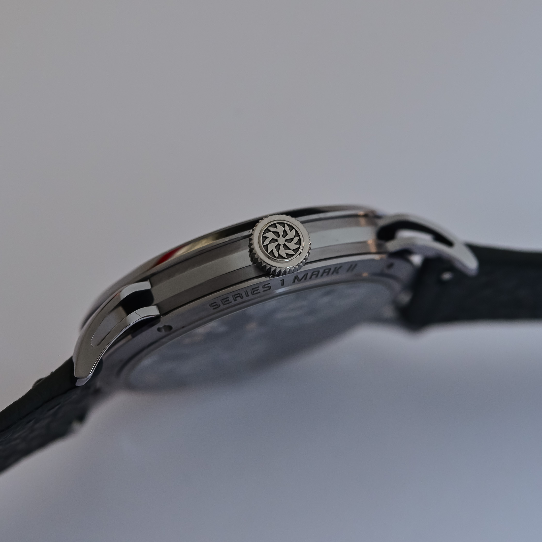 Like the Series 1 Launch edition, the Series 1 Mark II case measures 38.5mm in diameter and 8mm thin (9mm with the domed crystal), so it fits well within the classical dress watch category in terms of size; the proportions are elegant, yet the architecture is more complex than that of a traditional dress watch. The three-part midcase construction is central to the design. Brushed upper and lower surfaces border a polished central band that flows through the hollowed lugs in a continuous line of light across the case.