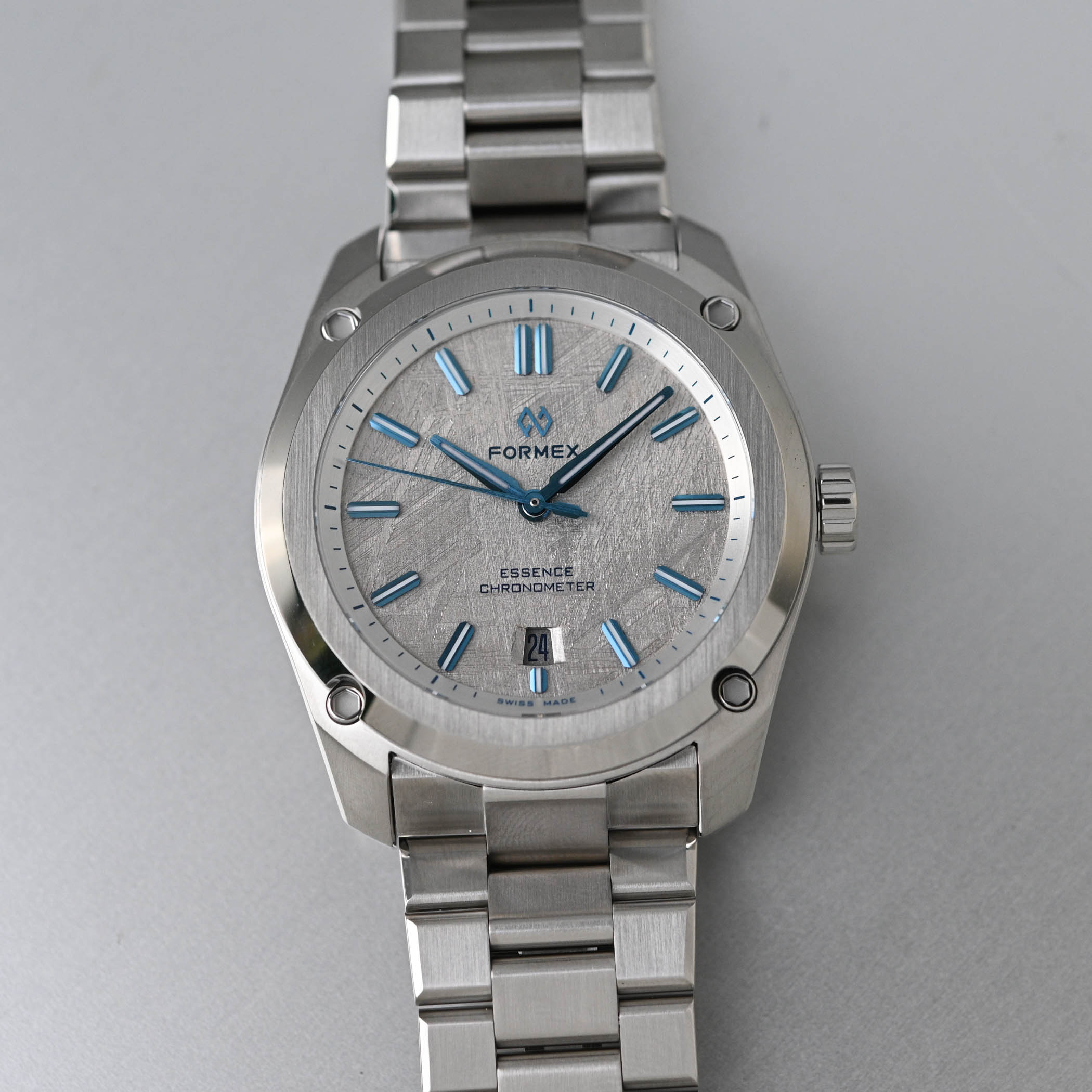 Formex’s Essence line, introduced in 2018, quickly earned respect as the brand’s versatile, go-anywhere sports watch, combining sharp case architecture, great engineering, and chronometer-certified accuracy. In 2020, the collection took on a cosmic turn with the debut of the Space Rock editions, featuring dials cut from the ancient Muonionalusta meteorite. Over time, these rare cosmic surfaces appeared in variations, from the ice-blue Space Glacier to the salmon-hued Space Gold achieved through rose gold electroplating. For its 25th anniversary, Formex expands the line with the Essence Space Ghost 41mm, a model that introduces a new case size positioned between the existing 39mm and 43mm formats, as well as updates regarding its daily practicality.
