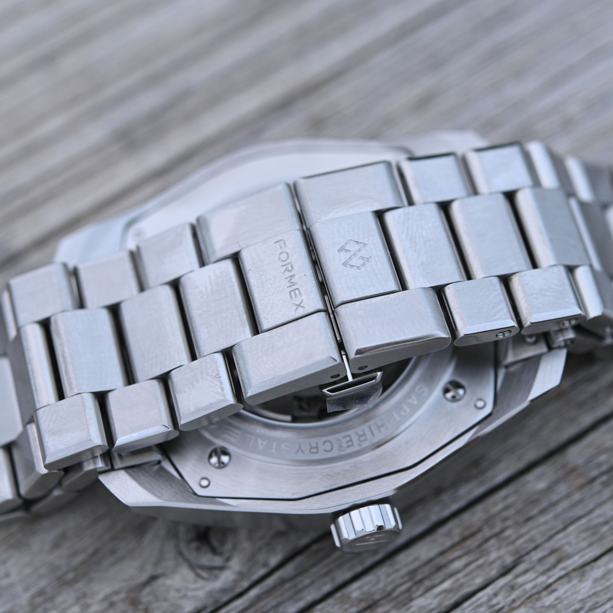 With the Essence Space Ghost 41mm, Formex also debuts its next-generation micro-adjustable butterfly clasp on the stainless steel bracelet. This system allows three settings, 0mm, 3mm, and 6mm, adjusted without opening the clasp, and incorporates redesigned bracelet screws. Strap options include leather, rubber, or nylon, each fitted with a carbon fibre deployant clasp offering 7mm of gradual on-the-fly adjustment. All straps and the bracelet use the brand’s tool-free quick-release system for easy interchangeability.