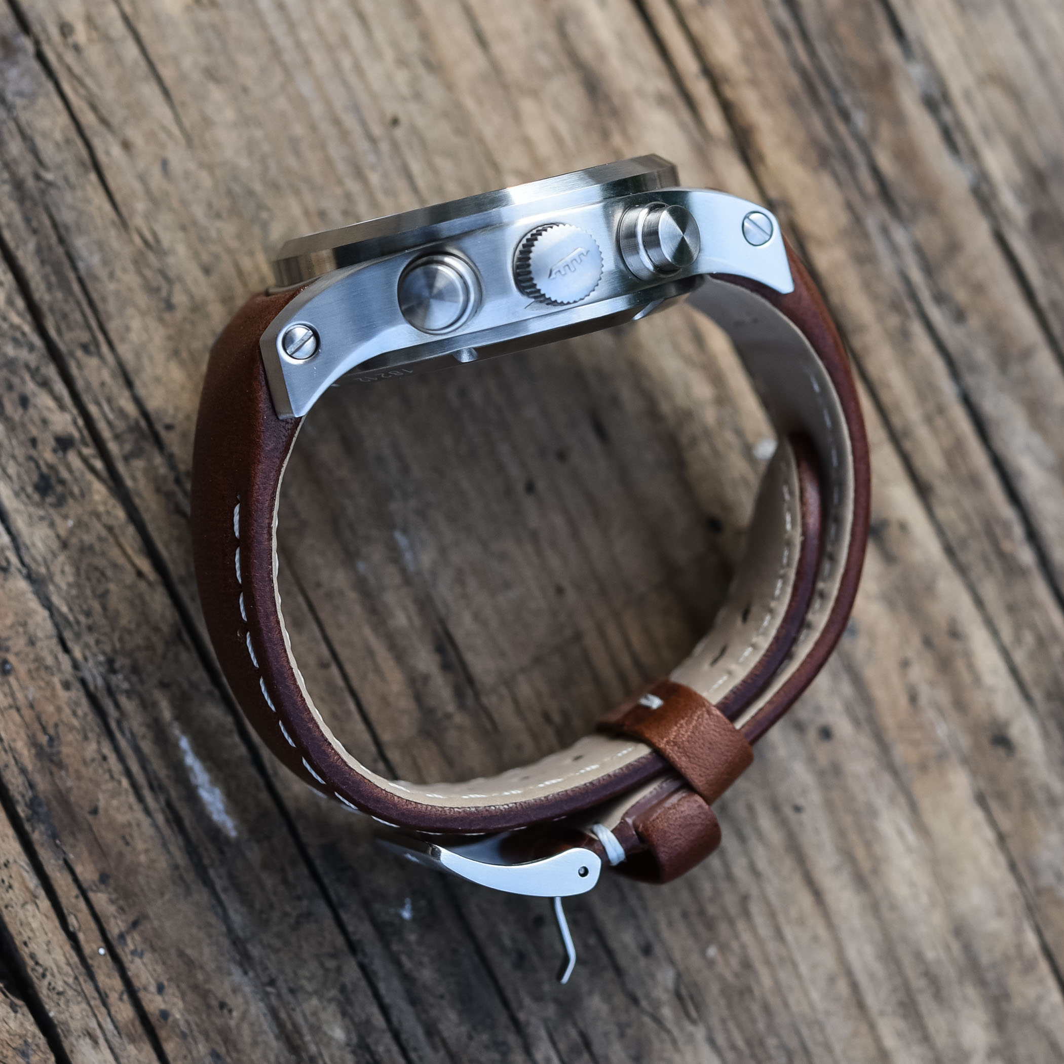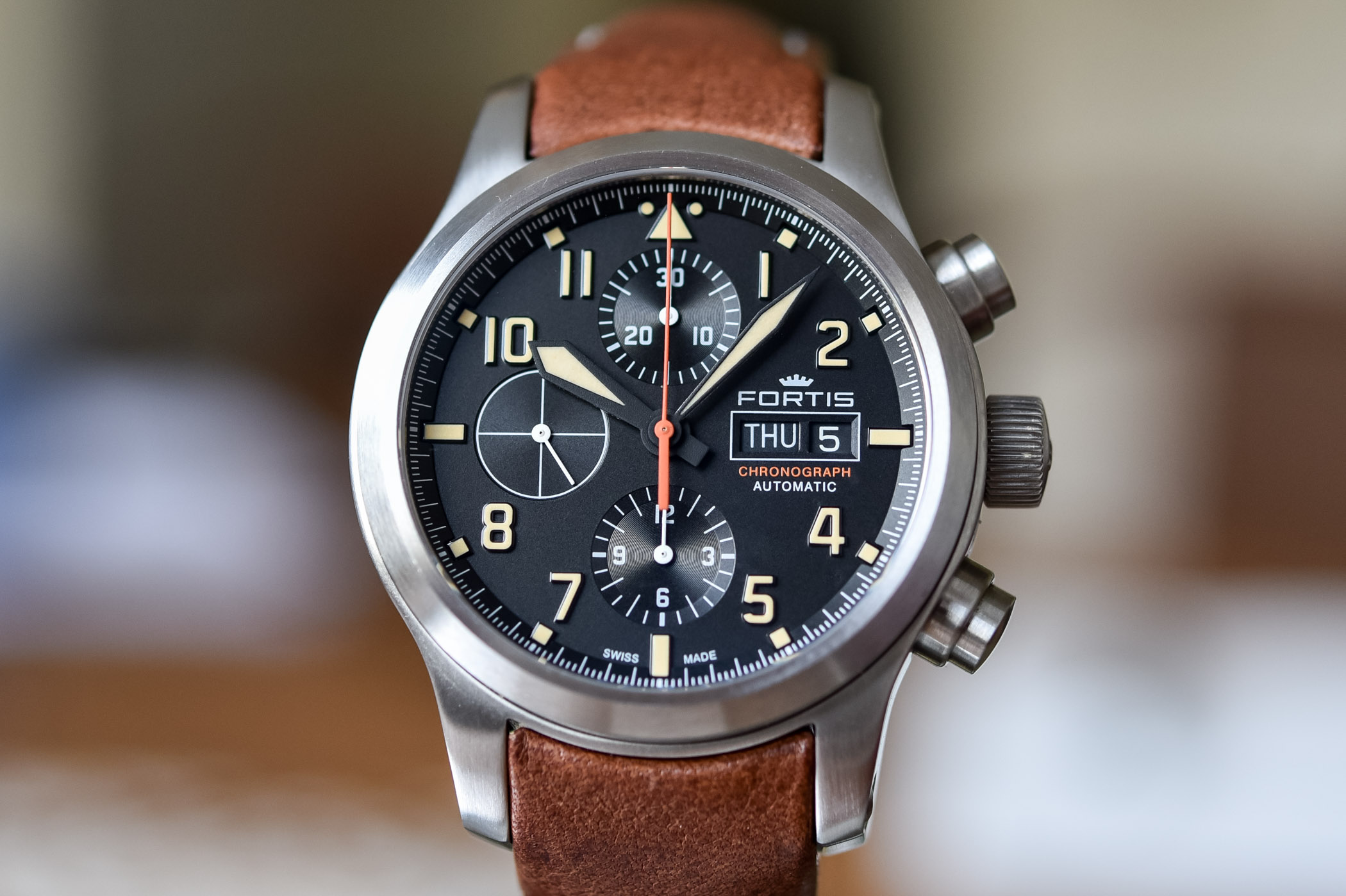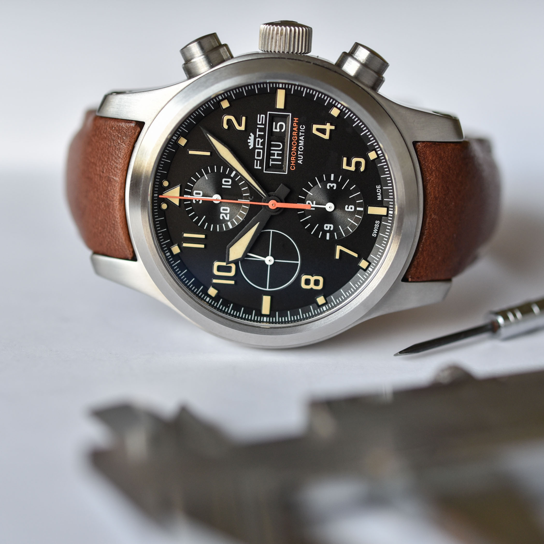 Despite the approximate 15mm height and the lugs that appear massive, the ergonomic shapes of the Fortis Aeromaster wear well on most men’s wrists. The strap, in a vintagey brown leather and its pleasant curved shape between the lugs, also adds to the comfort and makes it balanced. The watch has presence, no doubt about it, and has a nice instrumental feel reminiscent of 1990s Fliegerchronographs once produced by IWC. The quality of the build is very satisfying and the whole package feels sturdy and durable.