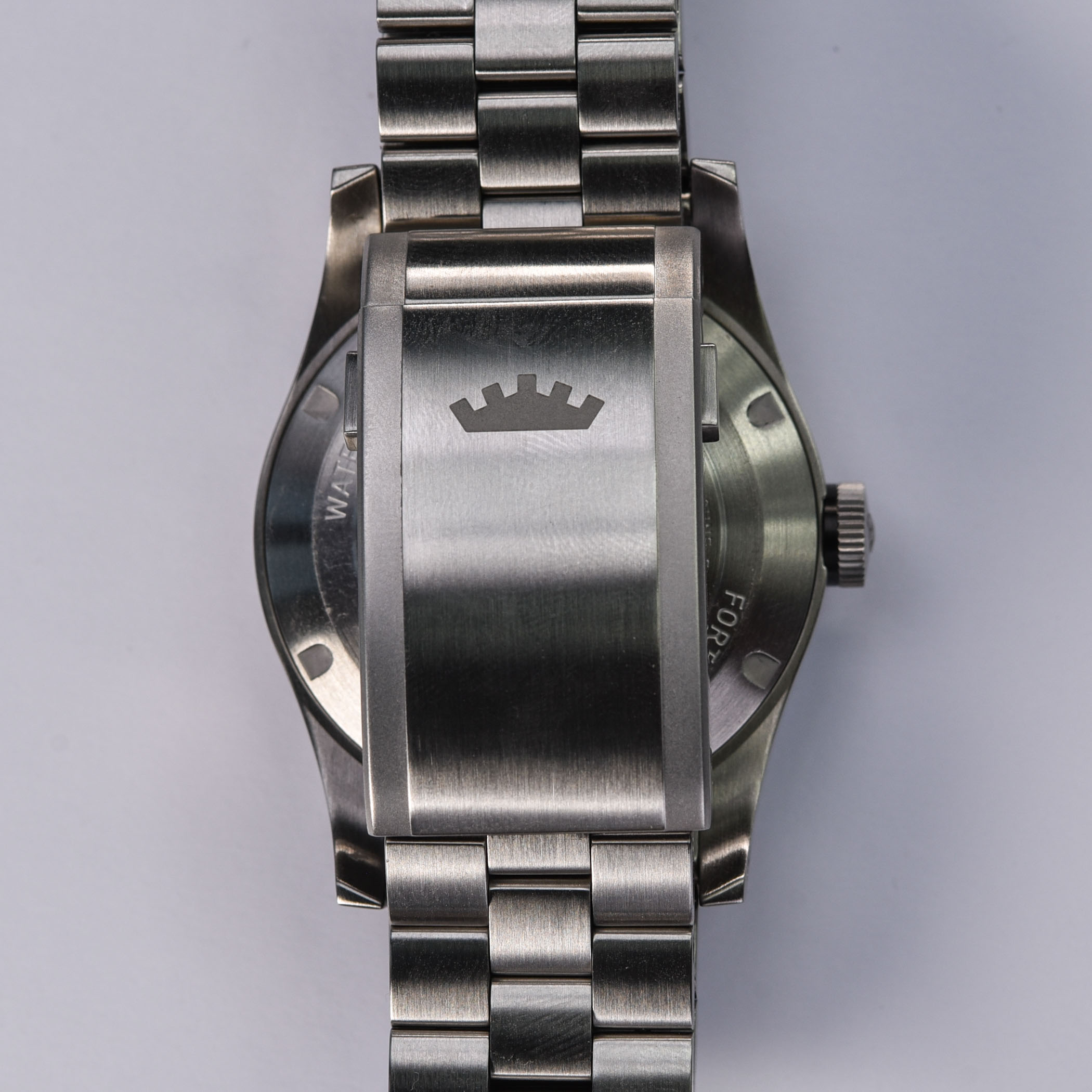 The Fortis Flieger F-43 is fitted with a robust yet flexible three-link bracelet with a safety folding buckle and a practical quick-adjustable extension. Made of lightweight titanium, it is comfortable and yet robust at the same time. The screwed lugs offer additional security on the wrist.