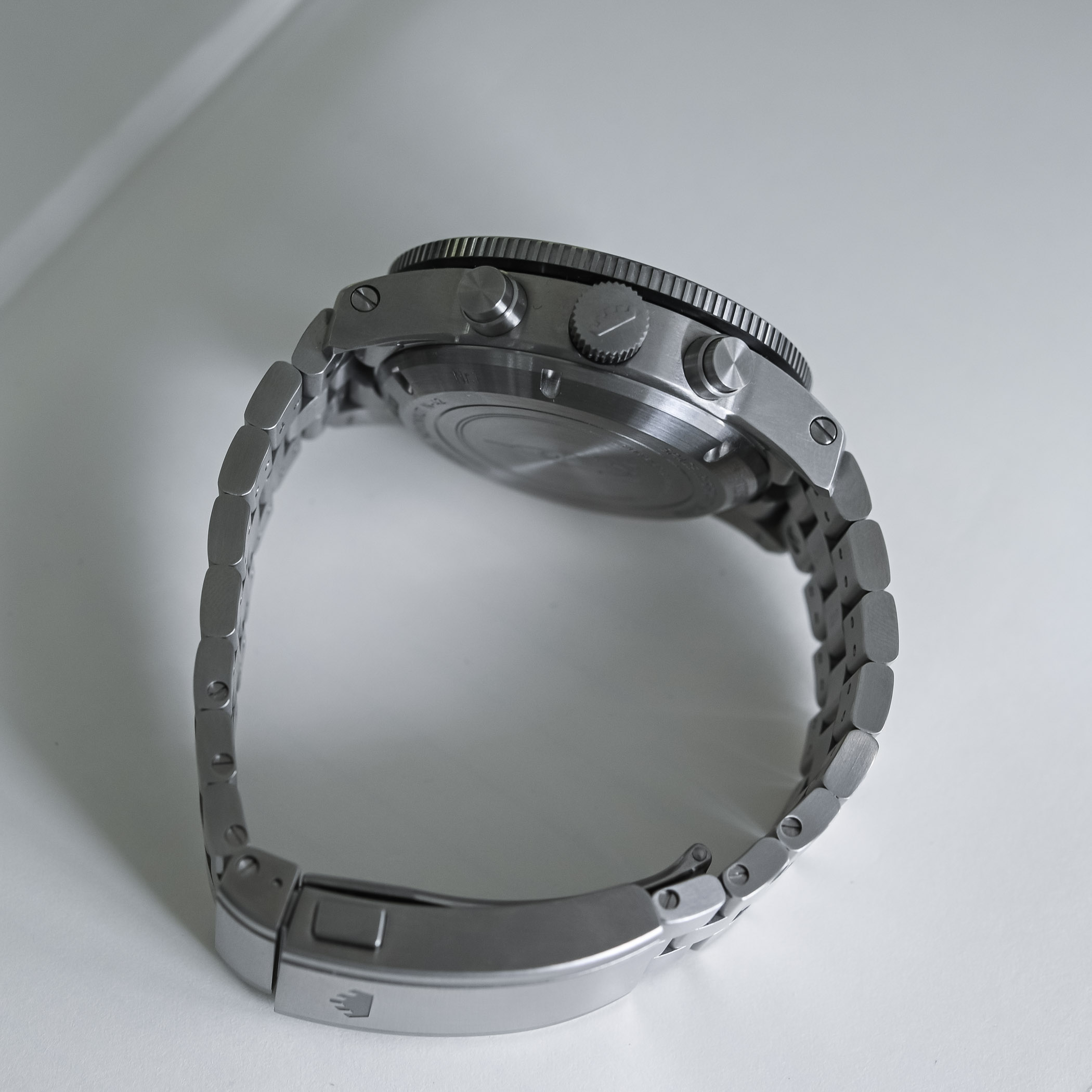What has changed? Well, almost everything, but in a way that retains all the traditional elements of the previous generation. It’s an evolution, not a revolution, and that’s for the best. Basically, Fortis is using the same recipe that it applied to its Flieger collection on its space chronograph. While the case retains the classic look of the B-42, it has been beefed up and modernised. Made of recycled stainless steel, it measures 42mm in diameter and about 15mm in thickness and is entirely brushed. The lugs are short and feature screws on the side to help remove the strap/bracelet. In the (recycled) metal, it leaves no doubt as to the watch’s vocation. It’s a tool, an instrument ready for action.
