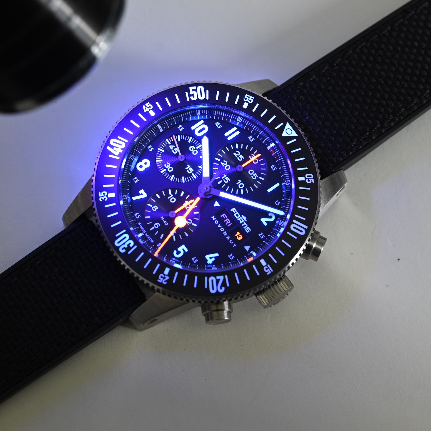 The dial of the N-42 Novonaut is busy, but it retains instant legibility and an intuitive display. A classic 6-9-12 and day-date chronograph display is complemented by an inner flange with a precision minutes/seconds track and applied Lumicast numerals (these are not coated in SLN but made from blocks of SLN) and straight, functional luminous hands. Surprising half-hour markers are also printed on the dial, and two small arrows next to the day-date window indicate which direction you should rotate the crown to adjust the functions – a signature detail that was also found in the B-42 but has been reduced in size here.