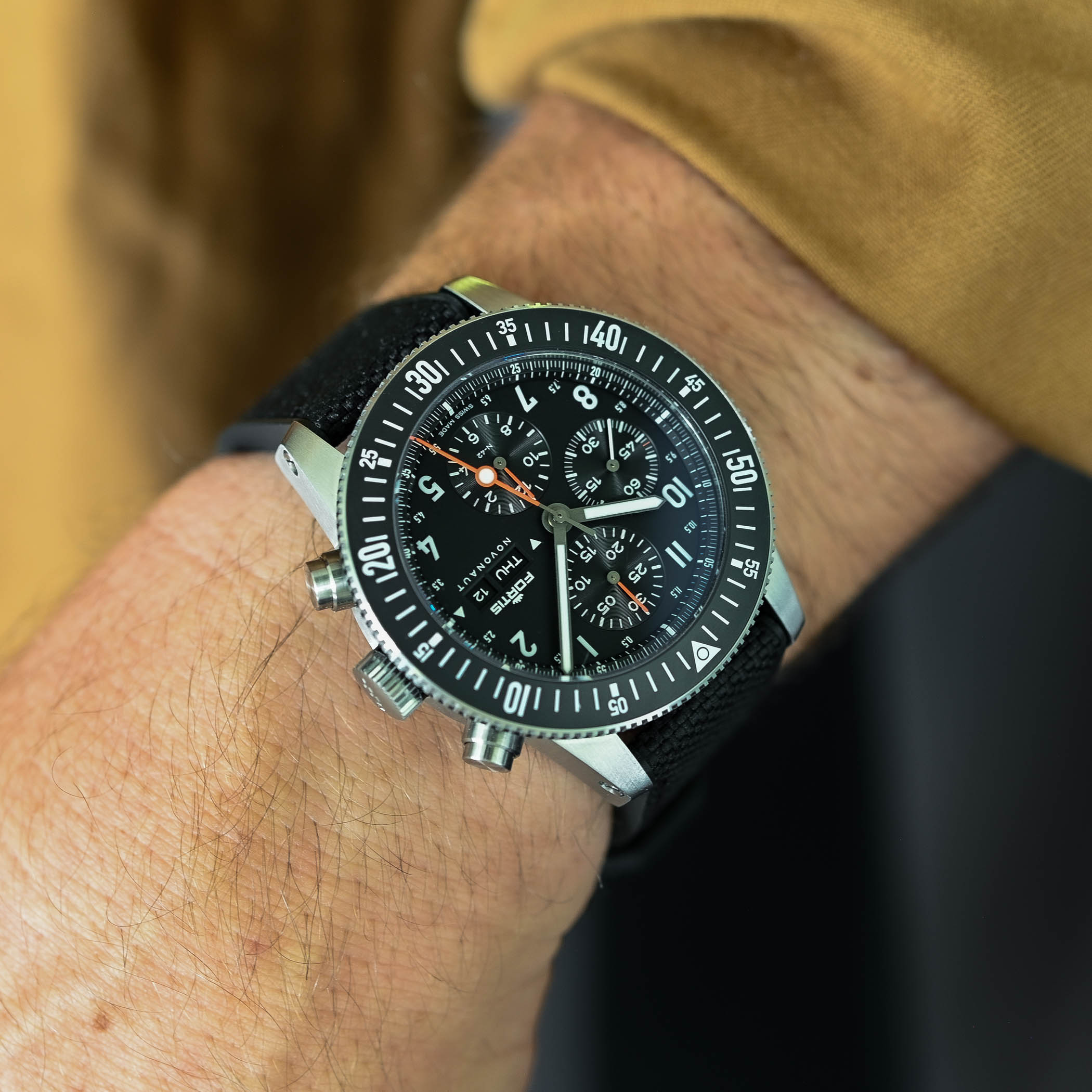 I have the previous version cosmonauts chrono and it is a great watch for the intended market. It’s big , heavy and thick. If you are looking for a slim sports chrono the fits under a shirt cuff look elsewhere. Fortis however is a great company and the current service is very good. I just ordered and received the new textile/FKM strap with deployant strap for my b42 and the service was spot on.
