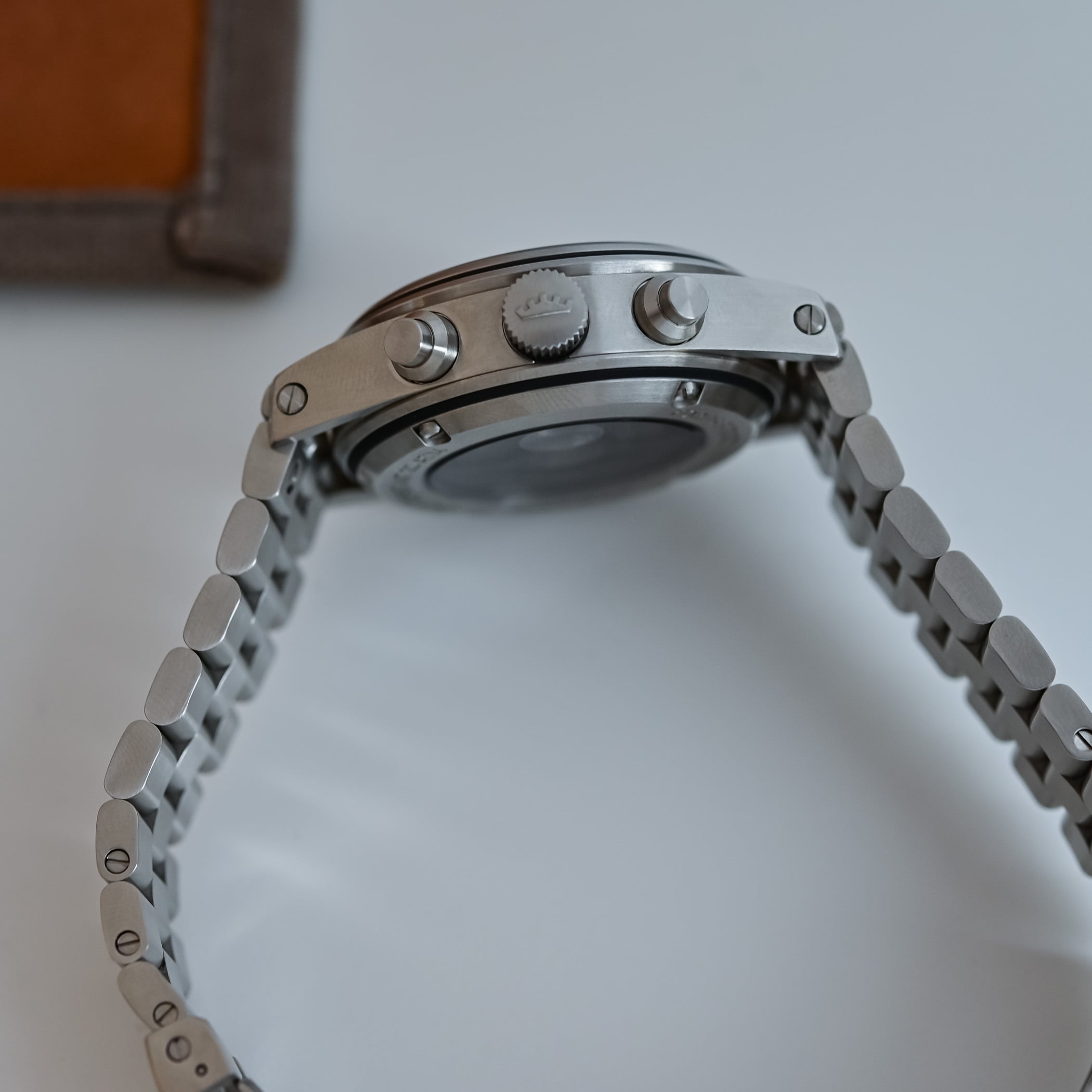 Marking phase two of the Stratoliner’s voyage, the new lineup of chronographs sticks to the brand’s tool-watch spirit with a 41mm rock-solid case with a thickness of 15mm, a lug-to-lug of 51mm and a 200m water-resistance rating. Don’t pull out the loupe to admire the fancy finishings; the case is deliberately industrial, with a brushed finish, utilitarian screwed lugs and piston pushers, and a flat bezel. Made of recycled stainless steel, DLC-coated steel, or a limited-edition steel model with a gold bezel, the ultra-robust case features a screw-down crown with a triple gasket system and a rubber/gold gasket between the bezel and the case middle.