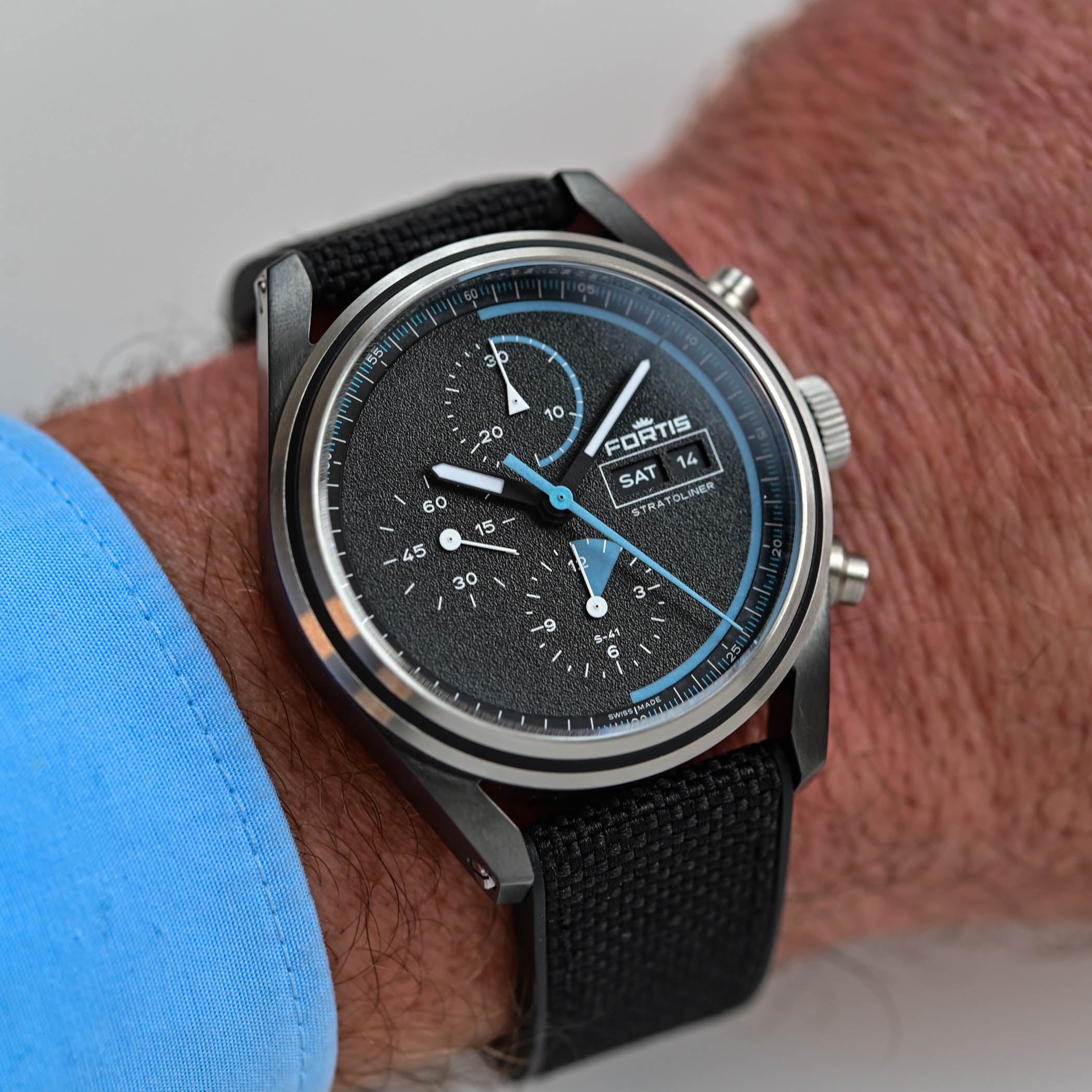 The darker dial of the Stratoliner Gravity Black echoes its dark DLC-coated case, increasing surface hardness to 4,500 Vickers (20x that of standard steel). The gritty texture of the dark grey stardust dial contrasts with the white indications and the light blue Super-LumiNova accents on the right half of the dial. This model comes with a black hybrid FKM rubber and textile strap.
