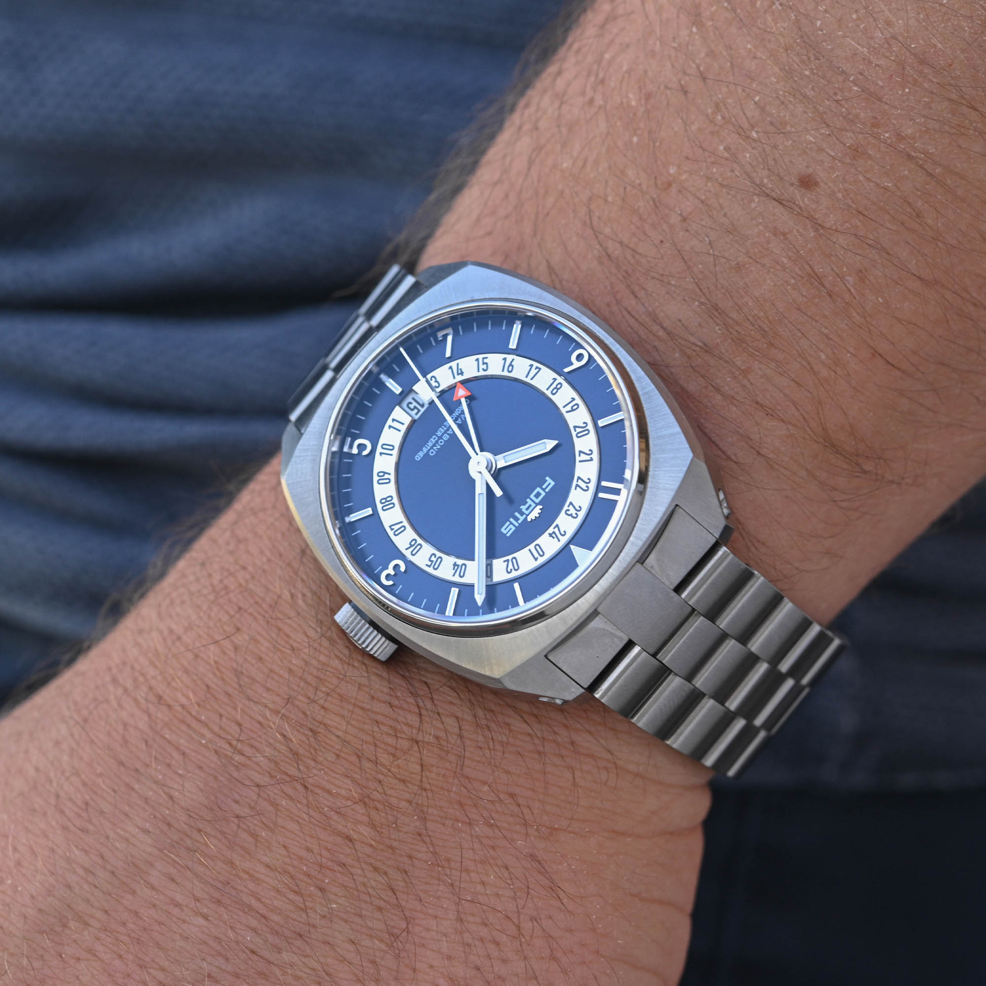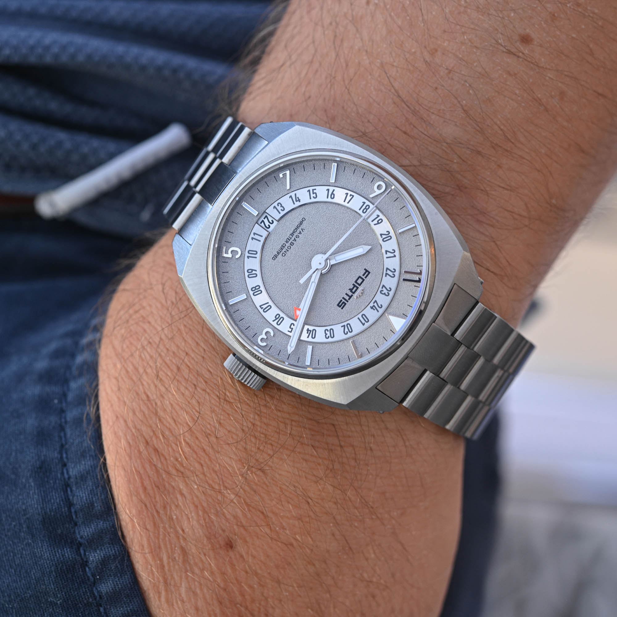 Swing and a miss? Soulless retroesque case for a GMT functionality that by now is broadly available in many more comfortable, less loud, or at least less explicitly “stylized” packages. I don’t think there is any rescuing this watch from its own case, but two suggestions: flip the GMT script by positioning both the 12hr 12 and the 24hr 12 at the top of the dial—like a sun at its zenith?—and add that signature Fortis alarm.
