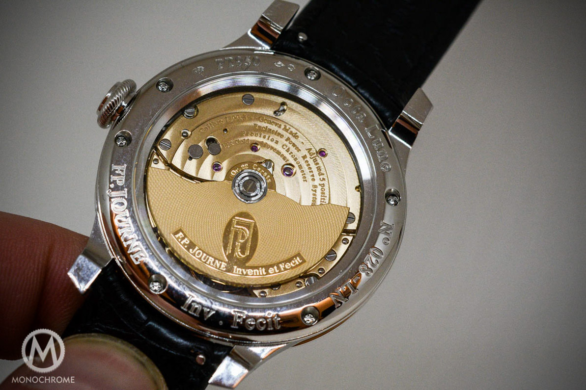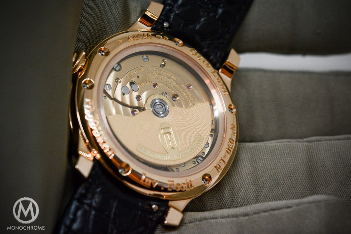 This new layout also means that there are changes from a technical perspective too. Normally we’d expect to see the addition of a top module, but a look at the fact sheet shows that the differences in this evolution are much more profound, as the movement now measures 34.6mm instead of 30.8mm. The architecture however remains the same and the technical specs too: 120+ power reserve (in fact, close to 160 hours or 6.5 days), 3Hz frequency, the same slightly off-centered gold rotor. The visual result is also improved as the movement feels well proportioned in the case, even with its larger dimensions. The finish is, as usual with FP Journe, a real pleasure: solid pink gold plate and bridges, polished beveled angles, circular graining on the main-plate, concentric Geneva stripes, beveled screws’ slot and polished screws’ head. The rotor comes with a nice engraving and an engine-turned finish.