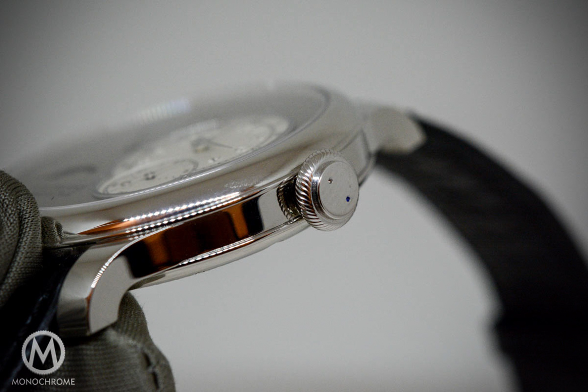 The big date at 11 (composed of two independent discs, instantaneously jumping at midnight) is twice as large as the one on the old FP Journe Octa Lune, again to improve readability. The moon-phase indication is no longer located at 7 but it’s now slightly inclined and positioned at 8. The power reserve indicator had also been moved up a few millimeters. Finally, the logo of the brand is not located at 12 and written in a circular way but more painted at 7. The visual result is not tremendously different but it brings a better legibility and a cleaner look. However, the DNA and charm of the brand’s dials is still present, with this typical strange and messy layout that collectors enjoyed for years now.