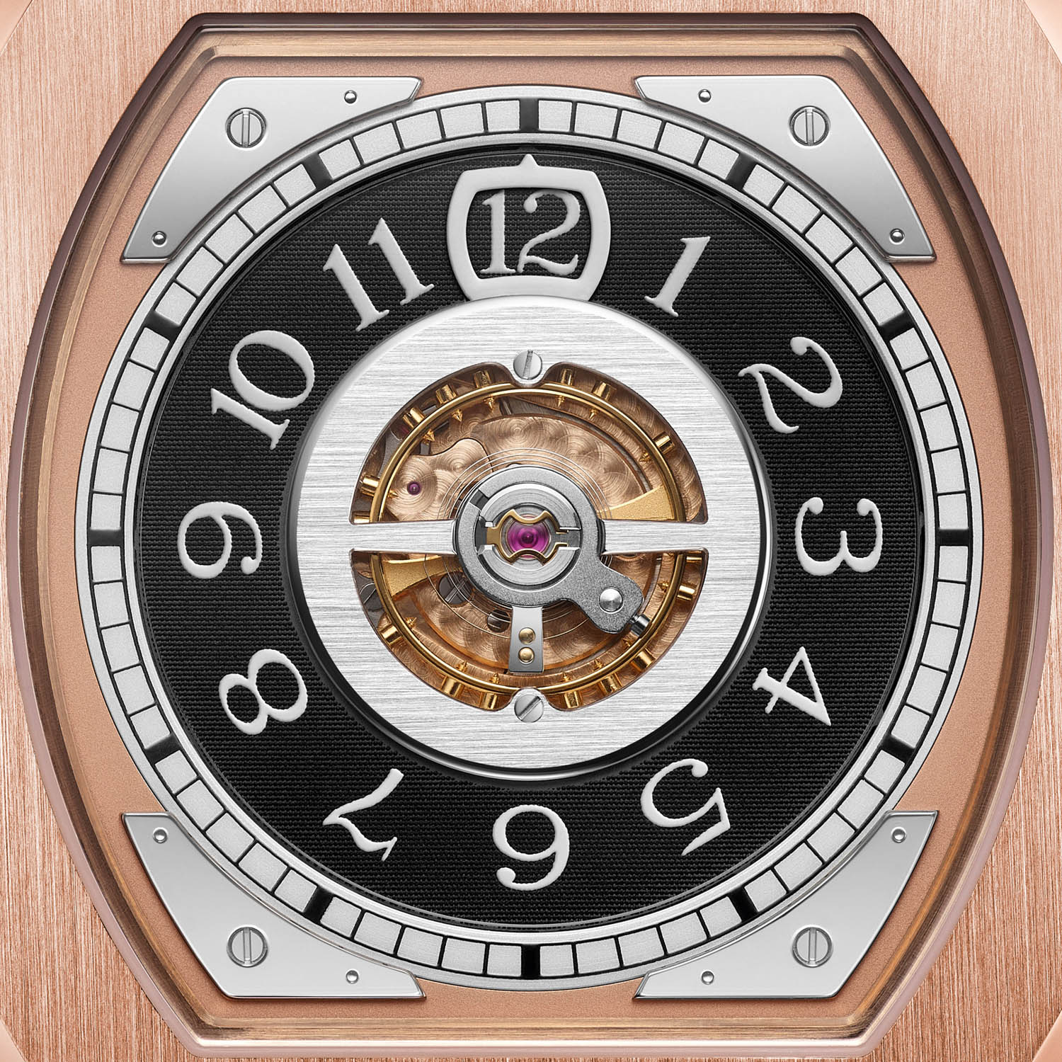 Housed in a 37.5mm x 45.2mm red gold case flat Tortue case with a slim height of just 7.6mm, the timepiece displays the jumping hours on a slate grey disc with a silver frame to highlight the hour in question in the brand’s signature font. Like the first Vagabondage model, the hour highlighted in the aperture rotates around the dial to indicate the minute displayed on the peripheral railway-style minutes track. The balance and escapement are revealed through the central aperture on the dial covered by a sapphire crystal glass. The finishings are high grade with straight Geneva waves on the bridges, polished screw heads with chamfered slots, polished and bevelled steep components and a circular-grained base plate.