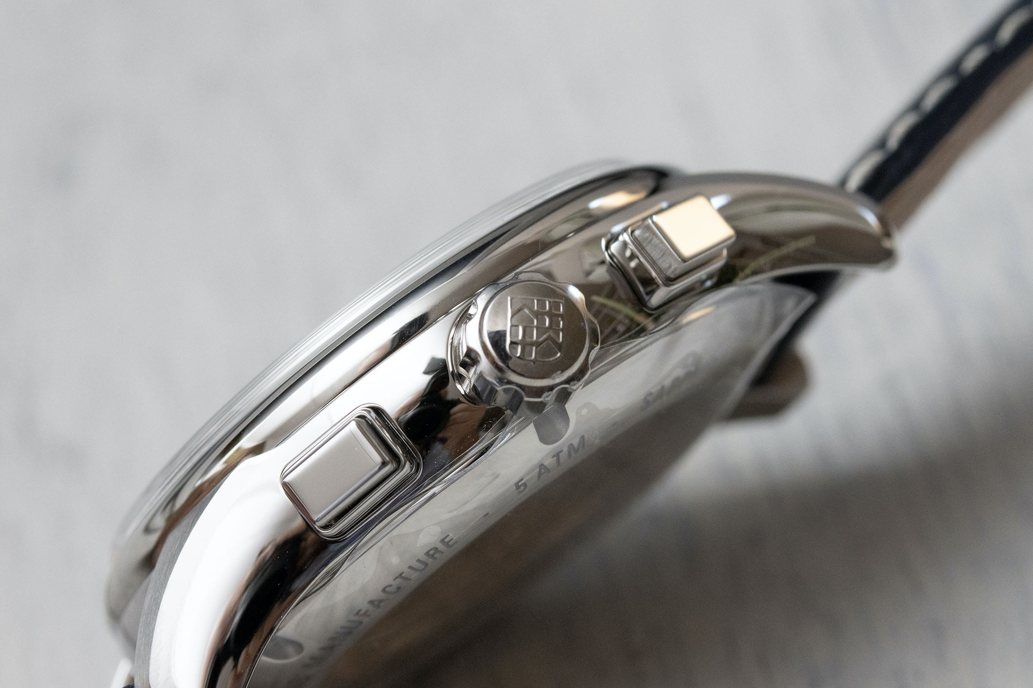 The fact that the indices are faceted and applied reveals the effort the brand is making to offer a high-quality product. The silvered tri-compax counters at 3 o’clock (30-min chrono counter), 6 o’clock (date display by hand) and 9 o’clock (running seconds), along with the silvered tachymeter scale on the stainless steel model with a navy blue background, really stand out and improve legibility. The sub-dials are decorated with a stamped circular guilloché pattern and the hour and minute hands are treated with white Super-LumiNova.
