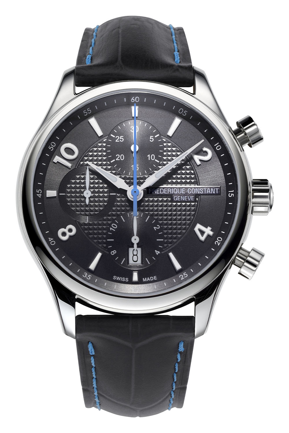 Two dial variants of the Frederique Constant Runabout RHS Chronograph Automatic will be available. The first one has a dark grey dial with a light blue seconds hand – a colour scheme also found on the strap. The second model has a silvery dial with a dark blue seconds hand and a matching strap.