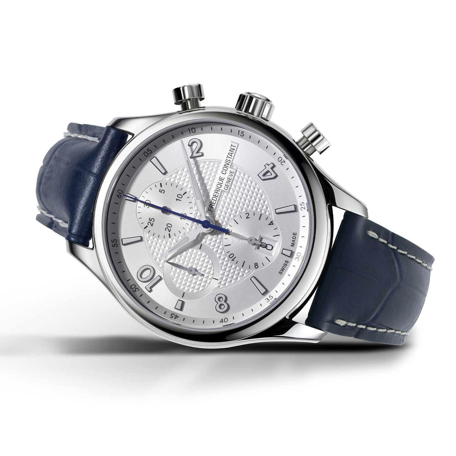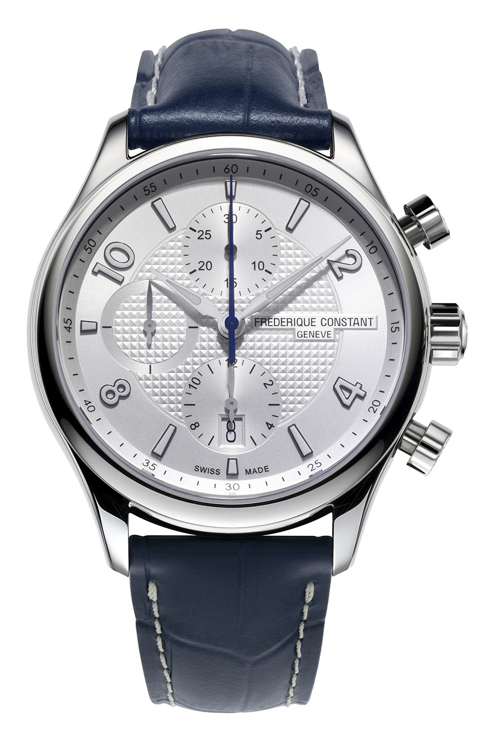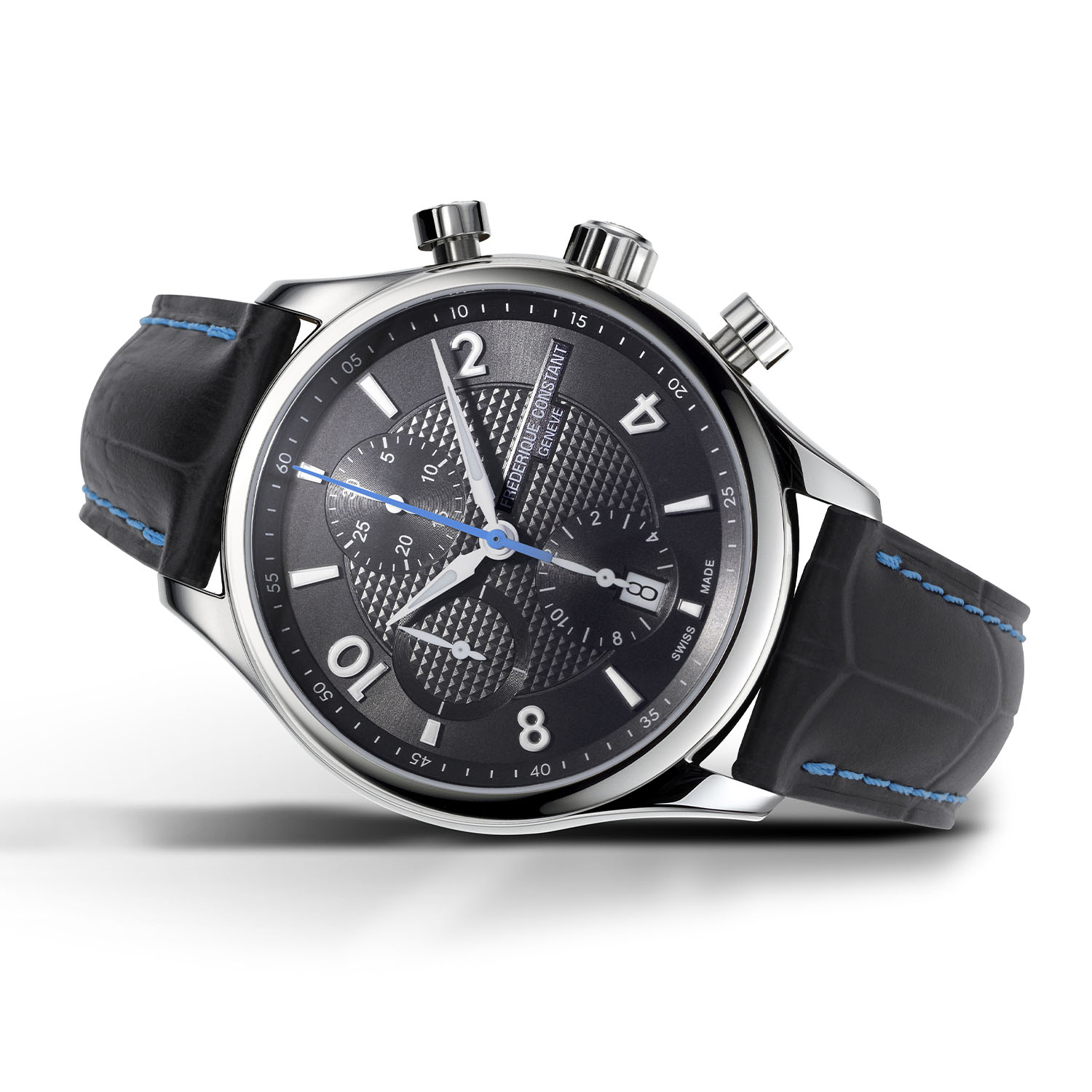 The Frederique Constant Runabout RHS Chronograph Automatic is housed in a fully polished 42mm stainless steel case, with sapphire crystals front and caseback. The case is complemented by a thin bezel, offering a large view on the dial, as well as simple, old-school-style mushroom pushers for the chronograph. The watches are worn on calf leather strap with an alligator pattern, a steel folding clasp and contrasting stitchings – the colour of the strap and the thread depending on the chosen edition.