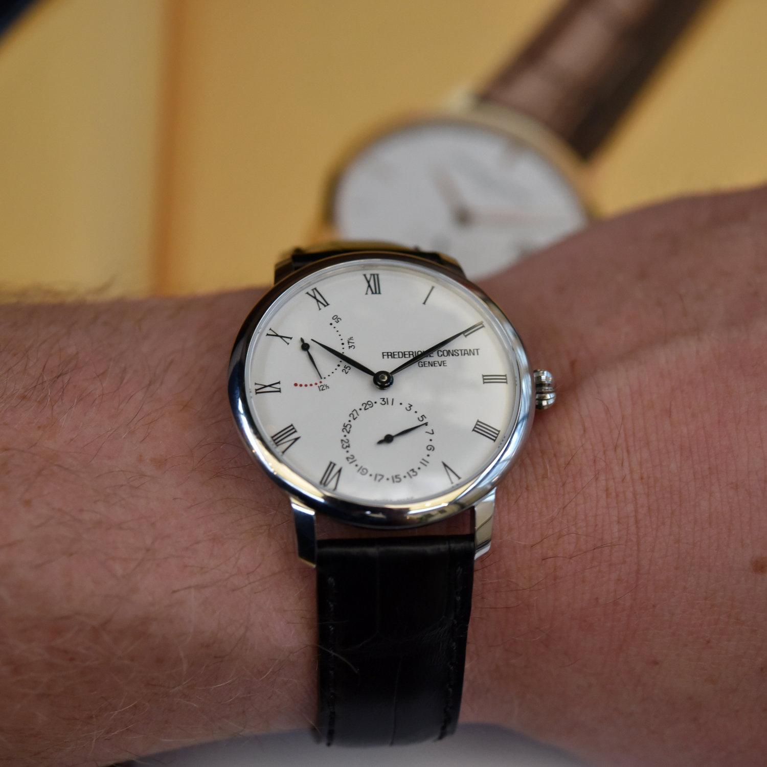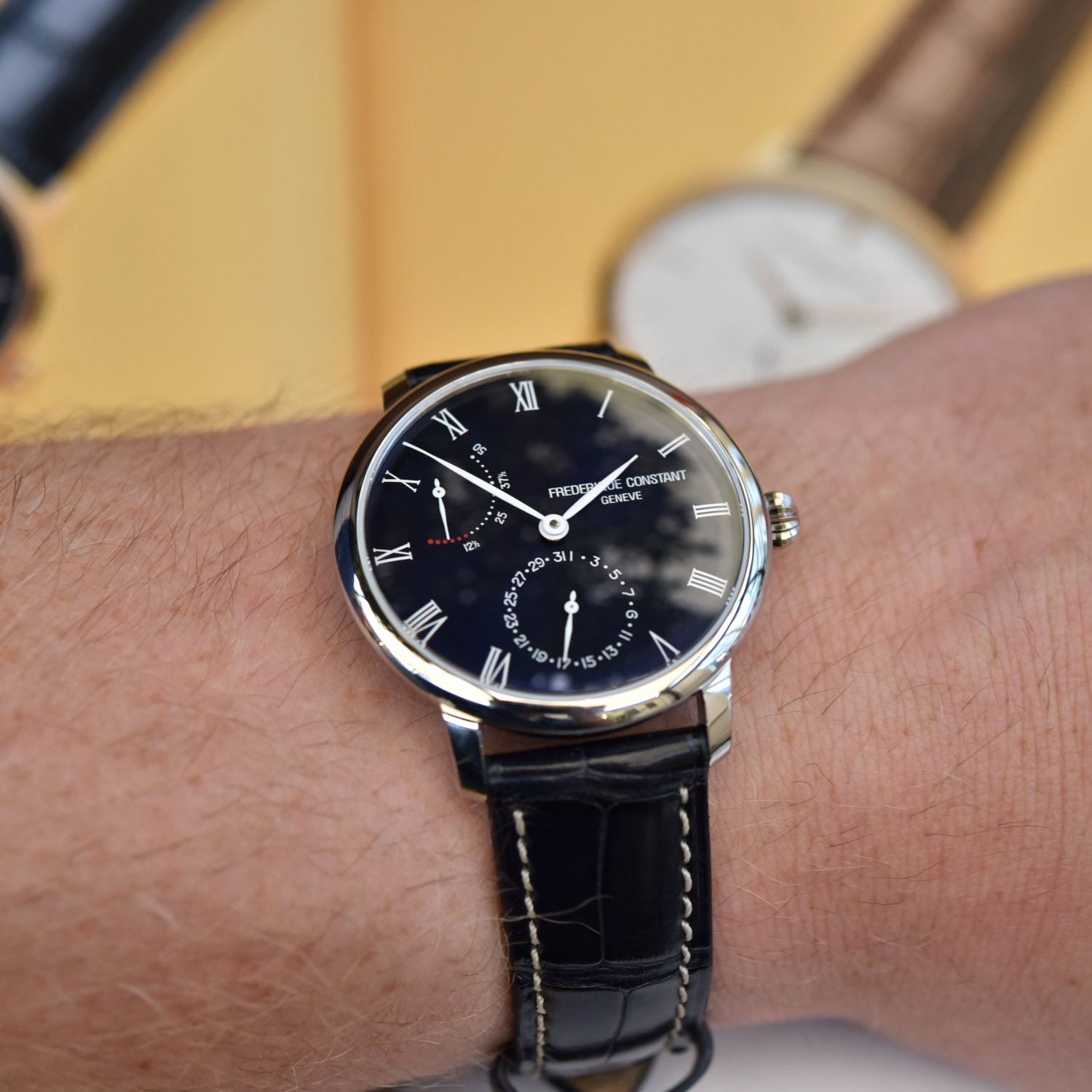 The Frederique Constant Slimline Power Reserve was presented a couple of years ago, and we spent some hands-on time with it. The Slimline is part of the Manufacture collection, meaning it uses an in-house developed movement. Frederique Constant relies on the vertical integration of the Citizen Watch Group it belongs to and is thus able to develop and produce manufacture movements at a staggering rate. The Slimline Power Reserve housed the company’s 28th manufacture calibre, and since then, the count is in the 30s.