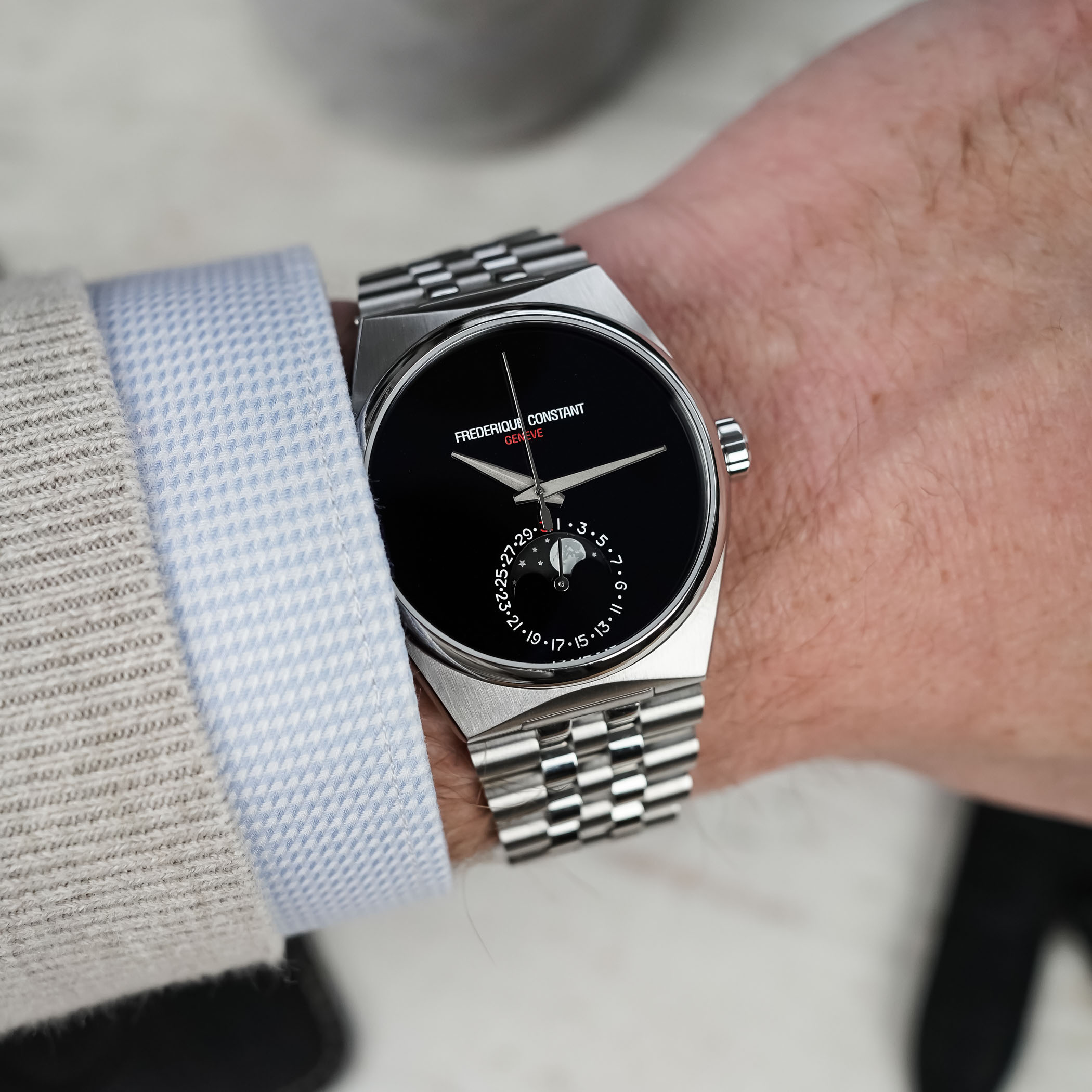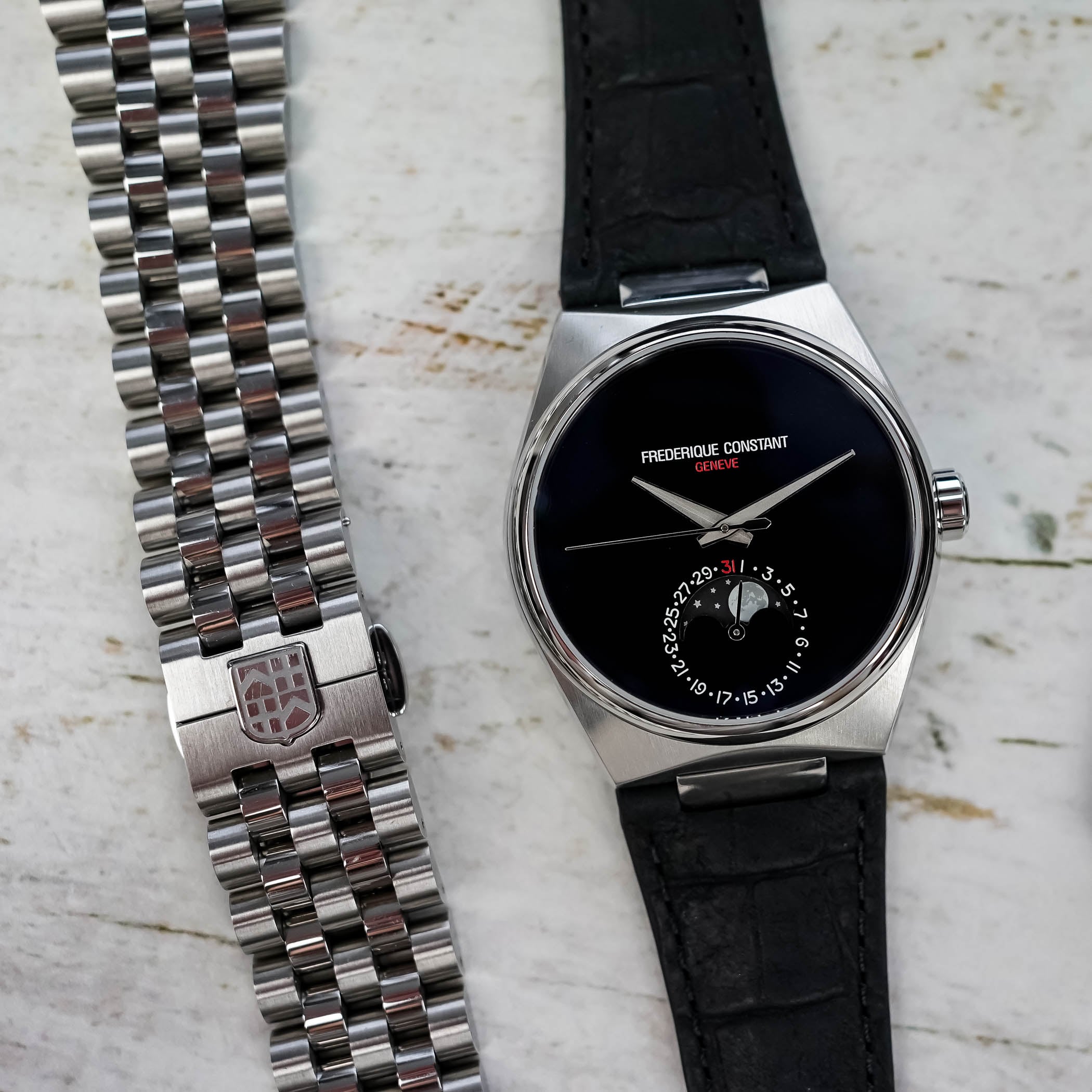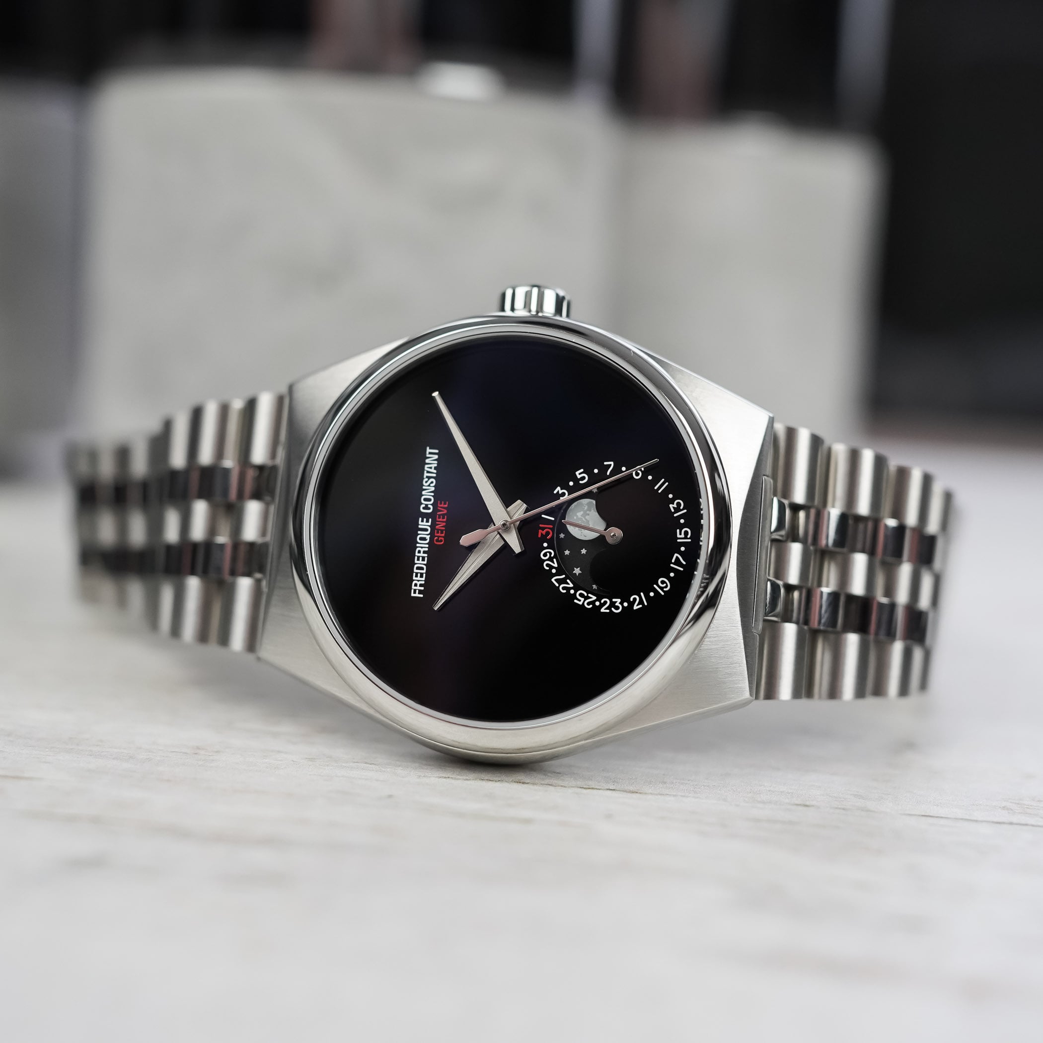 frederiqueconstant.timeandtidewatches.comFounded in 1988, Frederique Constant has gone from strength to strength with its policy of high-quality watches at affordable prices. Far from an empty catchphrase, the brand’s “accessible luxury” slogan materialised with the release of a perpetual calendar, followed by a tourbillon and a QP in steel, all with unbelievably restrained price tags. In 2020, FC expanded its classical, dressier offering with the Highlife luxury sports watch collection. With its contemporary good looks, robust build and integrated bracelets, the Highlife has gained a solid footing in the competitive luxury sports category, outpacing the brand’s original sales forecasts. And now our friends of Time+Tide have released this collaboration, an incredibly sleek, sharp and mysterious watch, the first Highlife to feature a moon phase, a Jubilee-style bracelet and an indexless dial.
