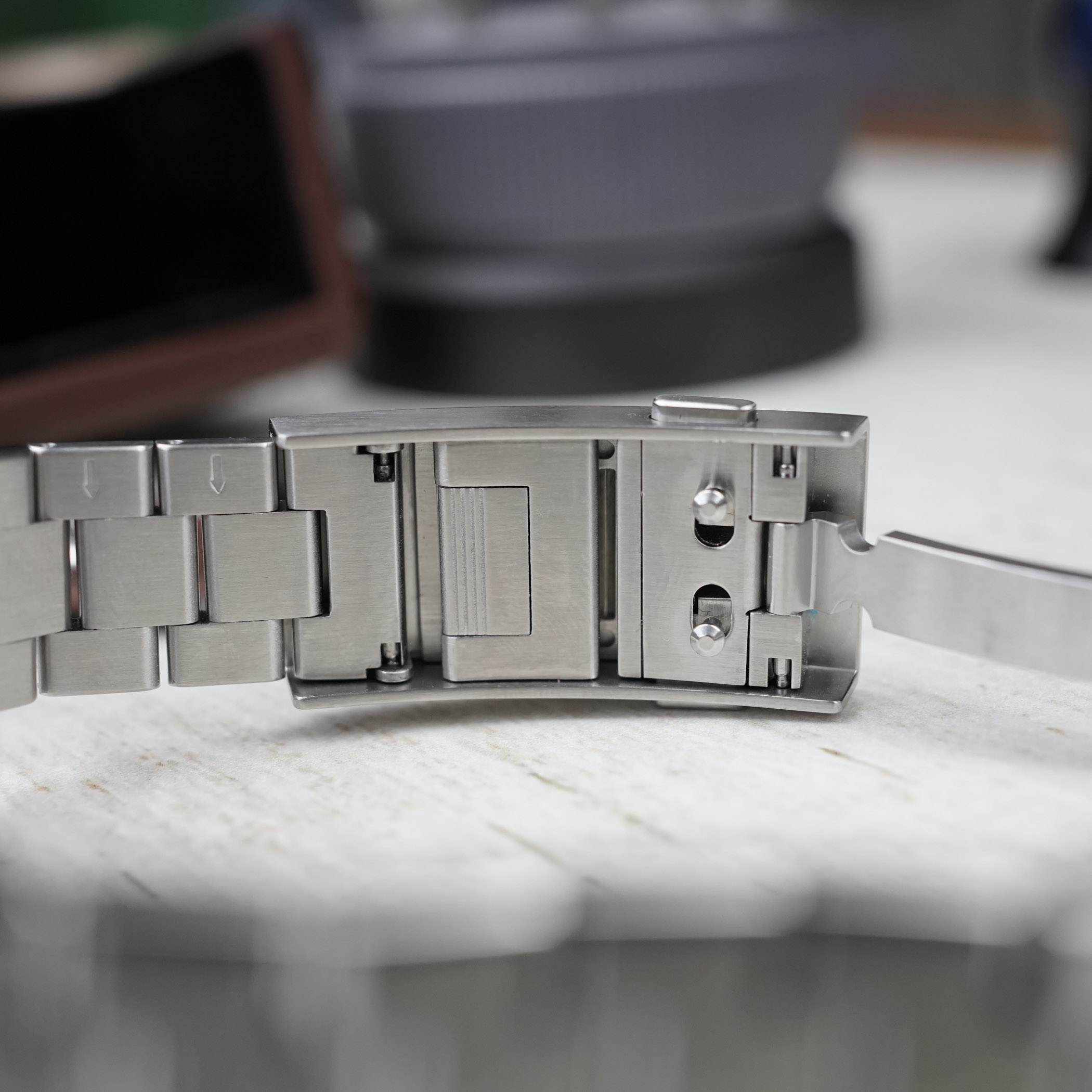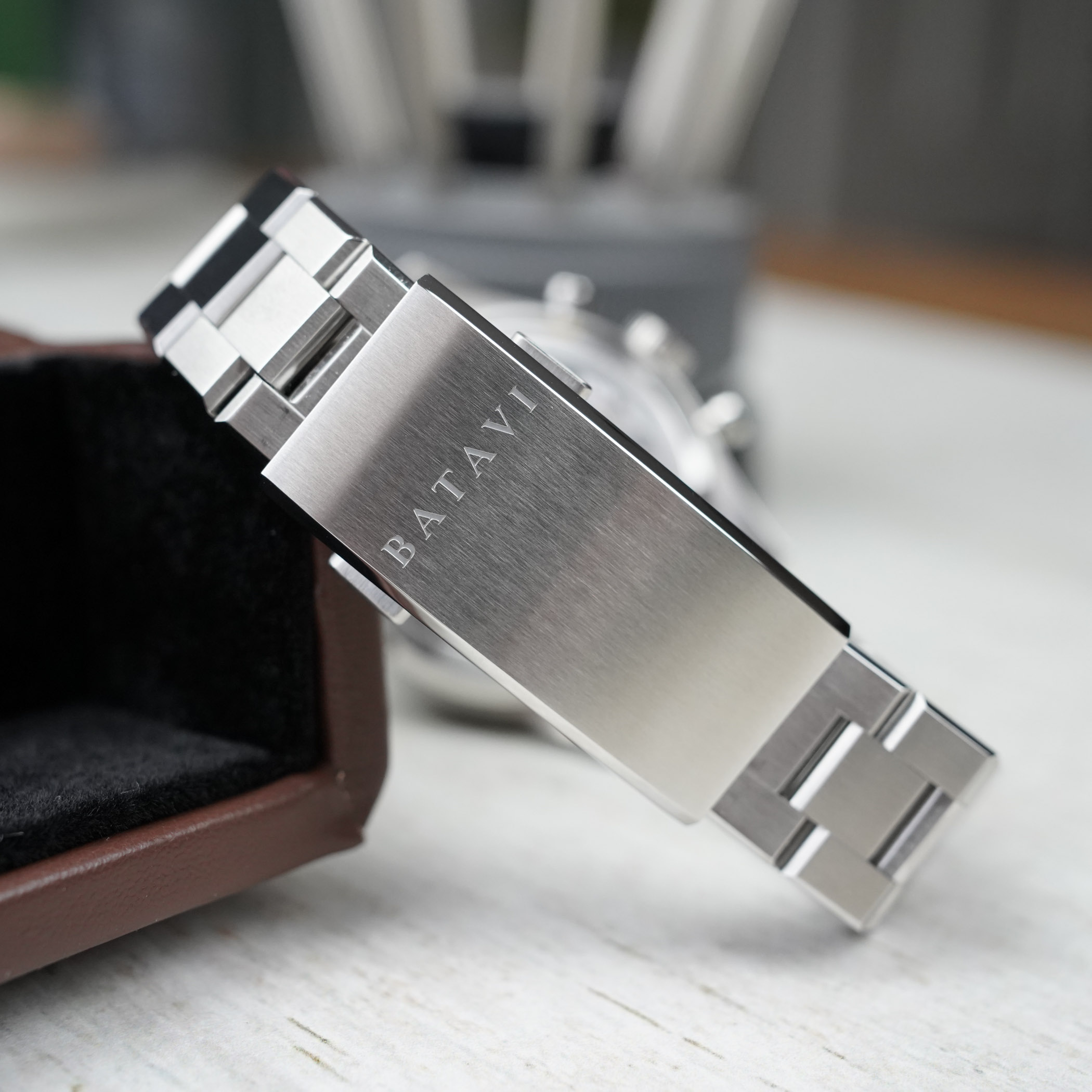 The stainless steel case is compact at 38mm in diameter, but to some might just be a bit on the tall side at 13.5mm in height (lug-to-lug is 46mm). That said, it wears very well on the wrist, and the dial design adds to the height, which is a worthwhile tradeoff. The Marina Chronograaf has classic chrono pushers at 2 and 4 o’clock with a signed push/pull crown at 3 o’clock. Water-resistance is 50 metres. A domed crystal protects the dial (with retro distortions at angles), and an exhibition caseback displays a well-decorated movement that belies the accessible price. A polished bezel and accents extend to the three-link bracelet, which features a signed folding clasp with tool-free micro-adjusting.