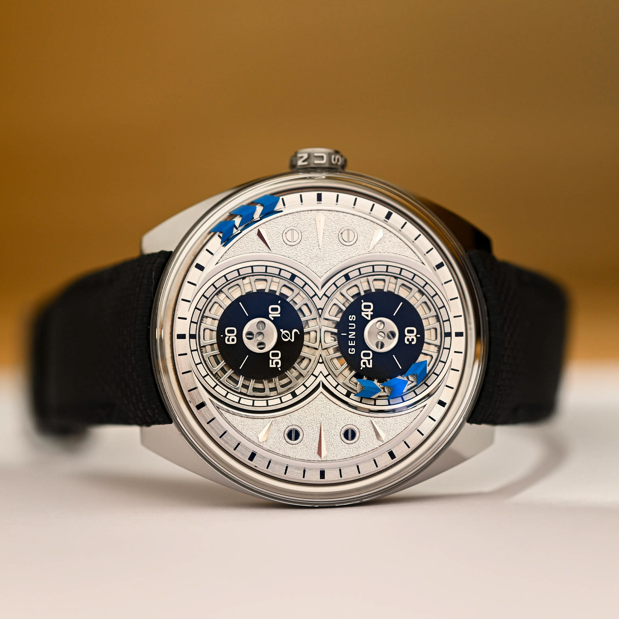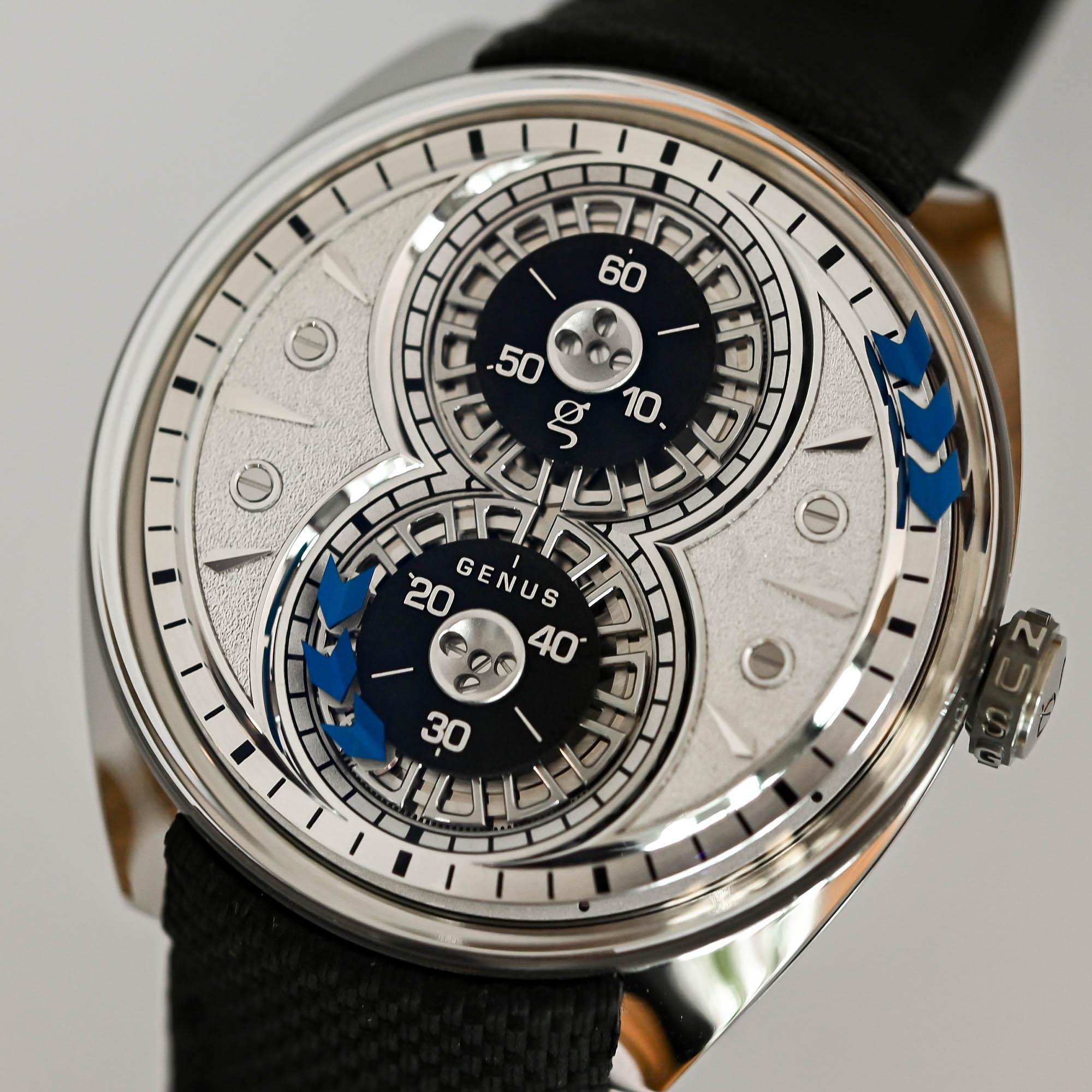 The 12-bodied caterpillar (genera) of the GNS1 has been shortened to three bodies with metallic blue arrows on its back. It still performs its spectacular figure-eight procession around the counters, but one thing lost in translation is the separate single-digit counter for exact minute readings (the brand insists that the leading arrow in the procession indicates the exact minute, but it is not as precise). This also means that there is less movement on the dial, but that is a good thing.