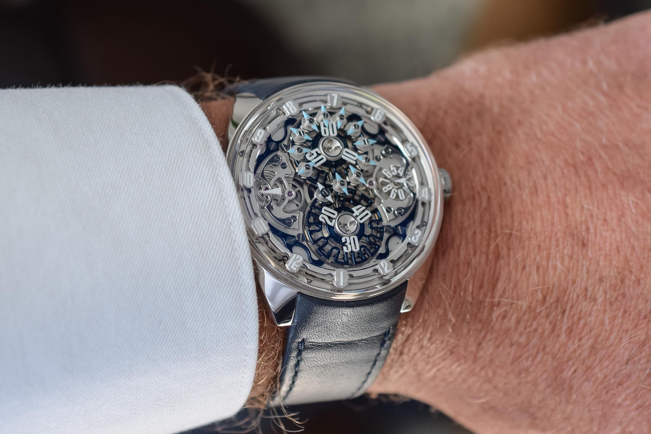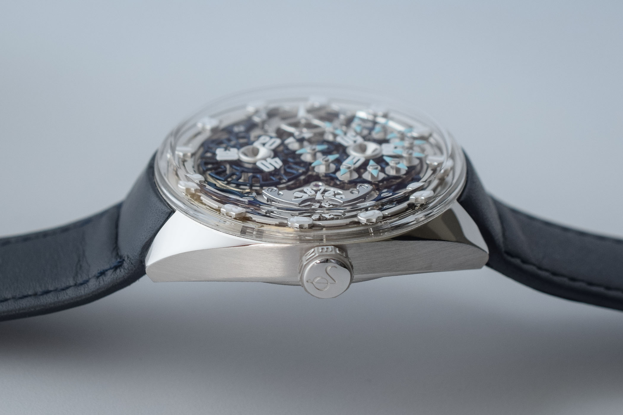 The Genus Watches GNS 1 is a limited edition of 8 pieces in white gold. The hand-sewn navy blue calfskin strap is integrated into the case for optimal comfort. It is secured to the wrist with a gold pin buckle. A folding clasp is available upon request. Price is set at CHF 148,000 excl. taxes.