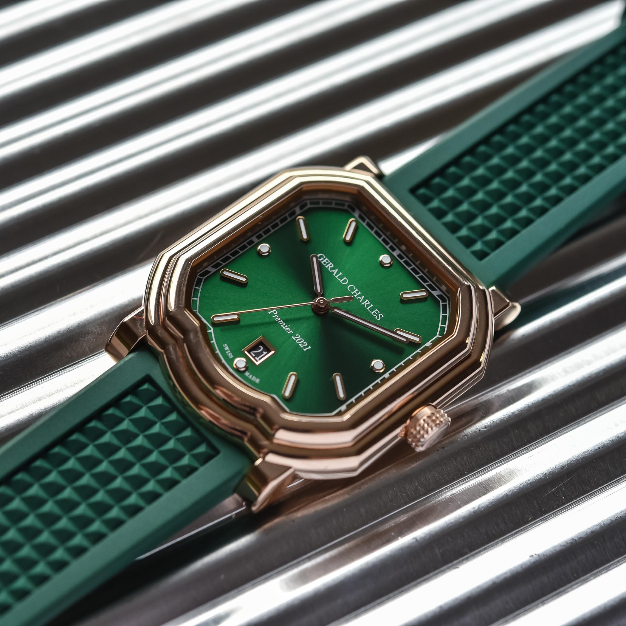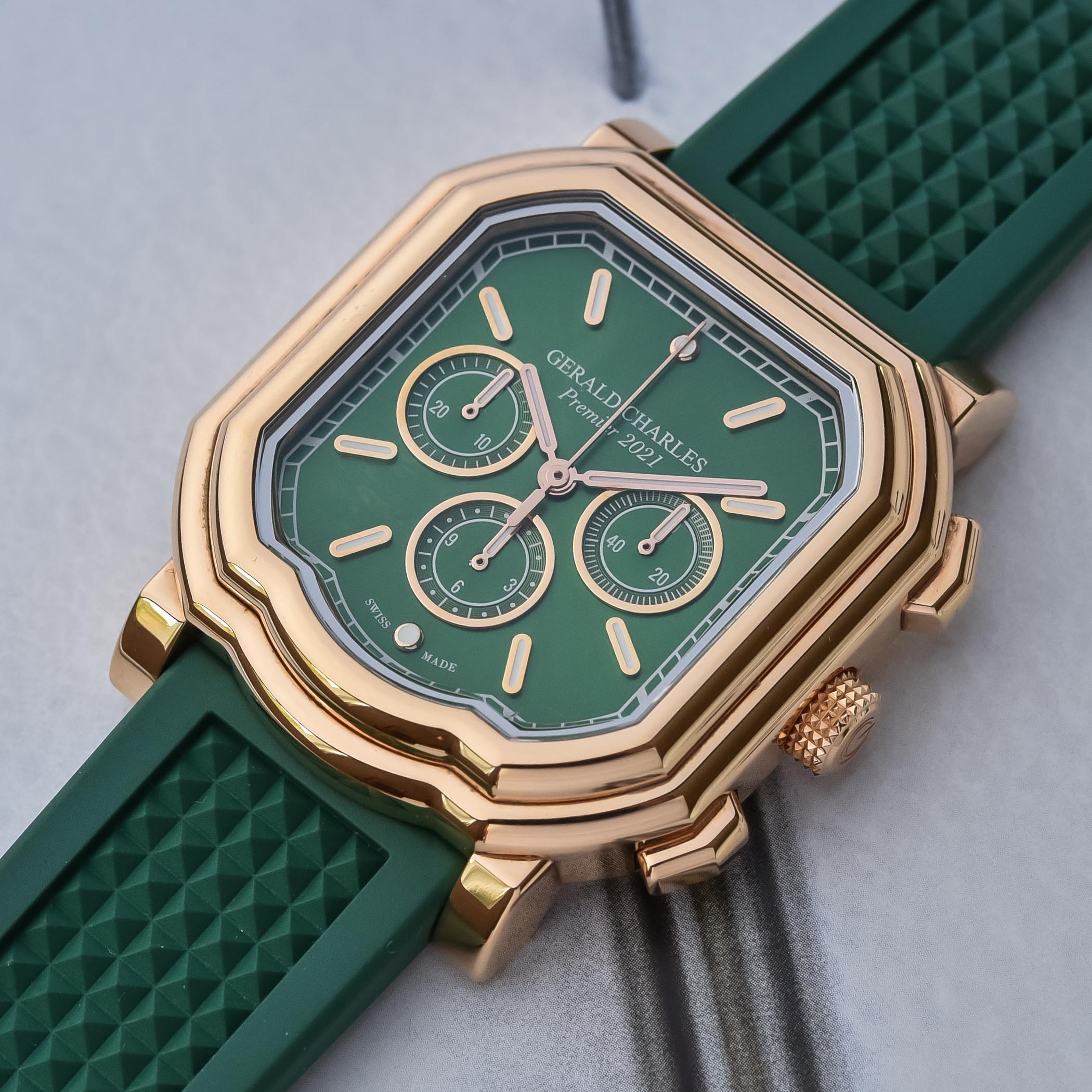 Now located in Lugano, the brand was backed by the Italian Ziviani family. Following Genta’s death in 2011, Federico Zivani decided it was time to revive the Gerald Charles brand. Last year, Gerald Charles reappeared on the watch scene with the resuscitation of a 2006 design in a distinctive 42mm stainless steel case known as the Maestro Anniversary. For 2021, the Maestro comes in two versions; an automatic time-and-date and a chronograph, both with vivid emerald green dials and rose gold cases.