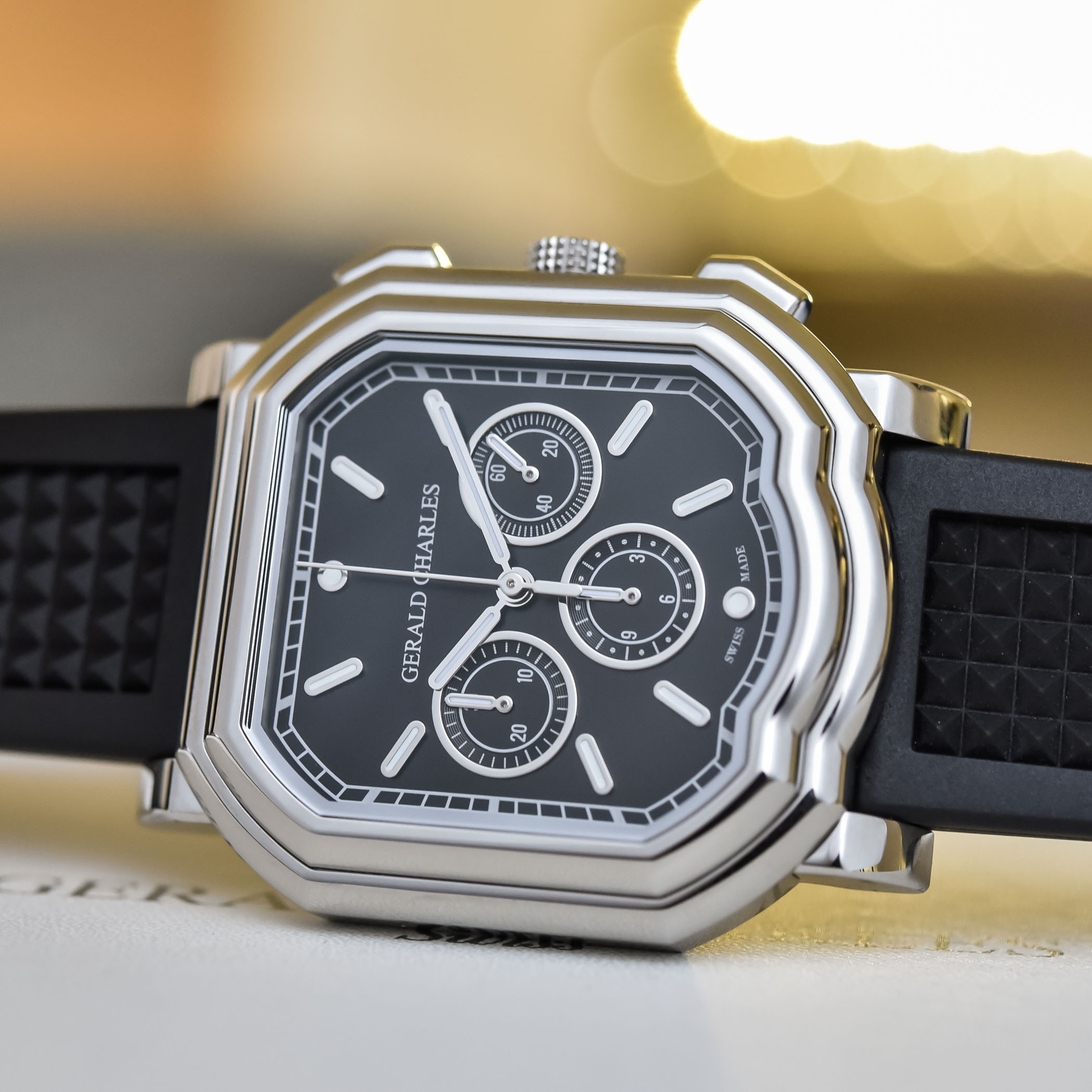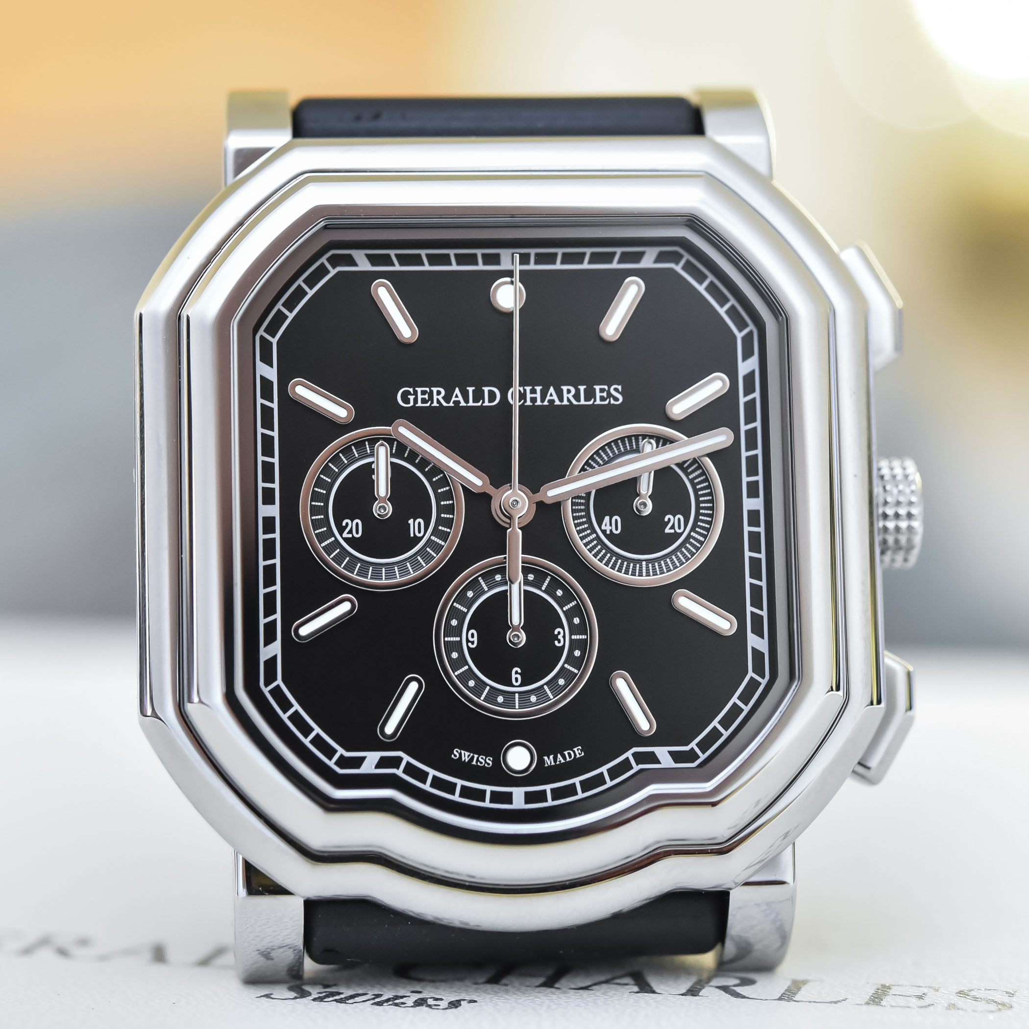 There are understated watches, and then there are statement watches, timepieces with abundant character that tower above your conventional round cases. Gerald Charles’s Maestro Chronograph is certainly a contender in this category. Gerald Charles was founded in 2000 by Gérald Genta, one of the most acclaimed and prolific watch designers of our time. His iconic Maestro timepiece of 2006 was revisited this year in the Maestro Premier 2021 launch, two high-end gold models that caught the eye of many aficionados. Following the success of the Maestro Premier 2021, Gerald Charles follows up with steel time-and-date and chronograph models with a choice of emerald green or black dials. A marriage of Gérald Genta’s flamboyant case design with sporty chronograph and water-resistance credentials, today we’re going to take a closer look at the Maestro Chronograph with a black dial.