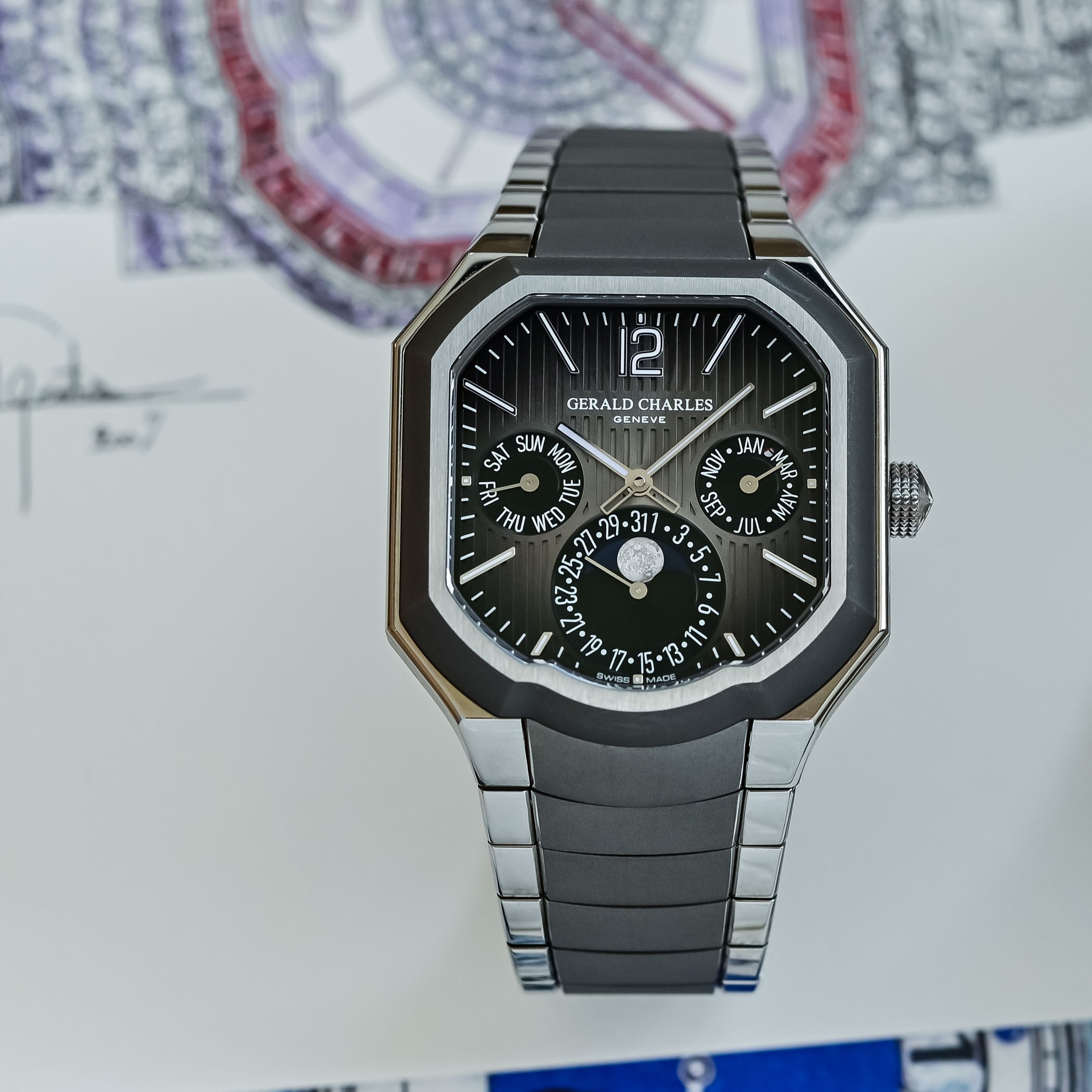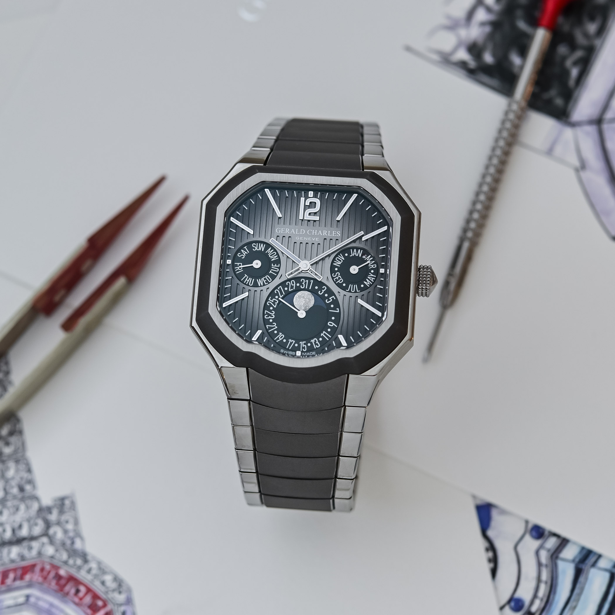 Gerald Charles is a name that traces back to the legendary Gérald Genta, widely regarded as one of the most influential modern watch designers. While his eponymous brand, Gerald Genta, was sold to Bulgari in 2000, Genta himself soon embarked on a new chapter, founding Gérald Charles as a more personal expression of his design philosophy. In 2011, the brand was revived by the Ziviani family, who built upon one of its distinctive creations: the Maestro. Since then, Gerald Charles has steadily evolved, notably with the Masterlink integrated sports watch in 2024. The brand has also introduced a range of complications, including tourbillons, chronographs, and jumping hours. Just ahead of Watches and Wonders 2026, the brand unveils what it describes as its most complex timepiece to date, a new interpretation featuring an original and compelling take on one of watchmaking’s most revered complications: the Masterlink Perpetual Calendar.