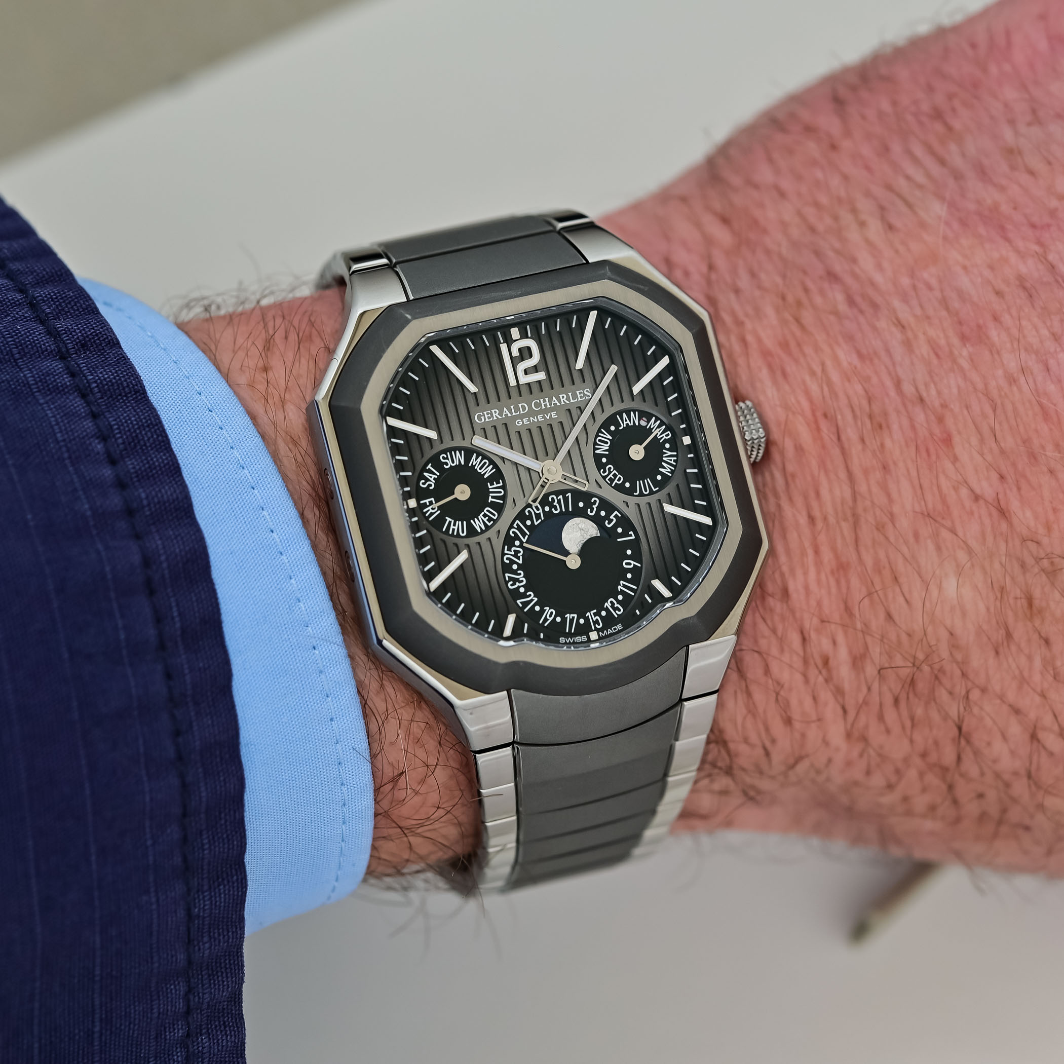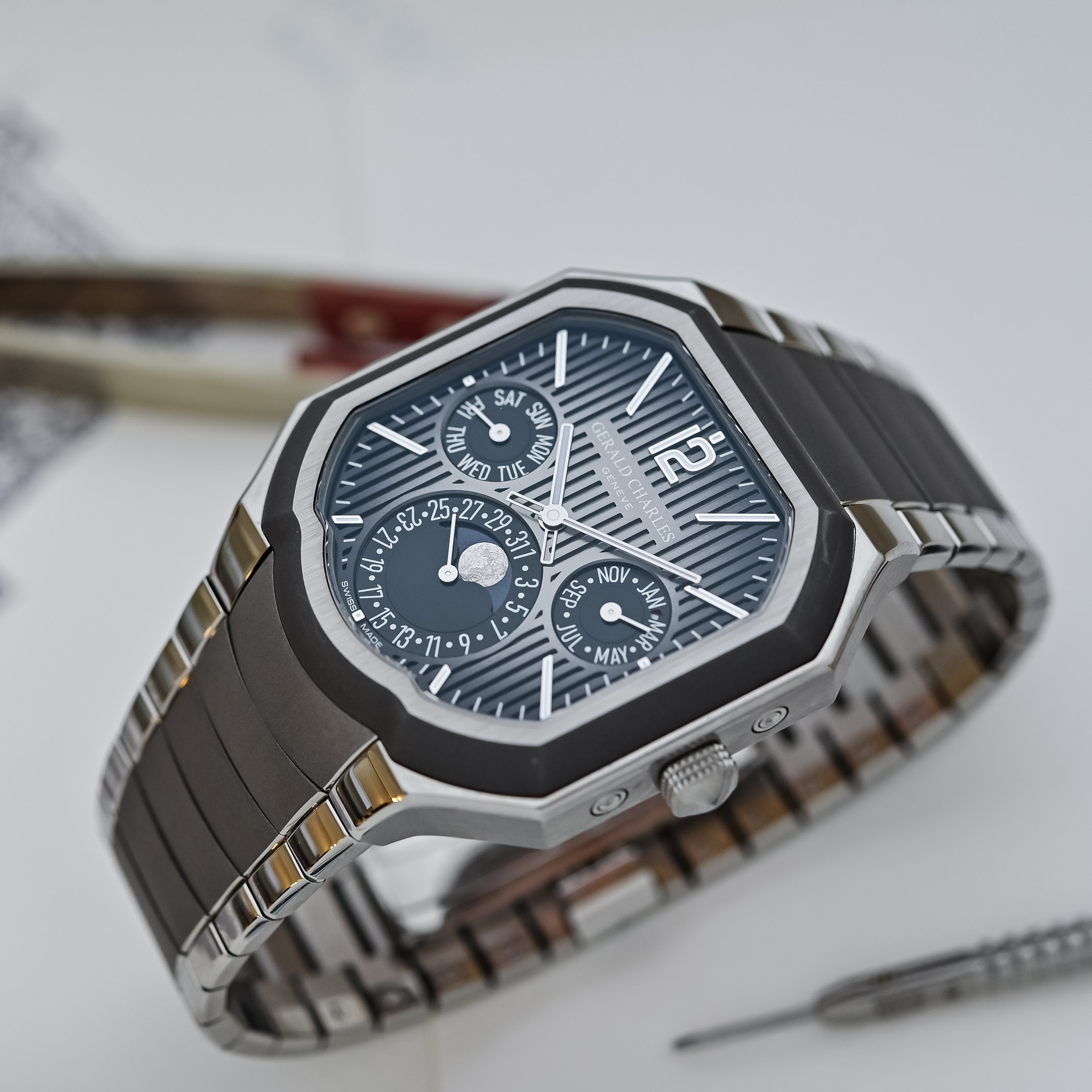 Perpetual calendars often feel like a cluttered puzzle… By crowding multiple indications into small, uniform sub-dials, these timepieces frequently become difficult to read at a glance. Traditional layouts often adhere to specific visual rules where symmetry and rigorous structure serve as the foundation for their complex display. In this regard, the new Gerald Charles Masterlink Perpetual Calendar is an interesting take on this classic complication; it breaks from convention with an intentional, asymmetrical design that prioritises the user’s daily needs. By featuring an oversized counter for the date – arguably the most vital information for daily wear – the watch acknowledges that you rarely need to check the current month. Meanwhile, the subsidiary indications necessary for setting the calendar are cleverly downsized. Interestingly, this asymmetry doesn’t feel chaotic; it is nicely balanced against the specific geometry of the case (with its signature smile at 6 o’clock), allowing the dial layout to sit with a sense of visual harmony.