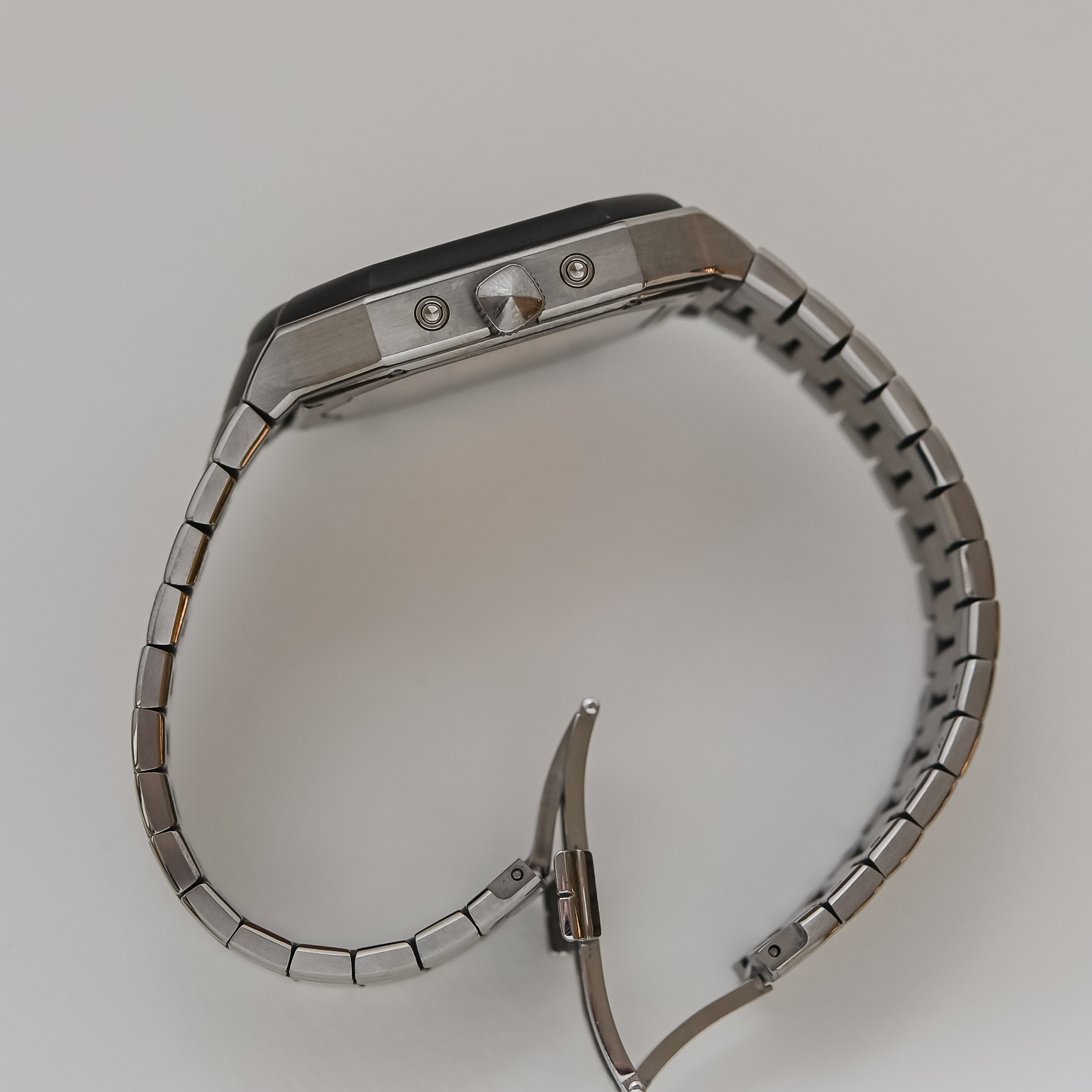 This distinctive interpretation of the Masterlink Perpetual Calendar is crafted from Grade 5 titanium, featuring a sophisticated 40mm diameter that strikes a balance between modern presence and wearability. This lightweight construction, based on the time-only Masterlink, which includes a matching integrated titanium bracelet, brings its total weight to just 95g. At 10mm, the watch is slim enough to slip under your cuff, yet its architectural lines ensure it commands attention the moment it is out. The case and bracelet combine polished and matte surfaces with a special sandblasted finish that the brand calls Darkblast, resulting in a soft, velvet-like touch that feels almost like rubber. The watch is also water resistant to 100m despite its shaped design and its 4 correctors.
