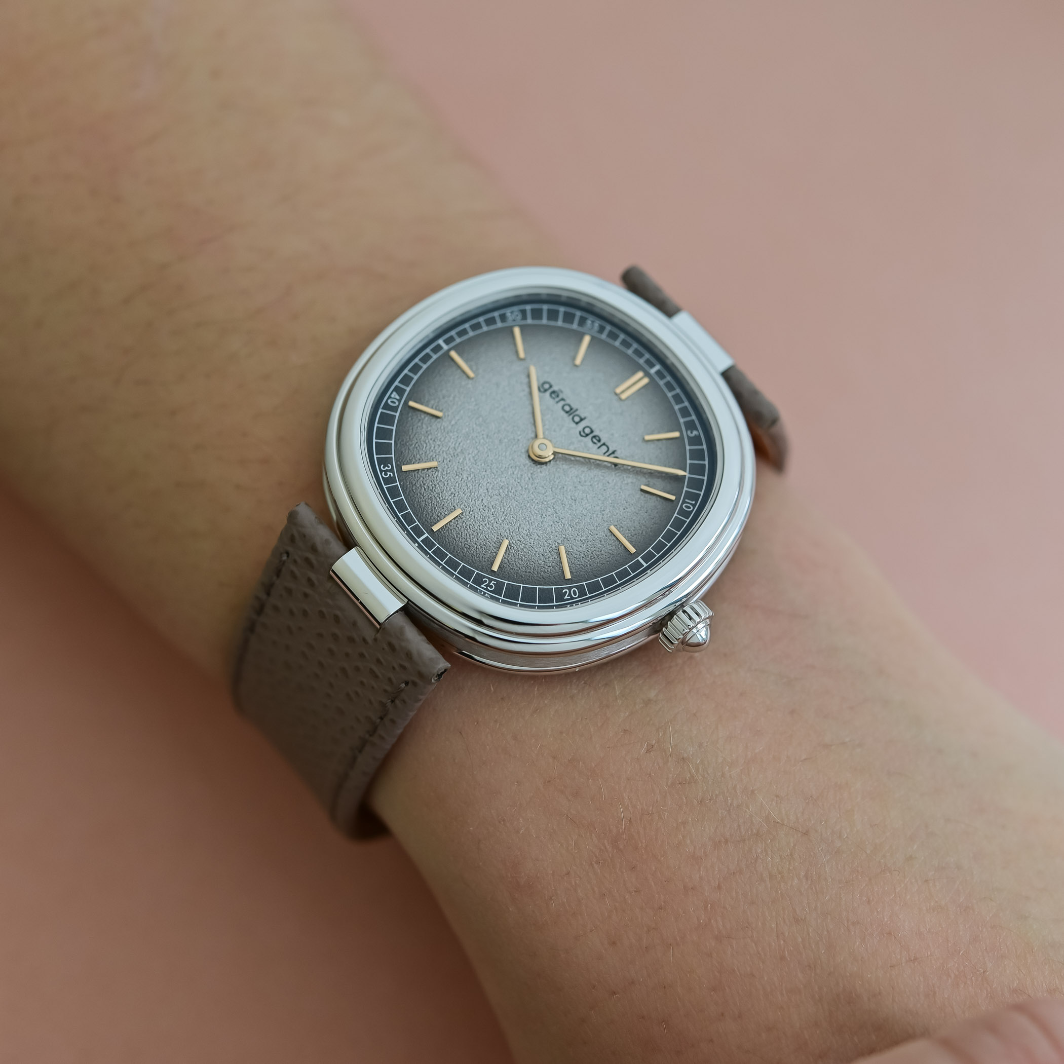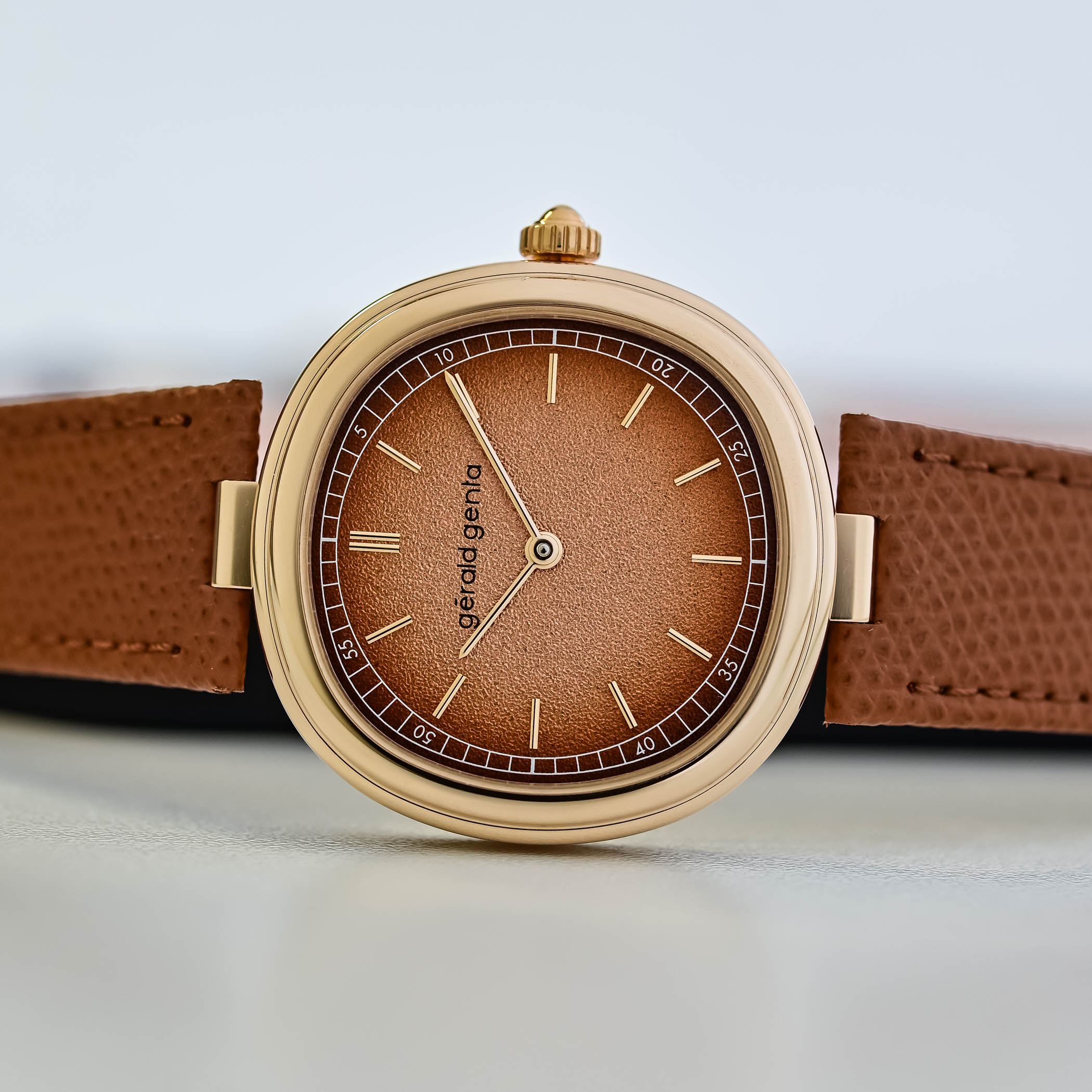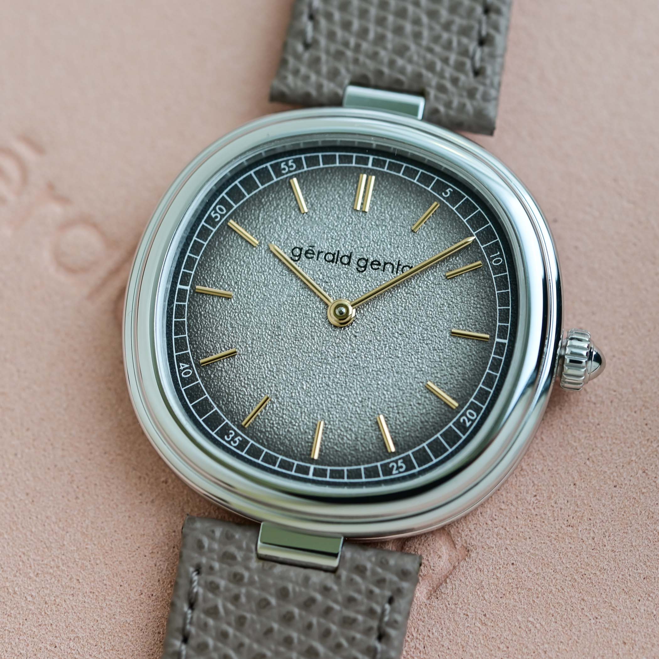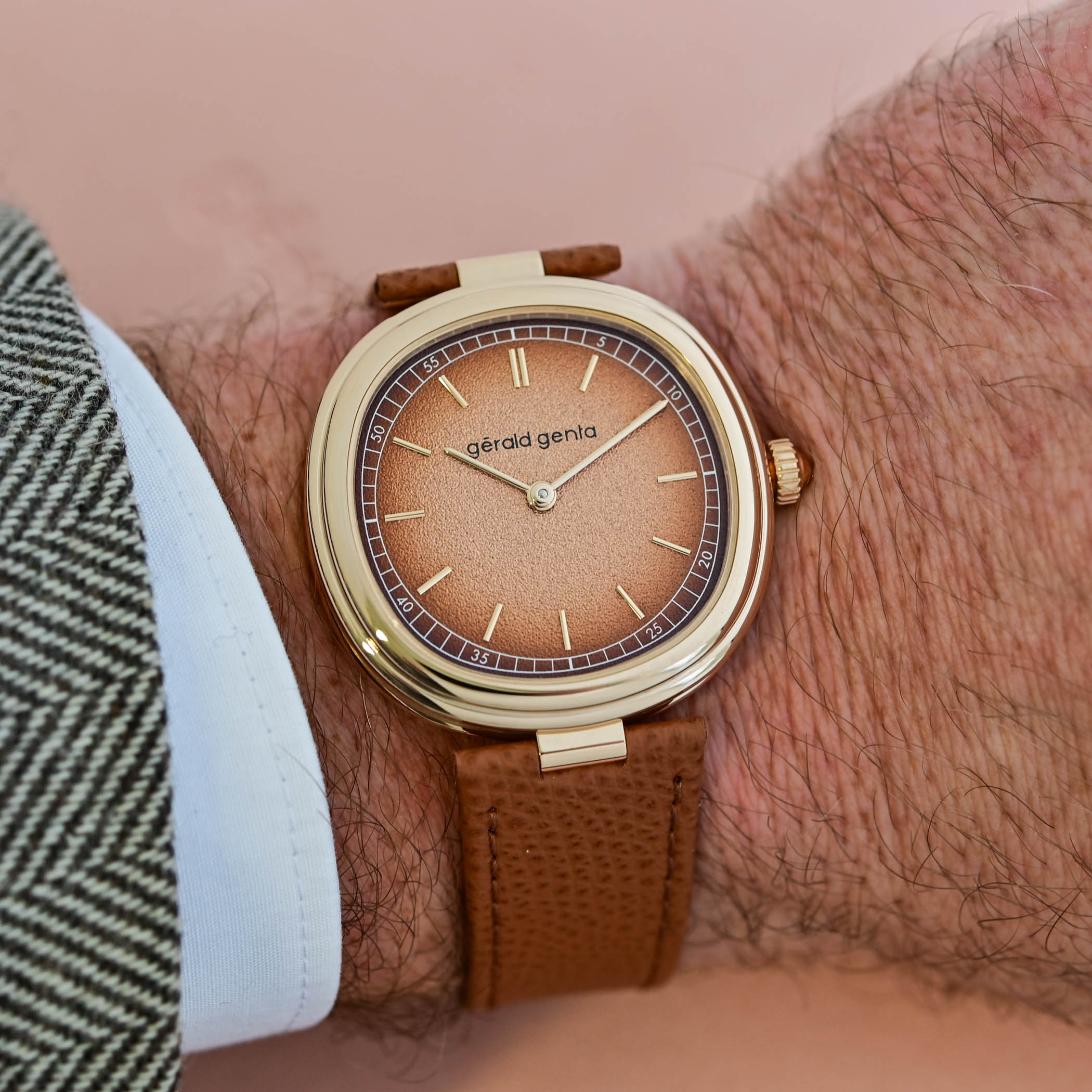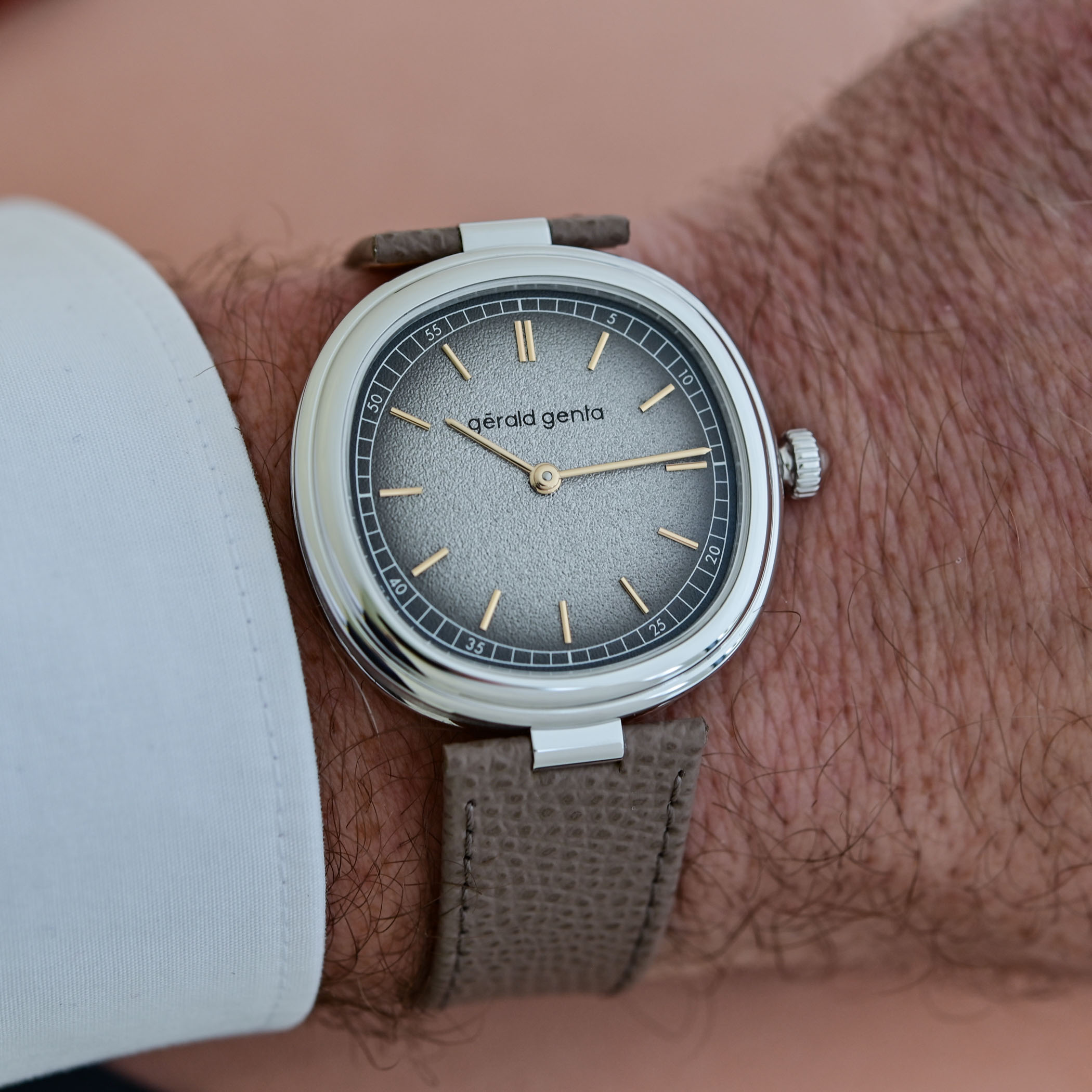 Gérald Genta offers two variants, in rose or white gold. The Geneva Time Only Marrone has a warm, monochromatic appearance, and comes in a 4N rose gold case with a smoked brown dial with tone-on-tone rose gold hands and indices. The Geneva Time Only Grafite uses a white gold case with a silver-grey dial, with rose gold hands and markers, offering a cooler expression of the same design. The two-segment grained brass dial reinforces the collection’s interplay of geometry. The outer minute track follows the soft cushion outline of the case, while the inner track is circular, creating a pleasing optical effect from different angles. The polished and rounded hands with subtle arrow tips complete the functional beauty.