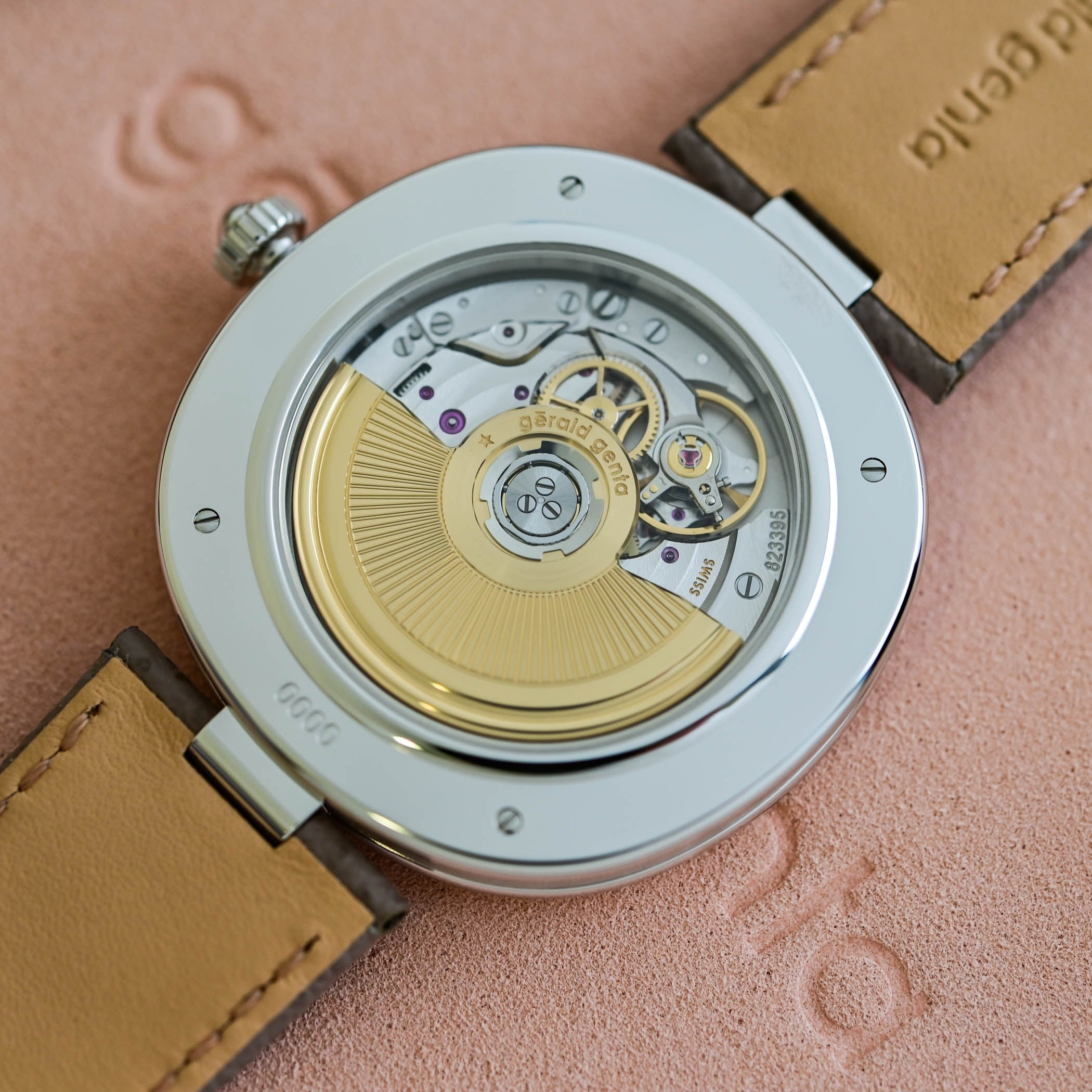 The Gérald Genta Geneva Time Only is powered by the calibre GG-005P, developed from the Zenith Elite 670 and reworked by La Fabrique du Temps for Gérald Genta. The automatic movement, also used in the Gentissima collection, and visible through the sapphire crystal caseback, comprises 158 components and operates at 28,800 vibrations/hour with a 50-hour power reserve. The rotor has been redesigned exclusively for this collection.