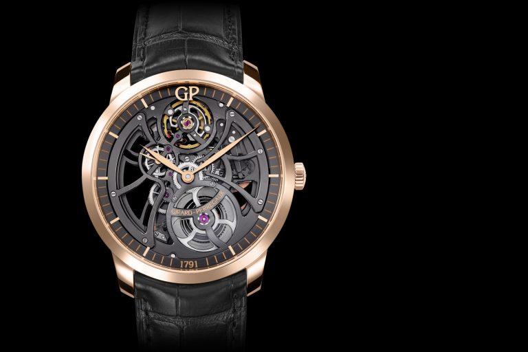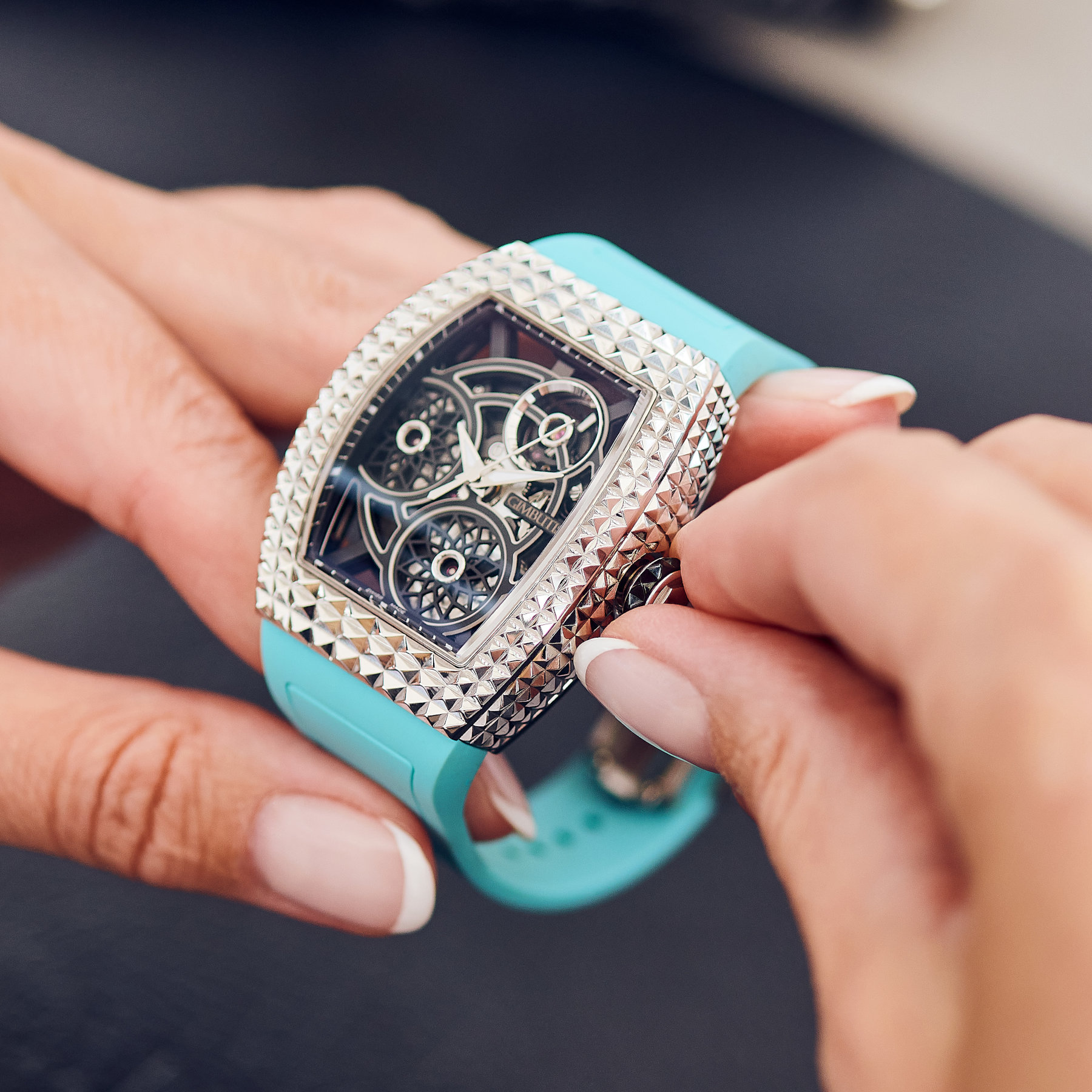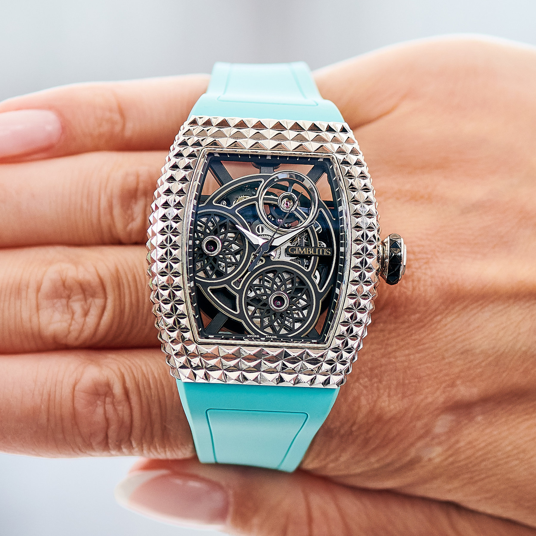The Gimbutis Avantgarde Pinecone Skeleton white gold is presented on a light blue integrated tapering rubber strap that, together with the curvature of the caseback, ensures a snug fit. It is secured to the wrist by a white gold folding buckle. The model is released in an exclusive limited edition of five pieces only that are ‘handcrafted in Geneva’. All told, the watch is an original statement in craftsmanship and assertive design. The price is set at EUR 39,770.