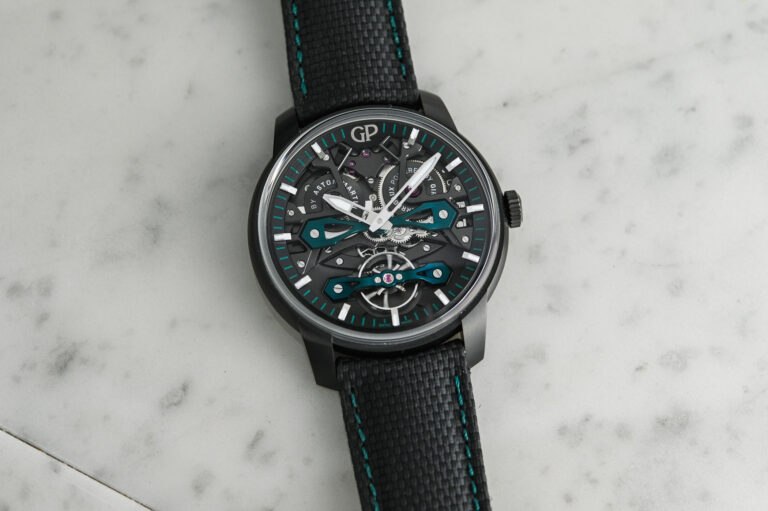 Hidden beneath the screwed caseback engraved with Aston Martin’s winged logo is the automatic GP03300 movement with a frequency of 28,800vph and a 46-hour power reserve for the time and date functions. A green FKM rubber strap with a fabric effect and a titanium folding clasp with micro-adjustment highlight the sporty character of the watch.