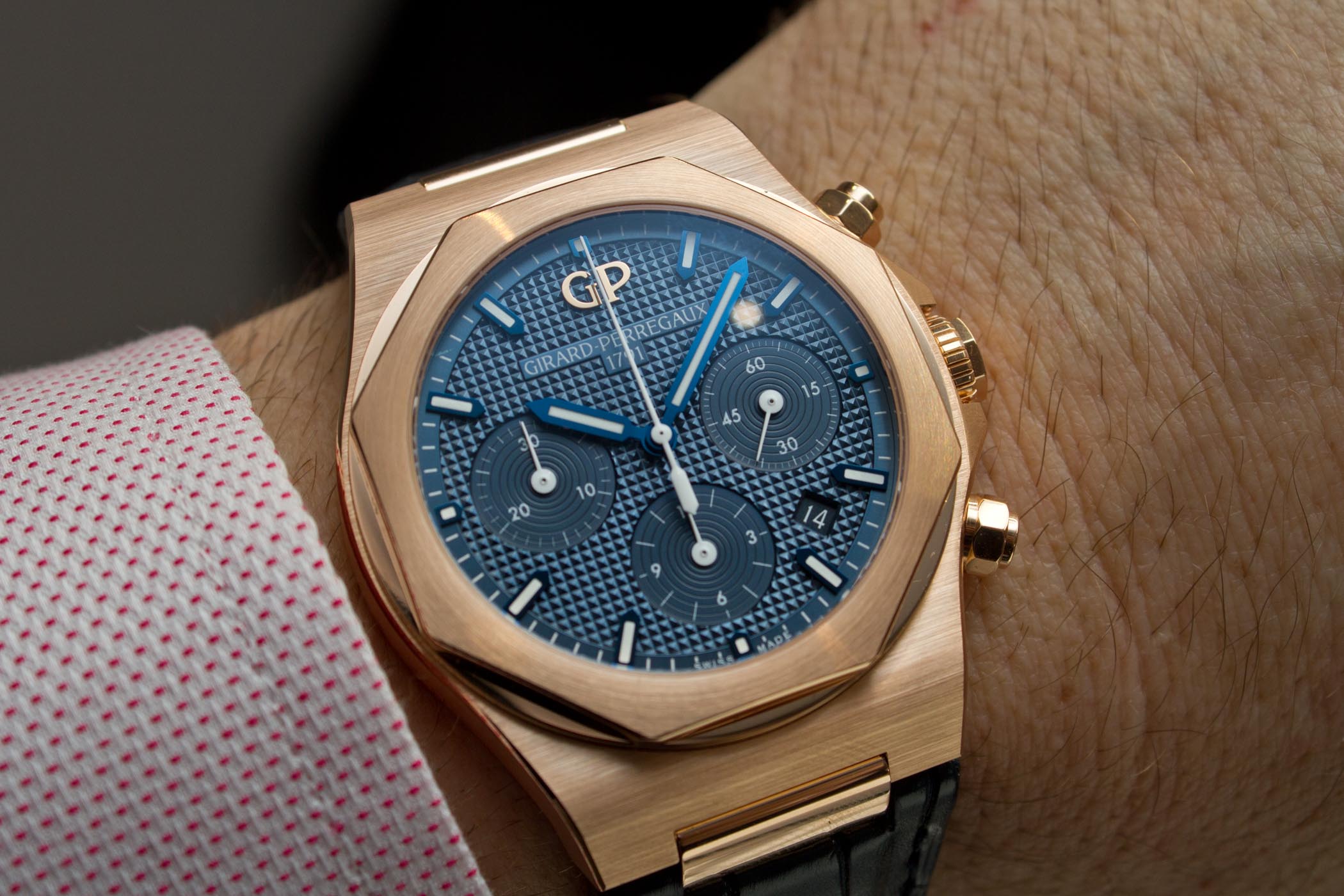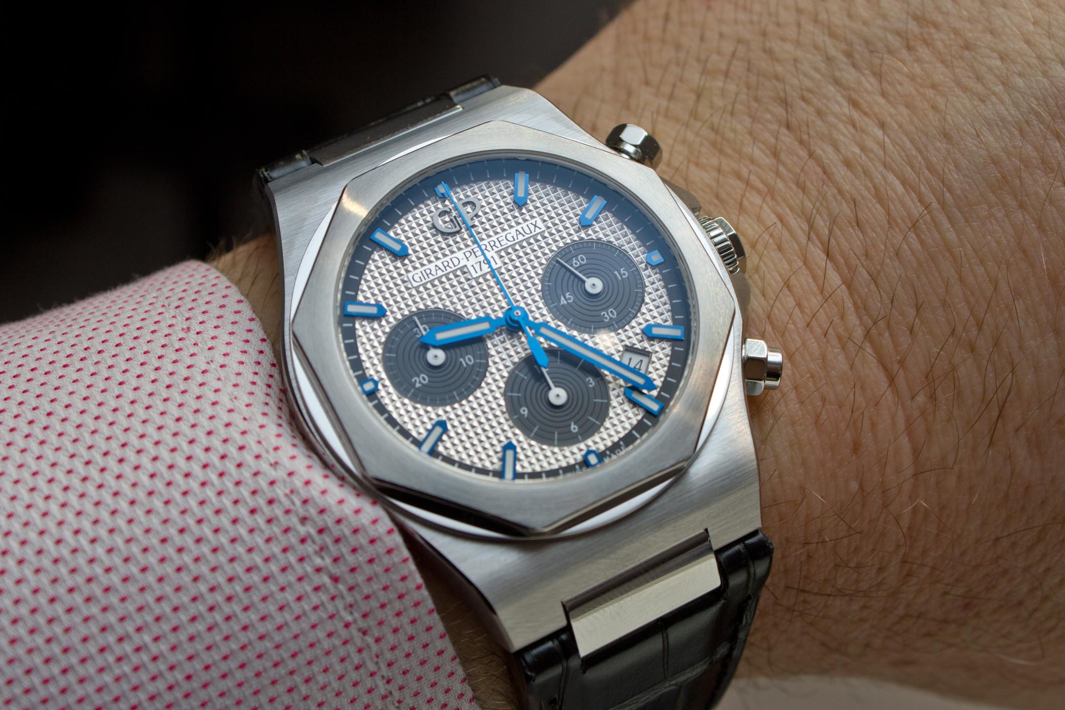 There is a wide variety of dials on the Laureato Chronograph collection: black and white “Panda”, black with blue sub-dials, and two tones of blue. Any of the combinations work just fine, so it is more a question of personal taste – whether you want to make it sportier (the Panda look) or dressier (the black and the blue). The base of the dial is made of a stamped Clous de Paris pattern, which looks well-executed even under a magnified close inspection. Let’s not forget that Girard-Perregaux’ decorations have always been excellent.