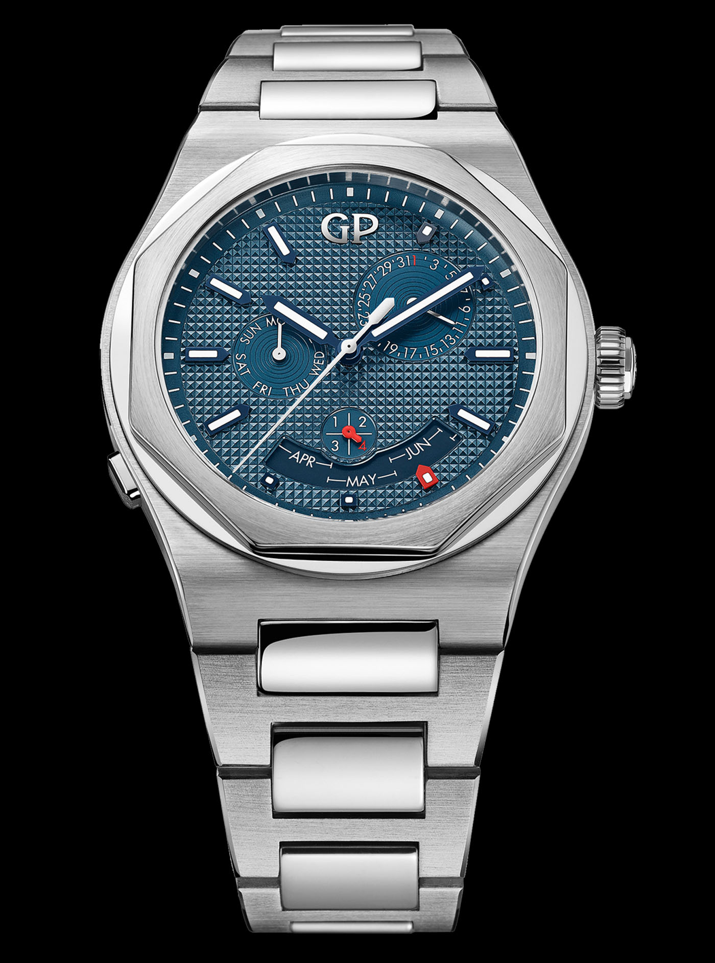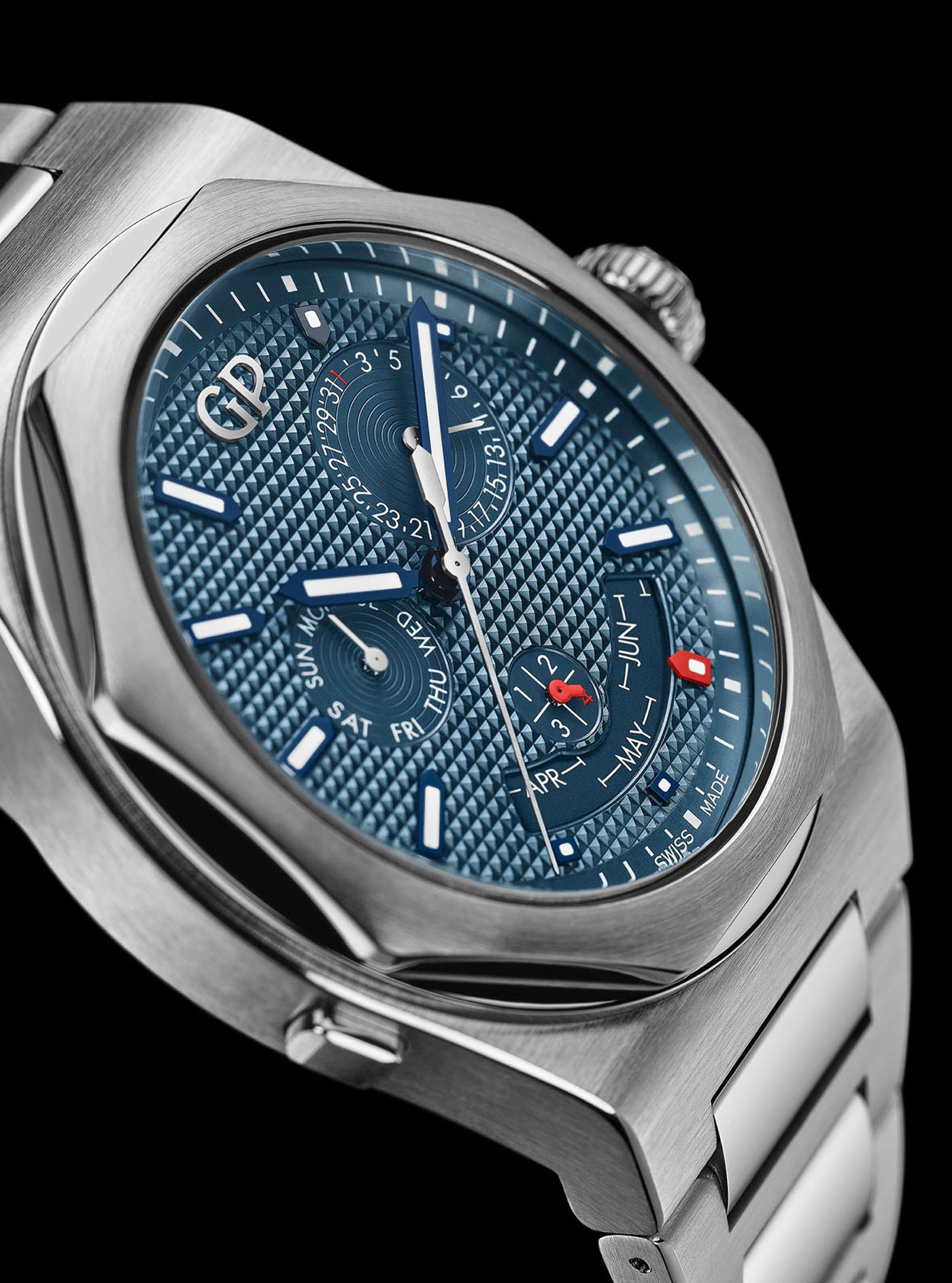 The dial also sticks to the usual codes of the collection. The Girard-Perregaux Laureato Perpetual Calendar is now presented with a blue dial – and again, other variations might be introduced down the line. The dial relies on the same “Clou de Paris” pattern found on all the Laureato models and shows tone-on-tone blued steel indexes and hands – both filled with luminous paint. Several touches of red (leap year hand, 1st day of the month and the indicator for the current month) give the watch an extra twist.