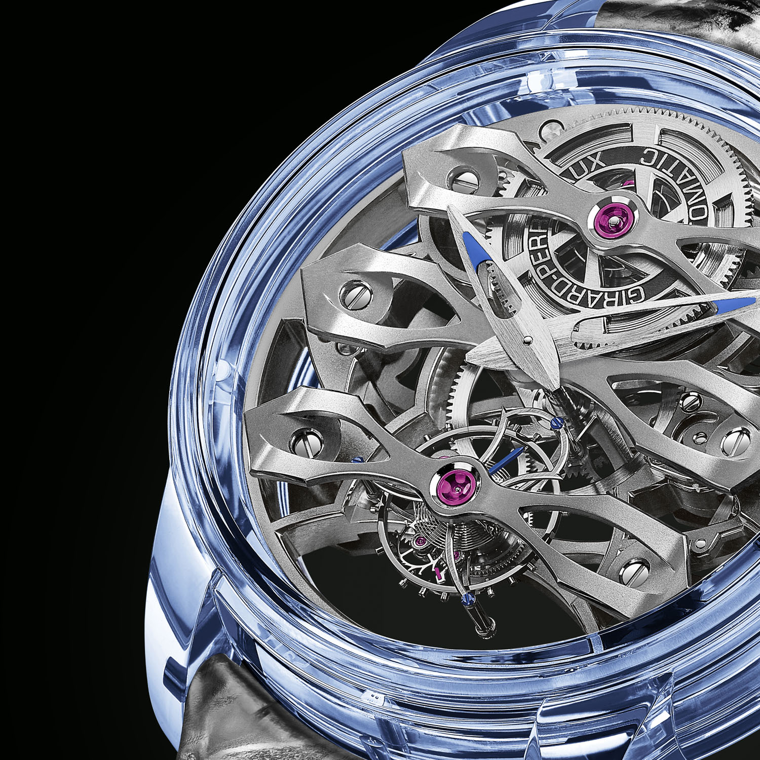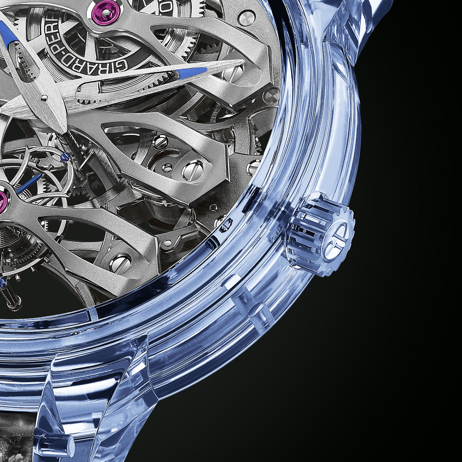 The Tourbillon with three bridges holds a unique place in the history of Girard-Perregaux and in the history of watchmaking. The Quasar Azure honours this legacy by engineering transparency to the extreme. Measuring 46mm in diameter, its blue sapphire case is machined from a single block of sapphire that is meticulously polished to perfection. With its twin box sapphire crystals, it is built to maximize the view of the architectural skeletonized calibre – that is itself based on the principle of transparency.