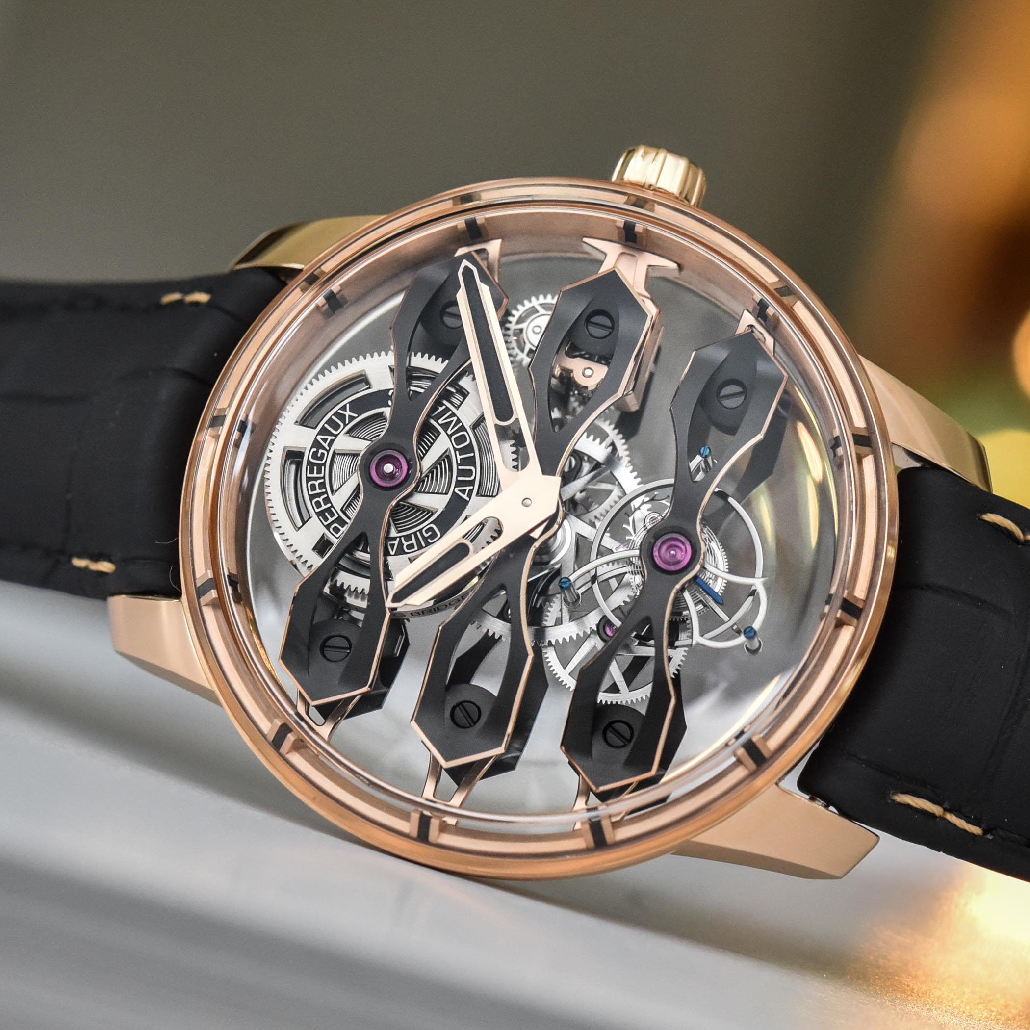 Time is indicated with skeletonized Dauphine-style hands, almost floating freely over the completely openworked movement underneath. To keep the view of the openworked movement as uncluttered as possible, the hour markers are attached to the inside of the case band. The absence of a bezel and the use of boxed sapphire crystals allow for an unimpeded view of the automatic movement.