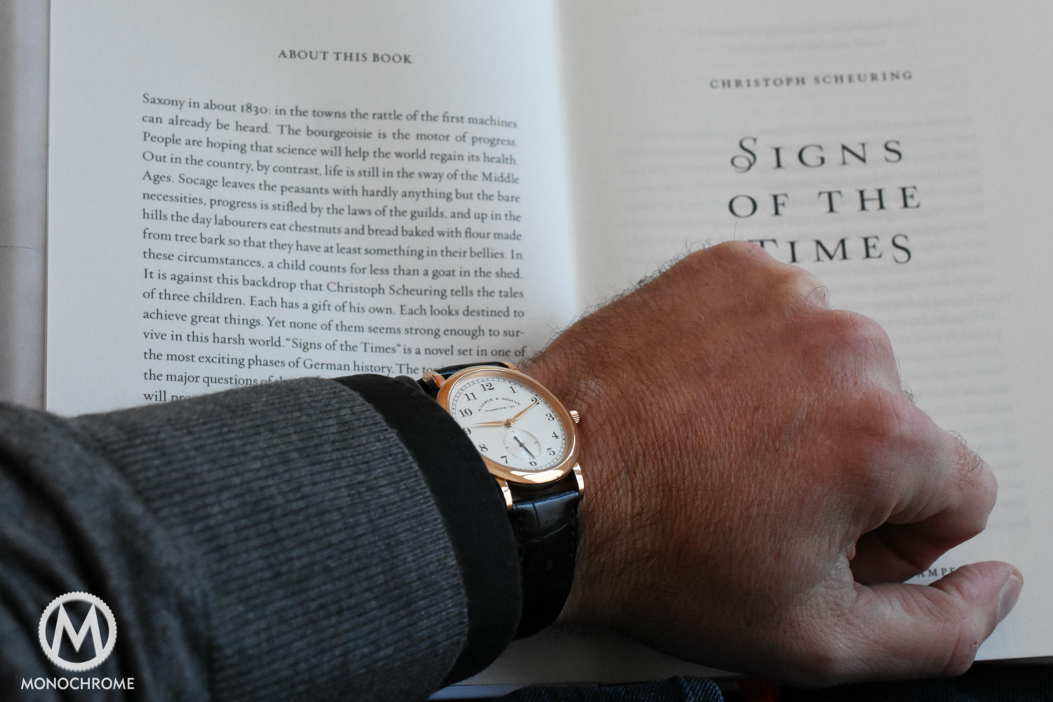 Time for the next give-away on Monochrome to celebrate our 10th anniversary, and this time we can give away 5 sets from A. Lange & Söhne. The beautiful German watch brand, who just launched the renewed Lange 1 Moonphase Day/Night, provided us with 5 x the book “Sign of the Times”, 5 x a Lange notebook and 5 rollerballs.