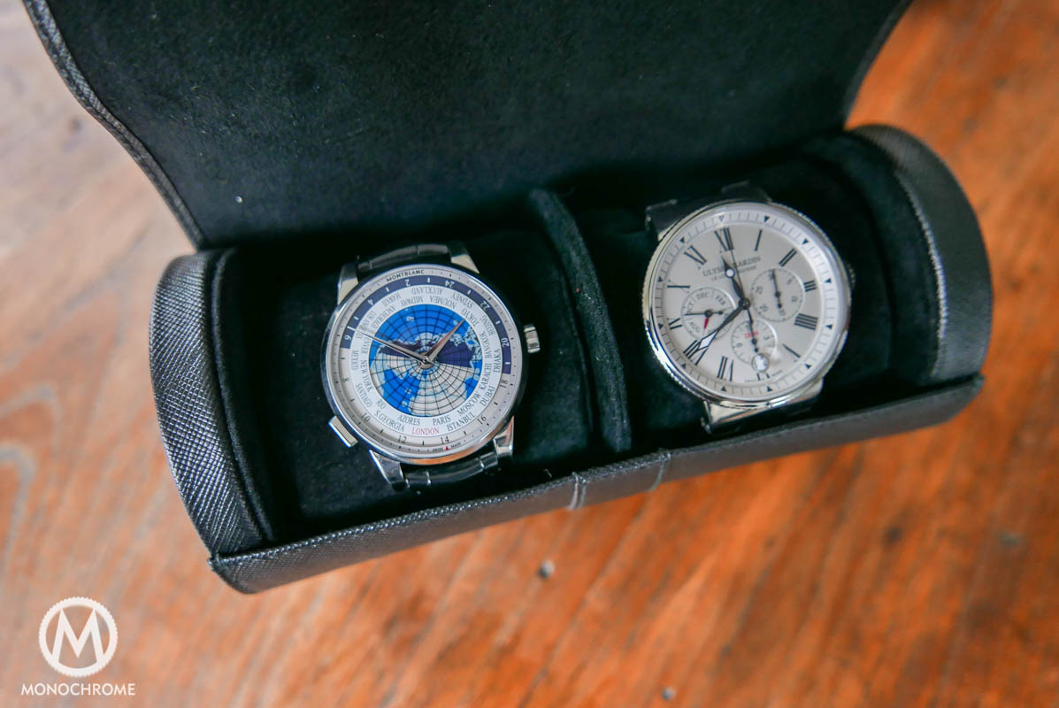 One of the coolest things for this year, is that we can give away lots of great presents. OK, we’re celebrating our 10th anniversary. However it’s the brands that we cover here on Monochrome that chip in and donate these great presents, which we can share with you guys! After some amazing gift that we already send to twelve of you (10 Meistersinger desk clocks, one Ophion wrist watch and a Panerai book), the next gift -a stunning Ulysse Nardin wall clock– will be shipped as soon as we received the shipping data of the winner. Now it’s time to give away a very nice travel watch roll, made by, and made available by, Montblanc.