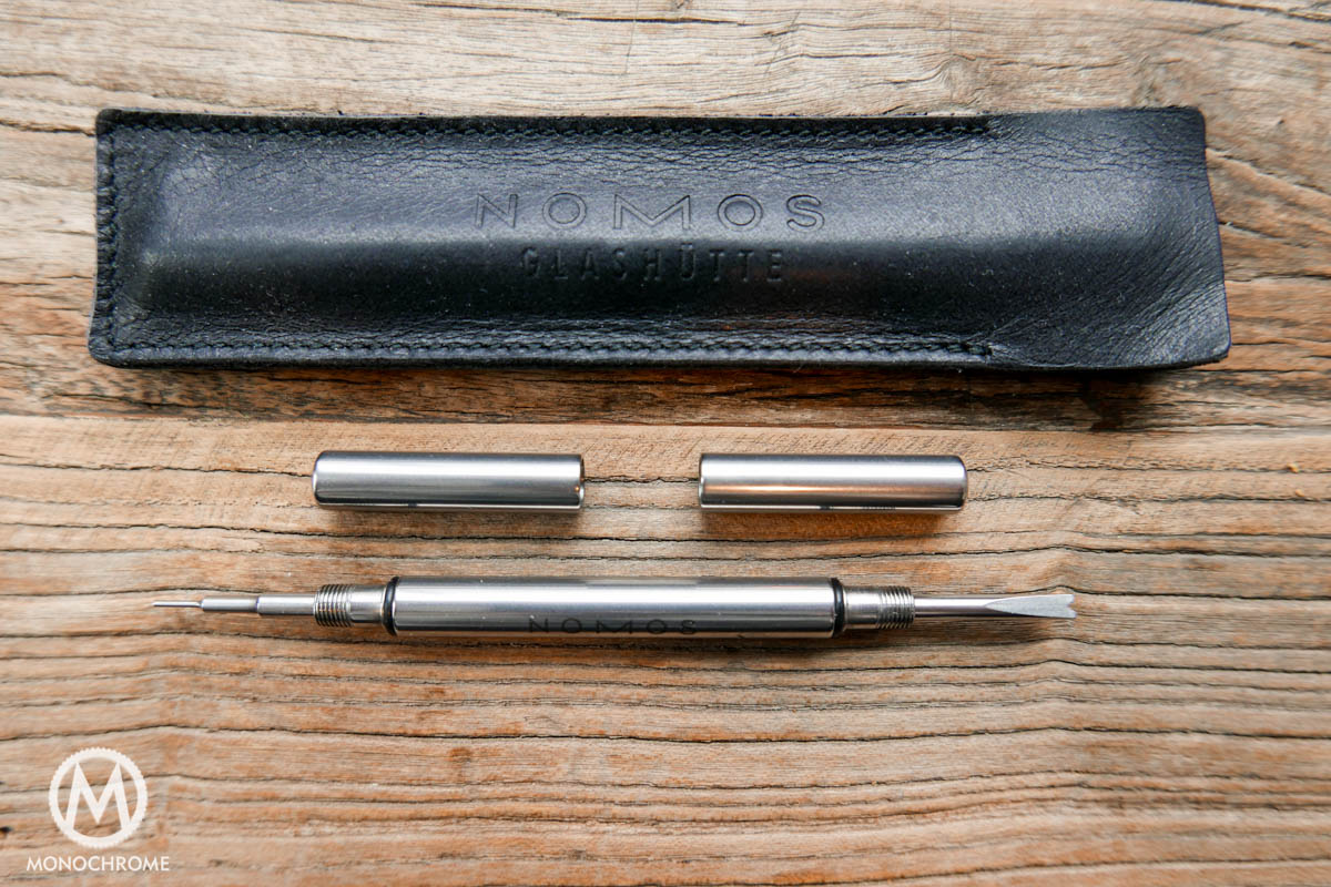 Next is a Nomos goodie bag, containing an enveloppe with product photos, a very nice Nomos pencil, and a tool for changing straps. The pencil is great for daily use, and handy to bring along for business meetings, traveling and to have in your coat’s pocket for whenever it could come in handy.