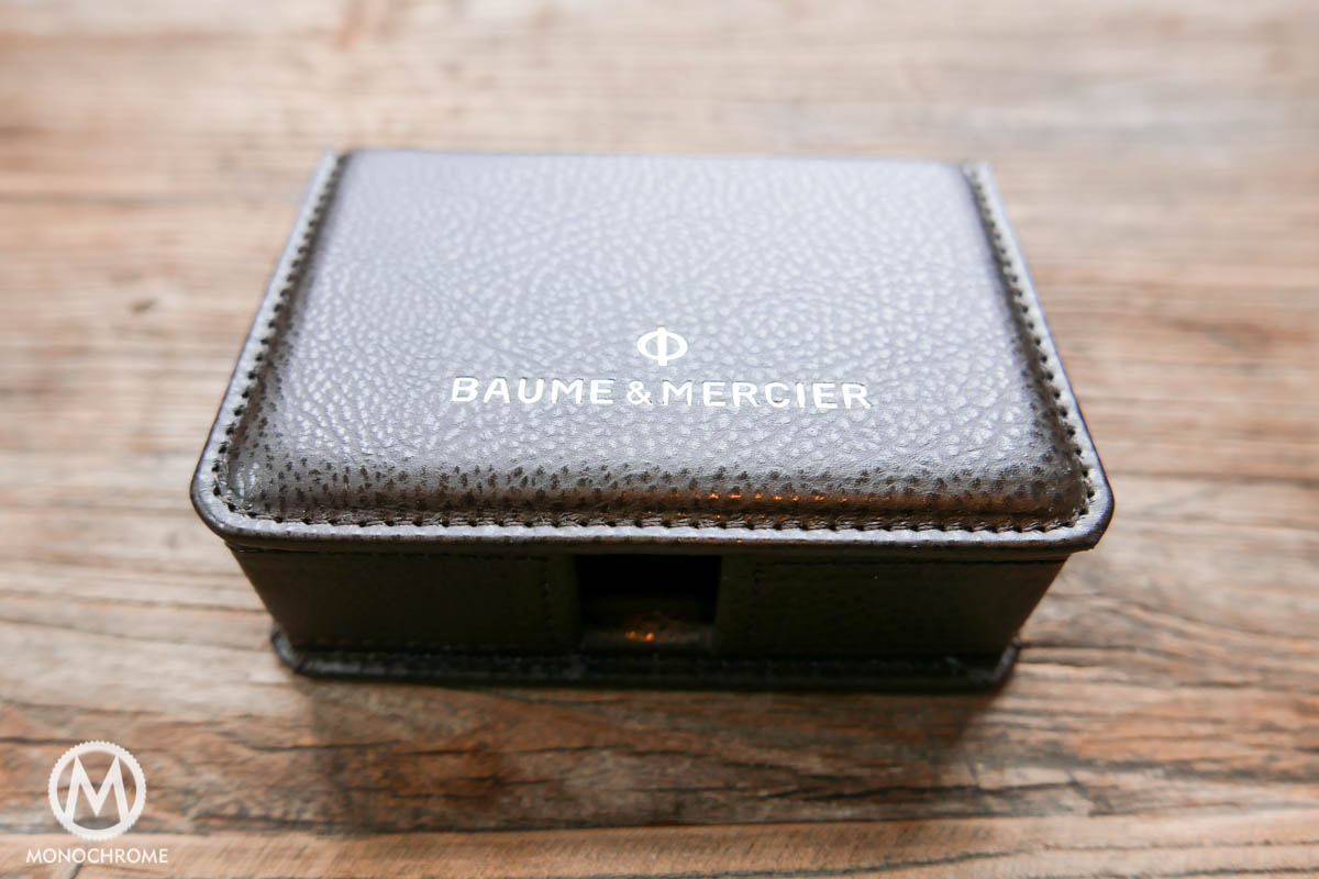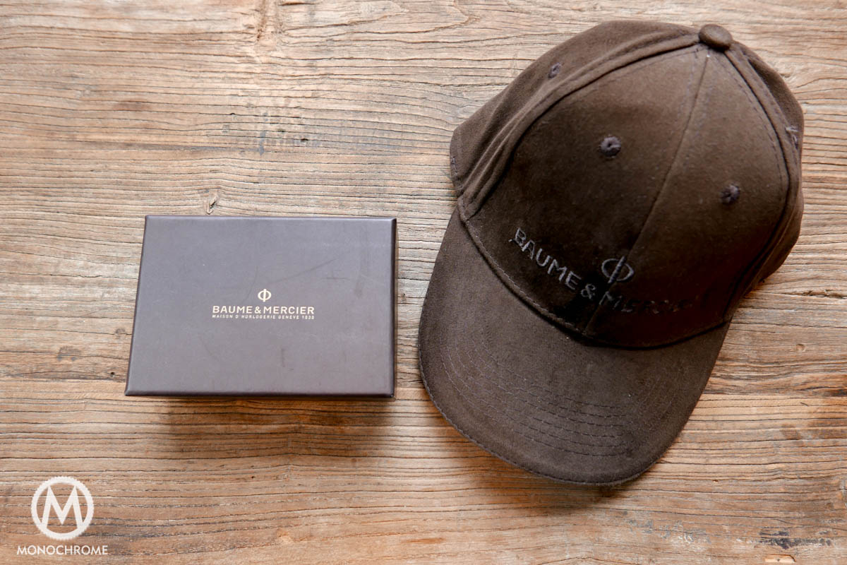 First off… a Baume & Mercier good bag that contains a very nice, high quality, brown Baume & Mercier cap and a leather business card holder for on your desk.