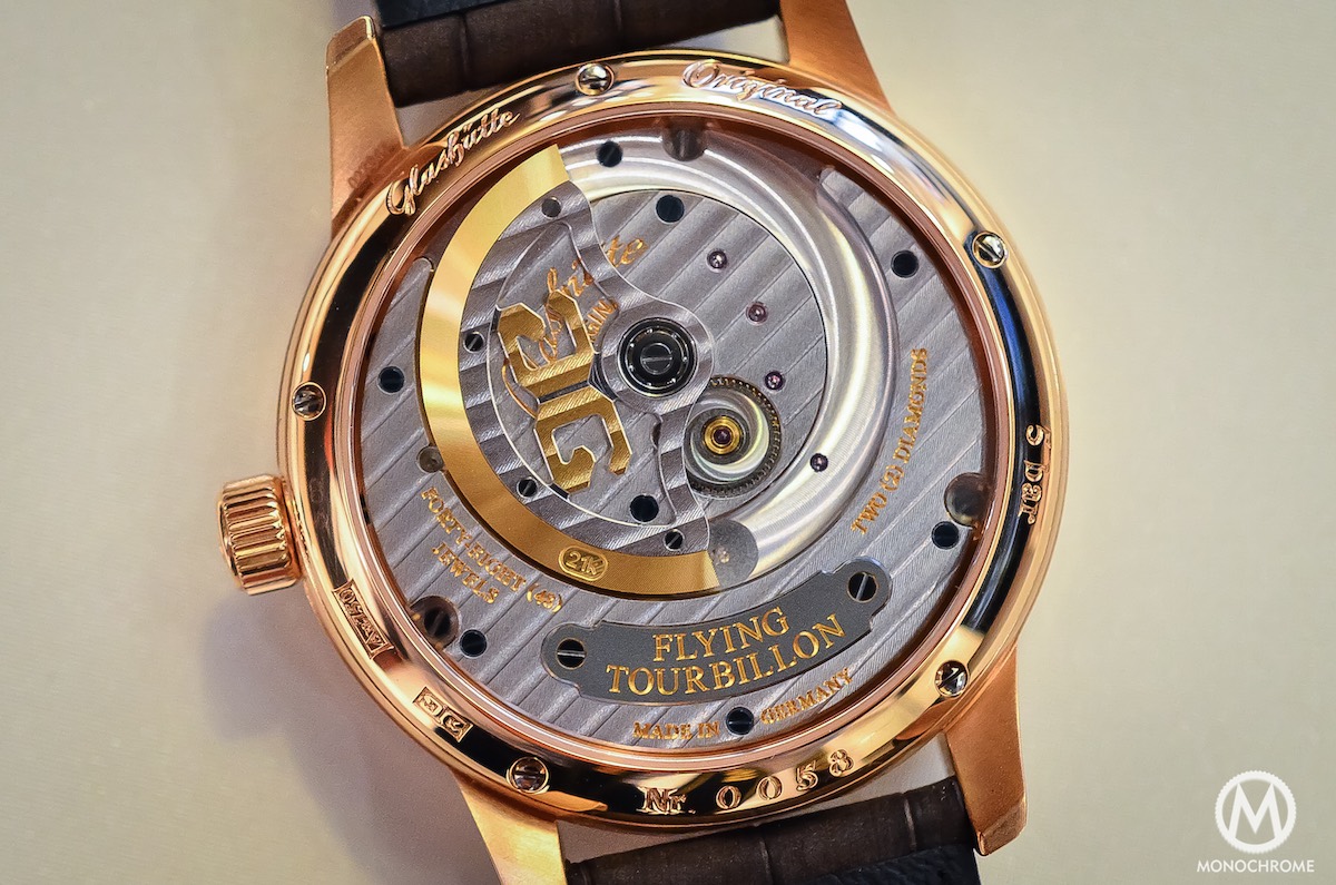 The German watchmaking style, also know as the Glashütte School, has several typical features that Glasütte Original uses with talent: off-centered dials, large date, engraved cock bridge, hand-finishes… Small details that all together creates a very unique and easily recognizable design. We showed you before some watches that are typically Glashütte, such as the brand new Senator Chronograph Panorama Date or the PanoMaticInverse. Those are very interesting and beautiful watches, but the one we have today adds something more, something linked to the history of this manufacture: the Flying Tourbillon. It may be used by multiple manufactures now but it was invented in 1920 by Alfred Helwig, a former student of the German School of Watchmaking in Glashütte and then technical instructor of this same institution.