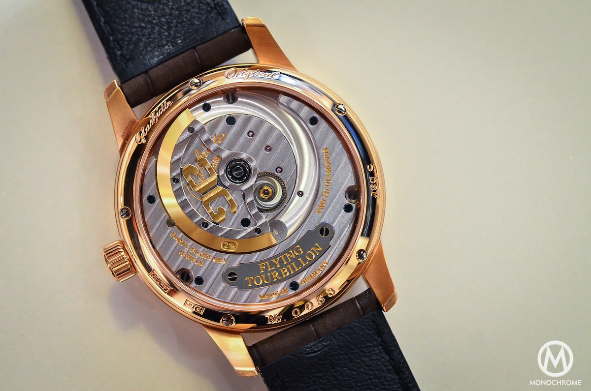 - Additional details: Automatic movement, Flying Tourbillon with second hand, off-centre hour/minute, Panorama Date, moon phase, exquisitely finished movement, bevelled/polished edges, polished steel parts, blued screws, plate with Glashütte stripe finish, skeletonized rotor with 21-ct gold oscillation weight, fine adjustment by regulation screws
